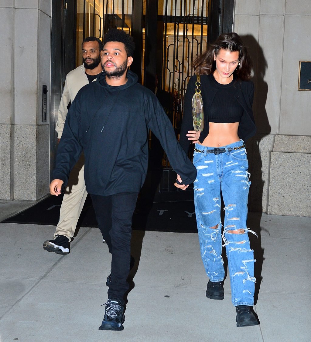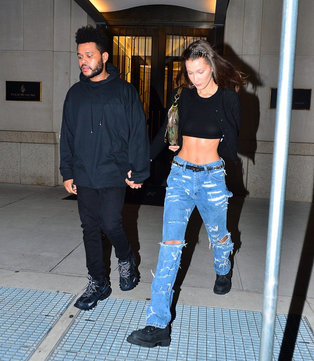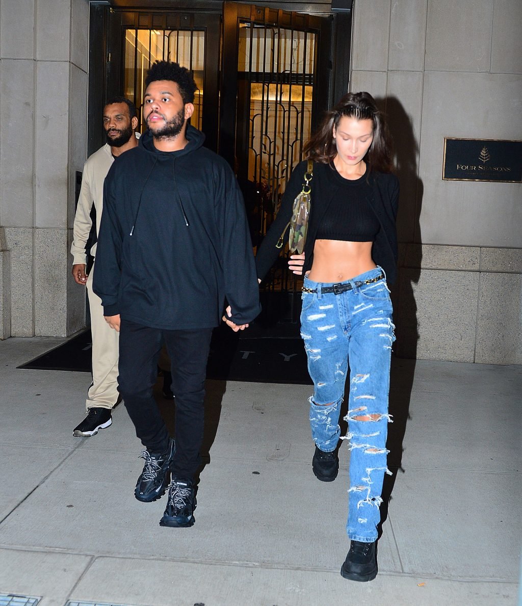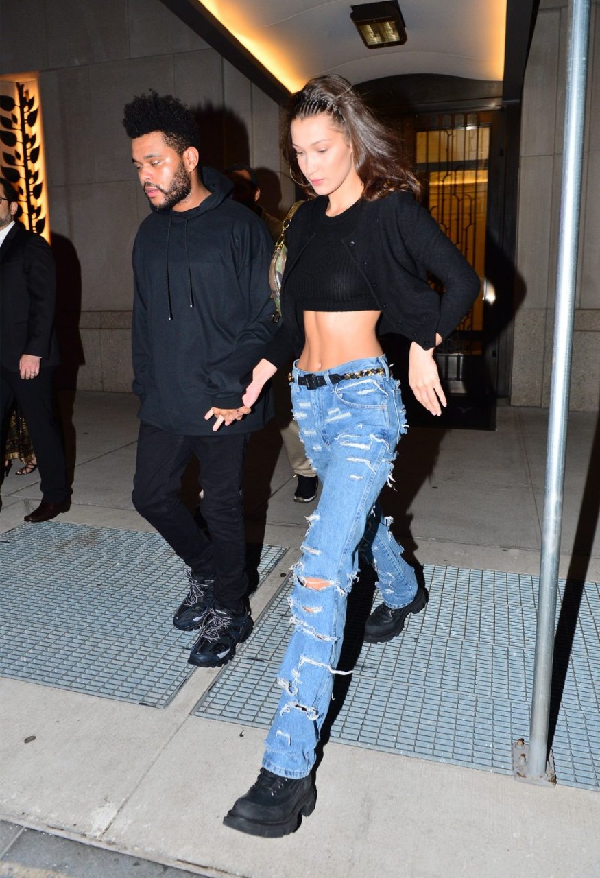 Bella Hadid и The Weeknd идут, держась за руки, на фестиваль Global Citizen в Нью-Йорке, 28.09.2018. 21-летняя модель была в черном топе, который подчеркивал ее стройную талию и пупок.