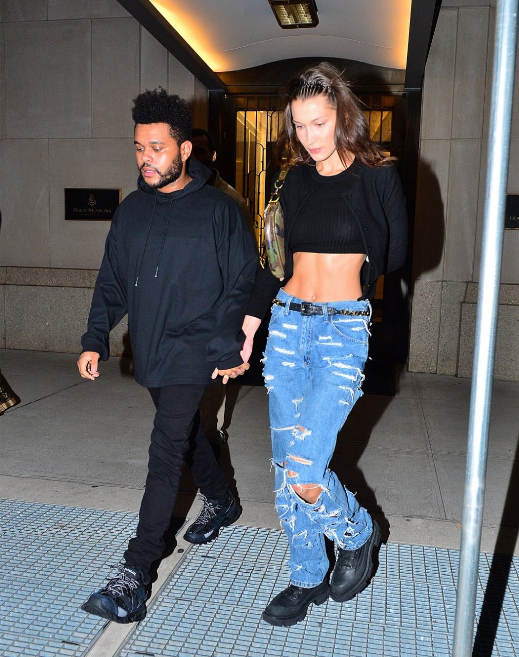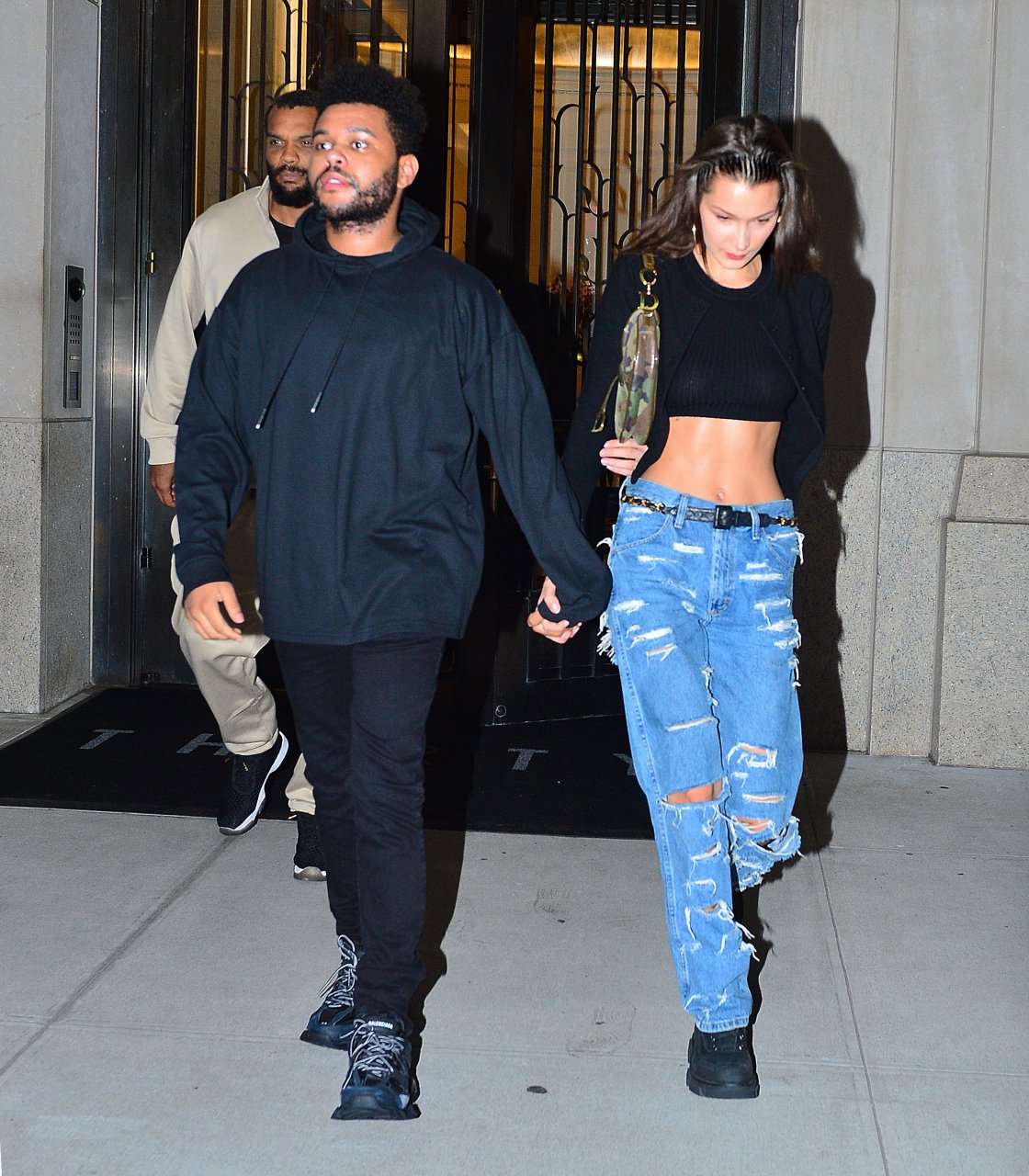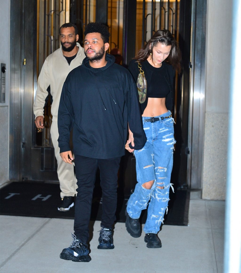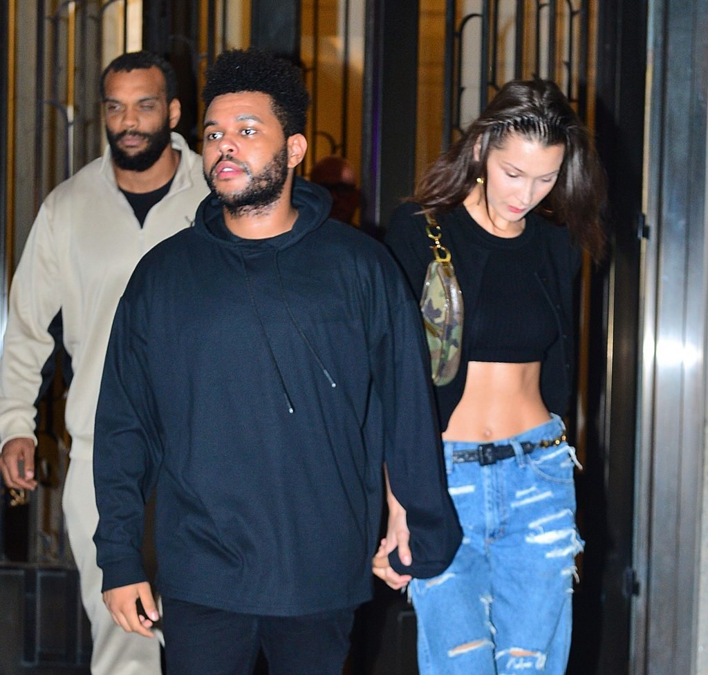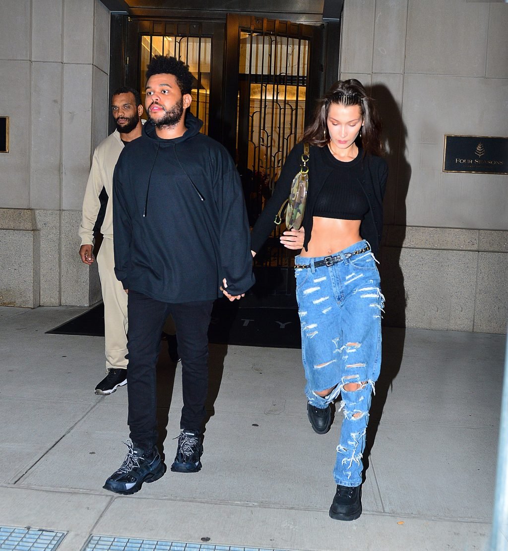 Bella Hadid и The Weeknd идут, держась за руки, на фестиваль Global Citizen в Нью-Йорке, 28.09.2018. 21-летняя модель была в черном топе, который подчеркивал ее стройную талию и пупок.