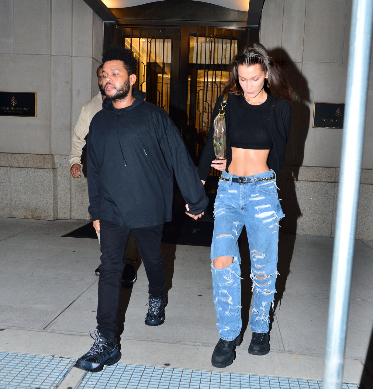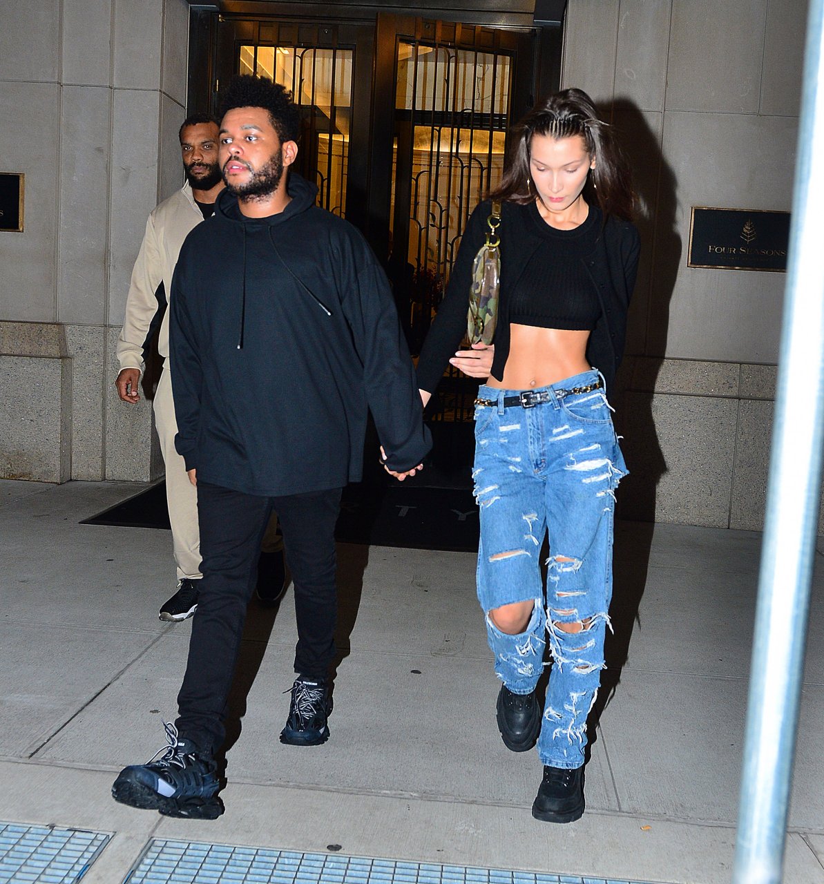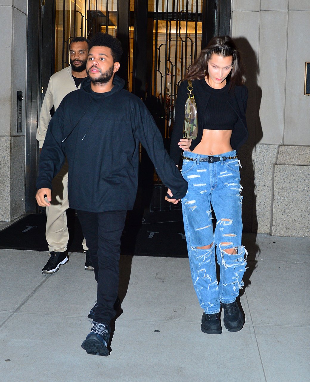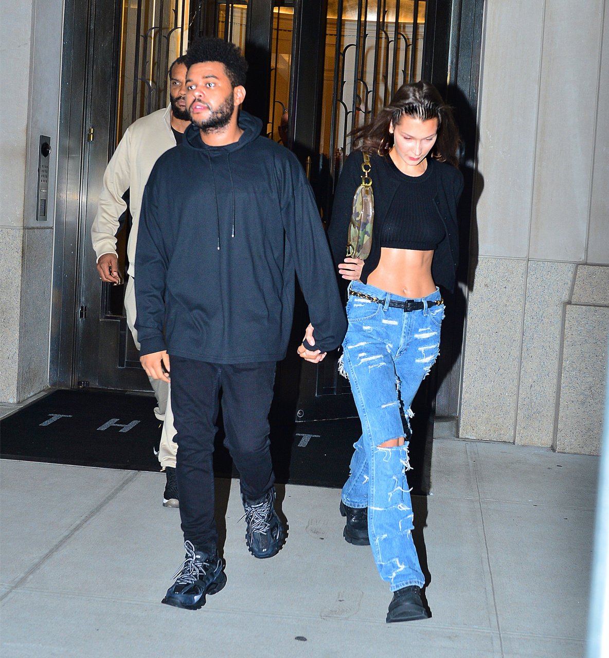 Bella Hadid и The Weeknd идут, держась за руки, на фестиваль Global Citizen в Нью-Йорке, 28.09.2018. 21-летняя модель была в черном топе, который подчеркивал ее стройную талию и пупок.