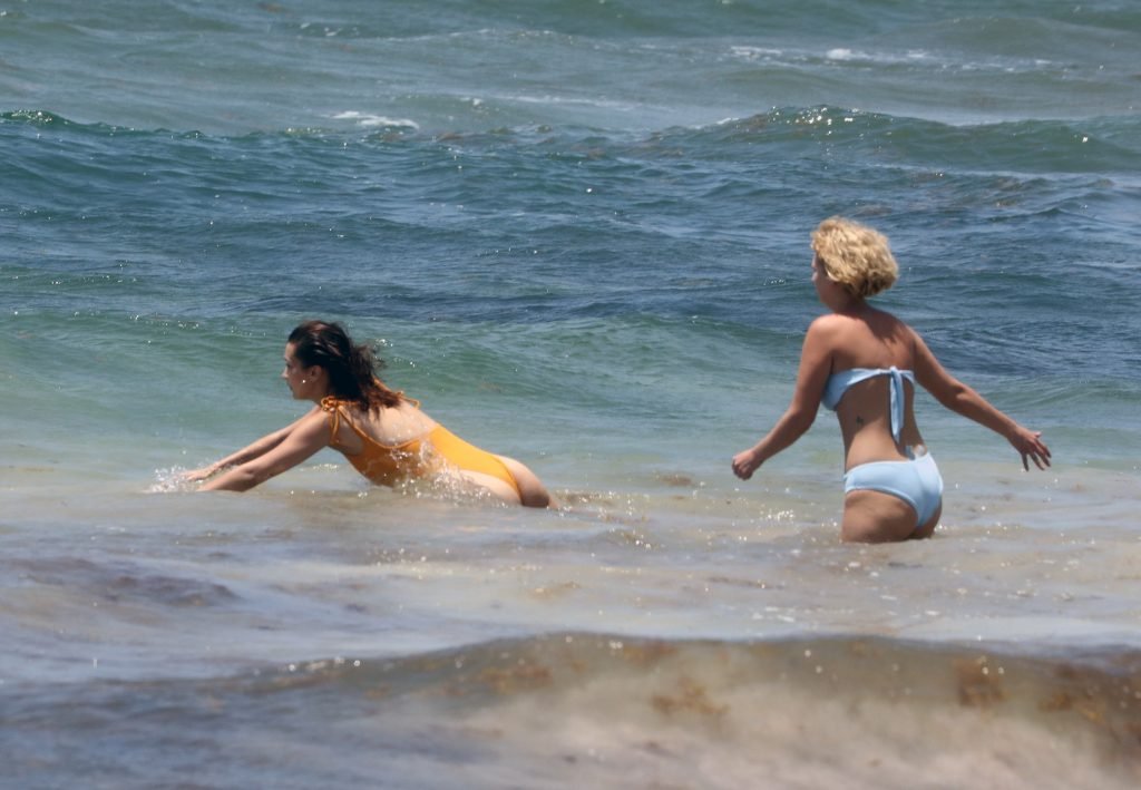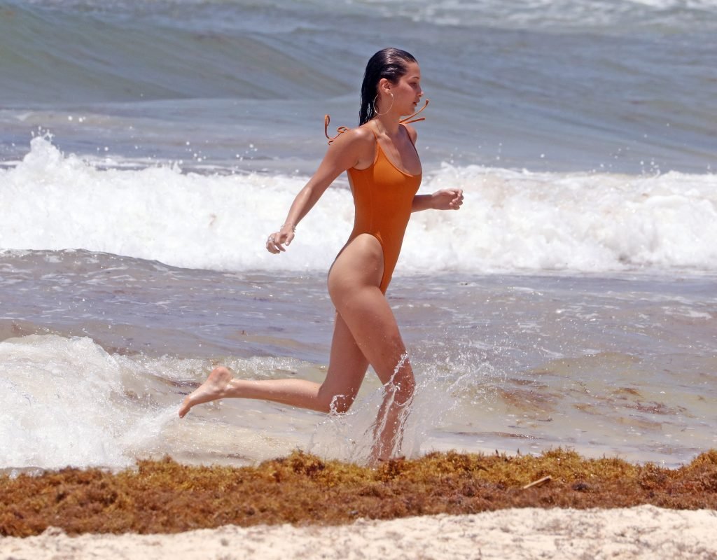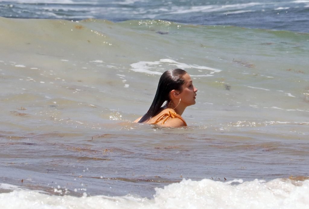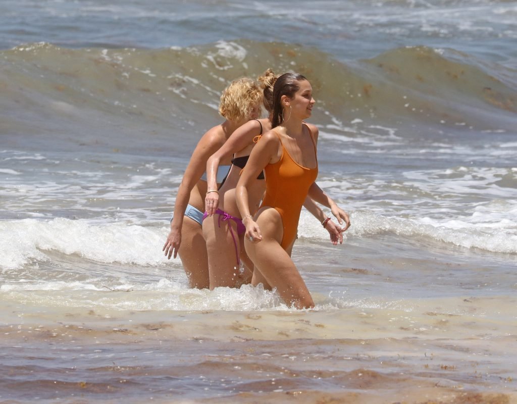 Супермодель и звезда реалити-шоу Белла Хадид демонстрирует своё сексуальное тело в оранжевом бикини на пляже во время отпуска с друзьями в Канкуне, Мексика, 06/06/2018.