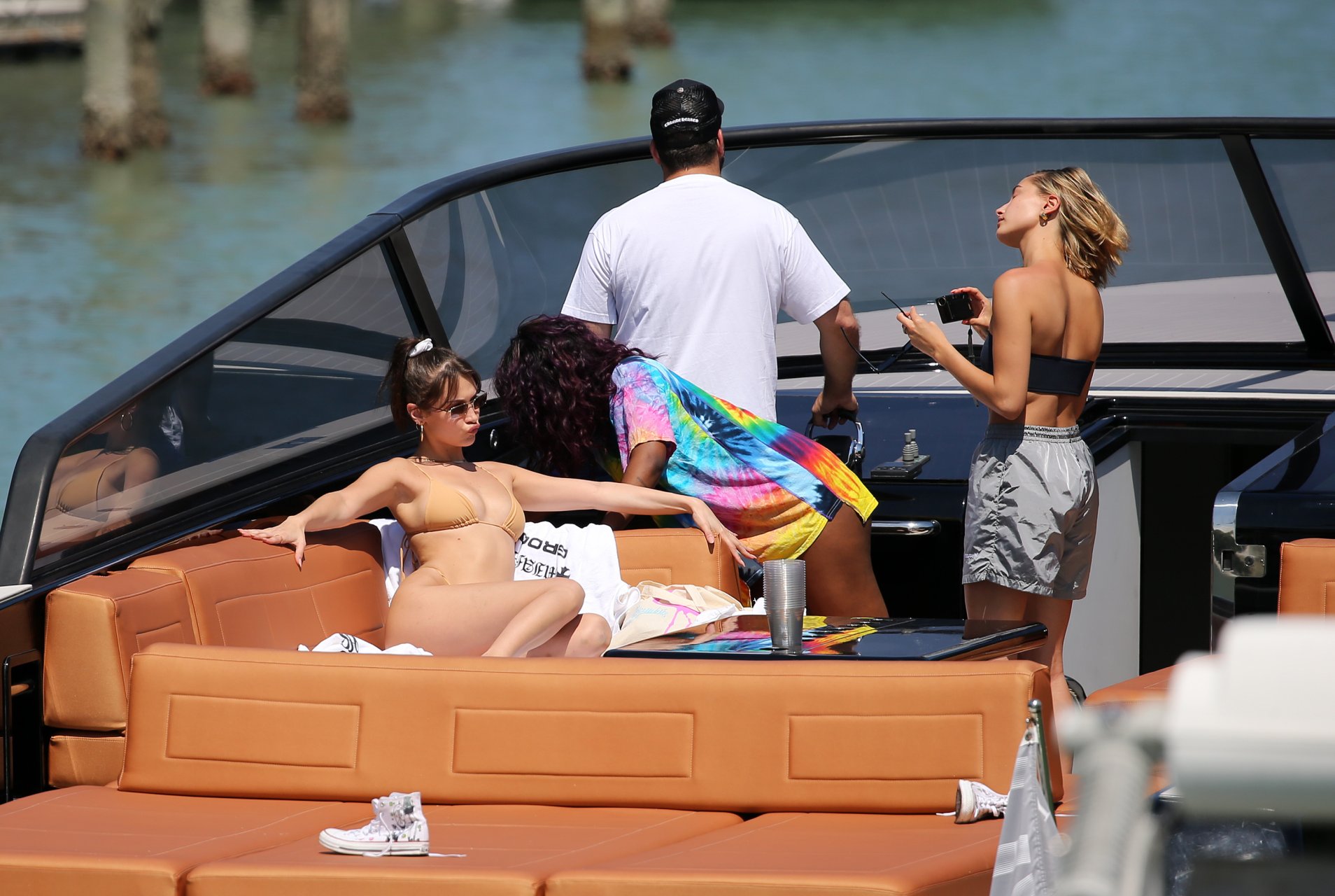 Американская супермодель Белла Хадид (21) была замечена отдыхающей с Хейли Болдуин и Джастином Скай в Майами, 29.04.2018. Море, солнце, лодка и отличная компания — вот всё, что нужно для хороших выходных. Красивые девушки прекрасно провели время.