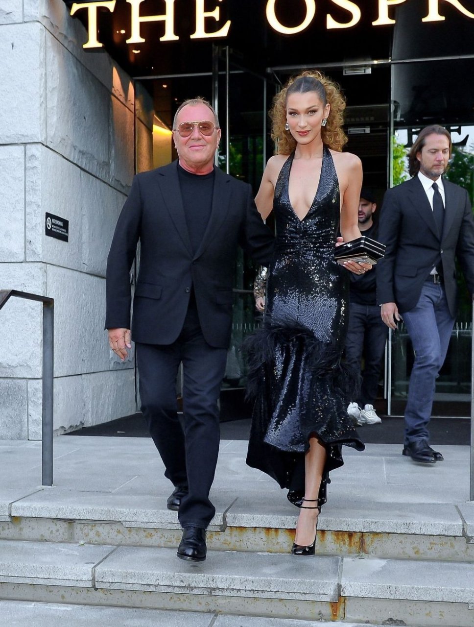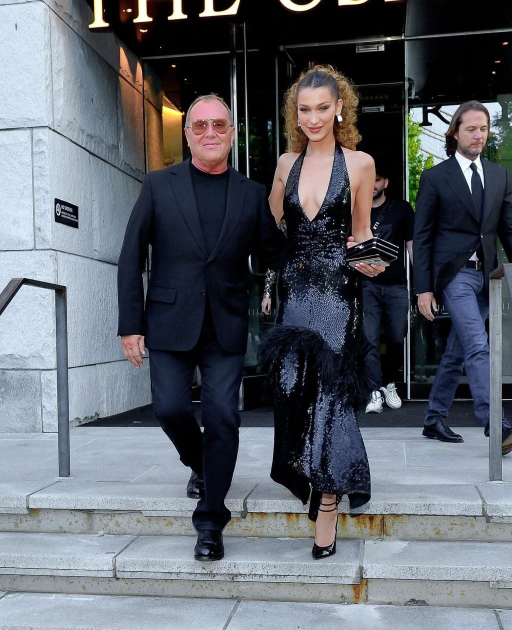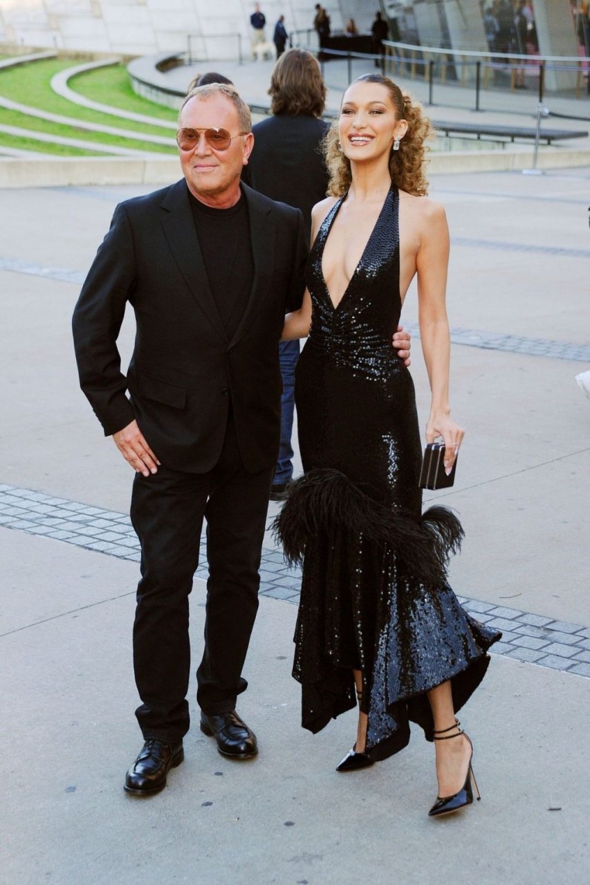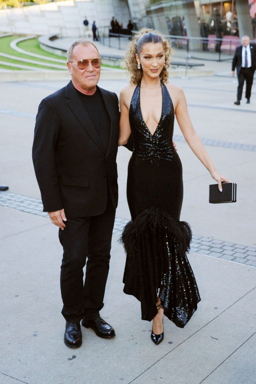 Модель Белла Хадид в платье с глубоким вырезом и блестками на церемонии CFDA Fashion Awards с Майклом Корсом в Нью-Йорке, 03.06.2019.