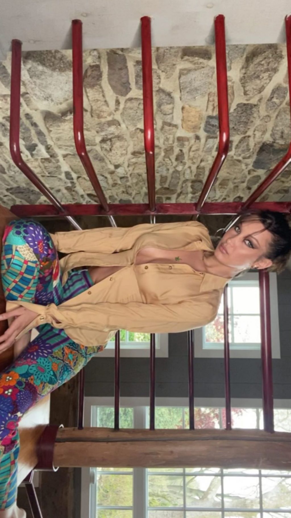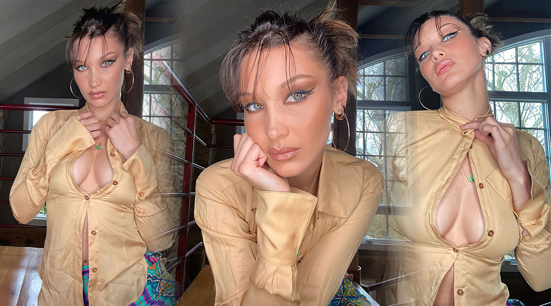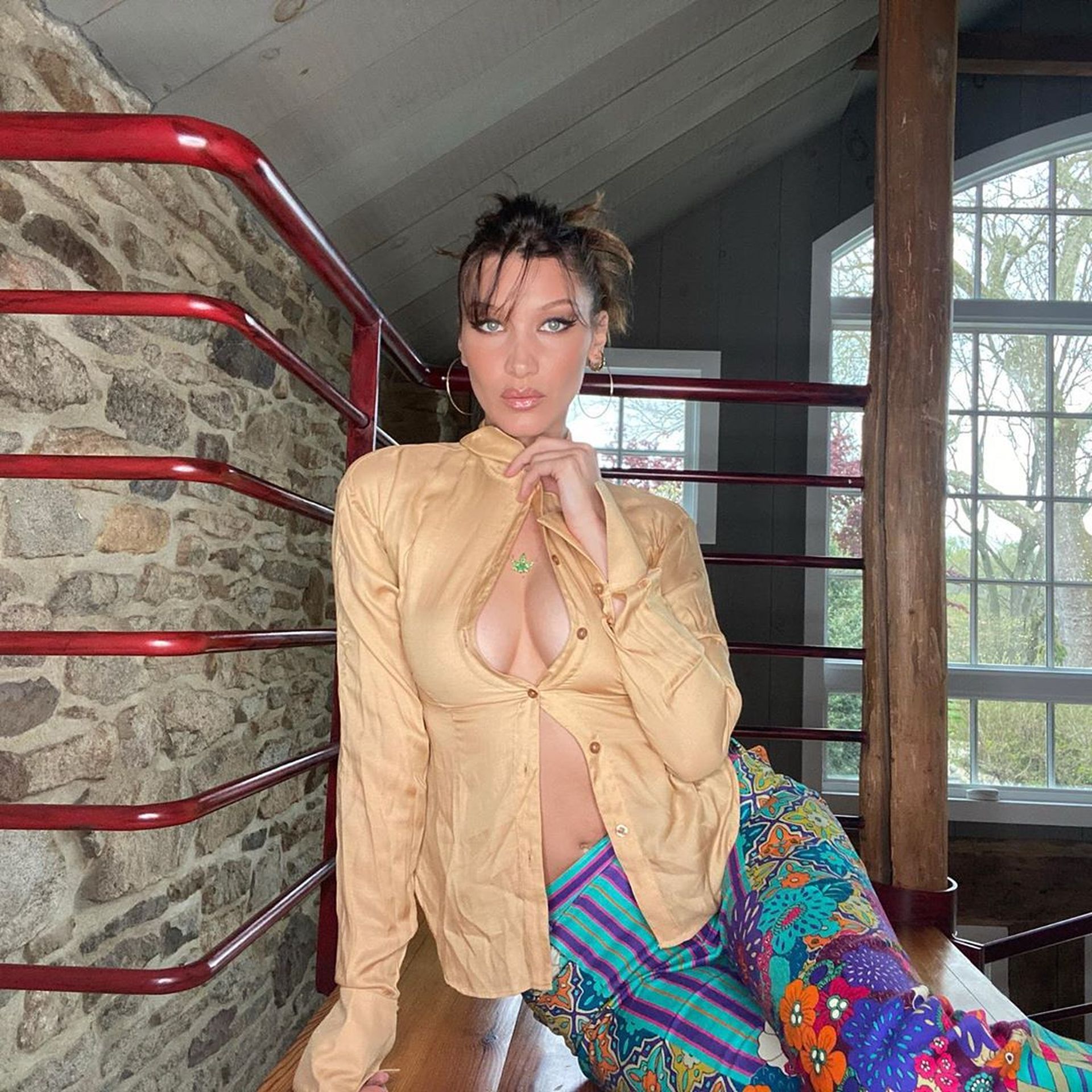 Модель Белла Хадид демонстрирует свое сексуальное декольте в рубашке цвета крем-брюле для горячей фотосессии в Instagram (май 2020).