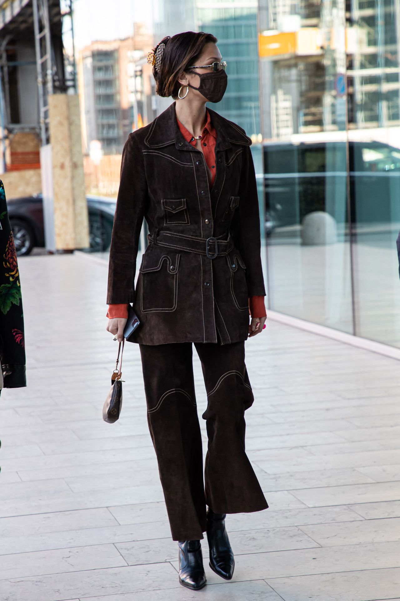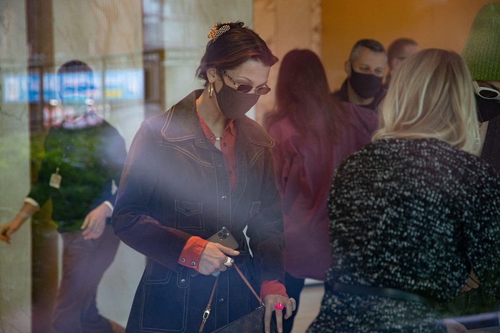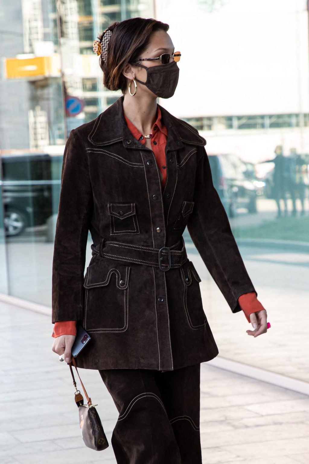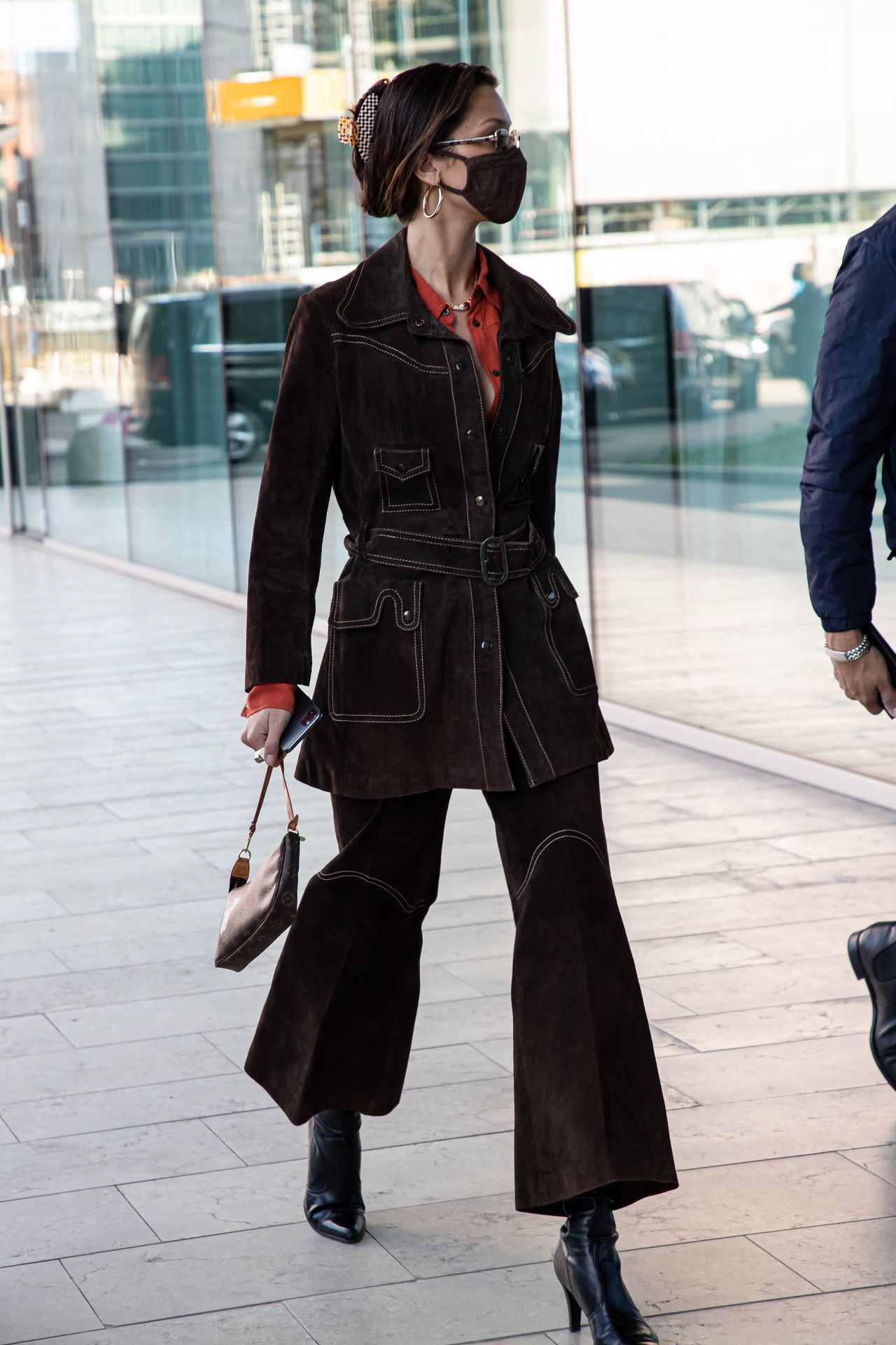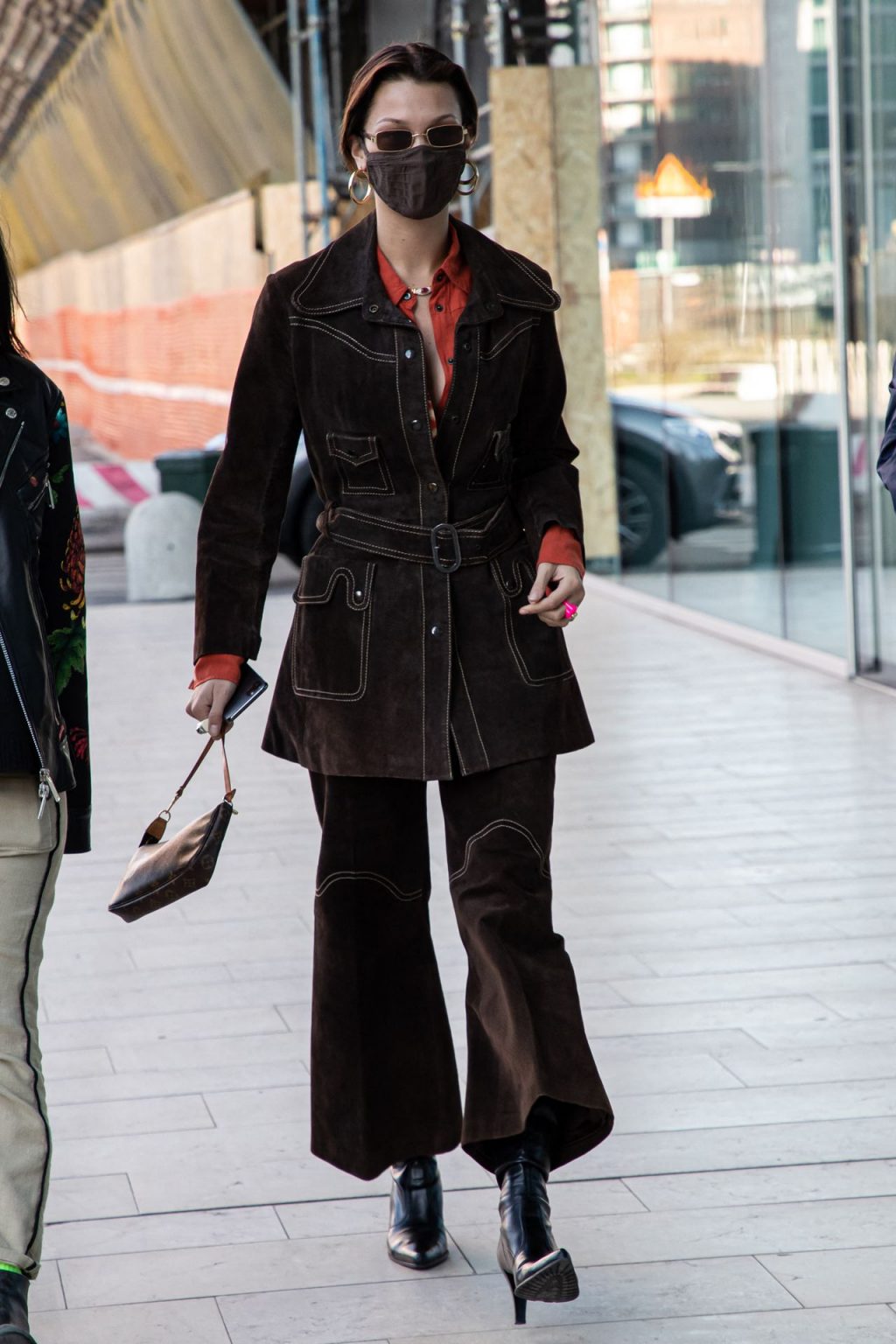 Американская модель Белла Хадид прибывает в штаб-квартиру Versace во время Недели моды в Милане, Милан, Италия, 28.02.2021.
