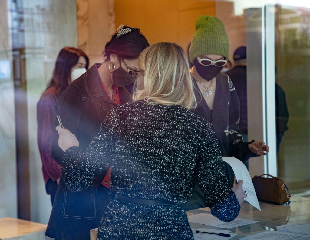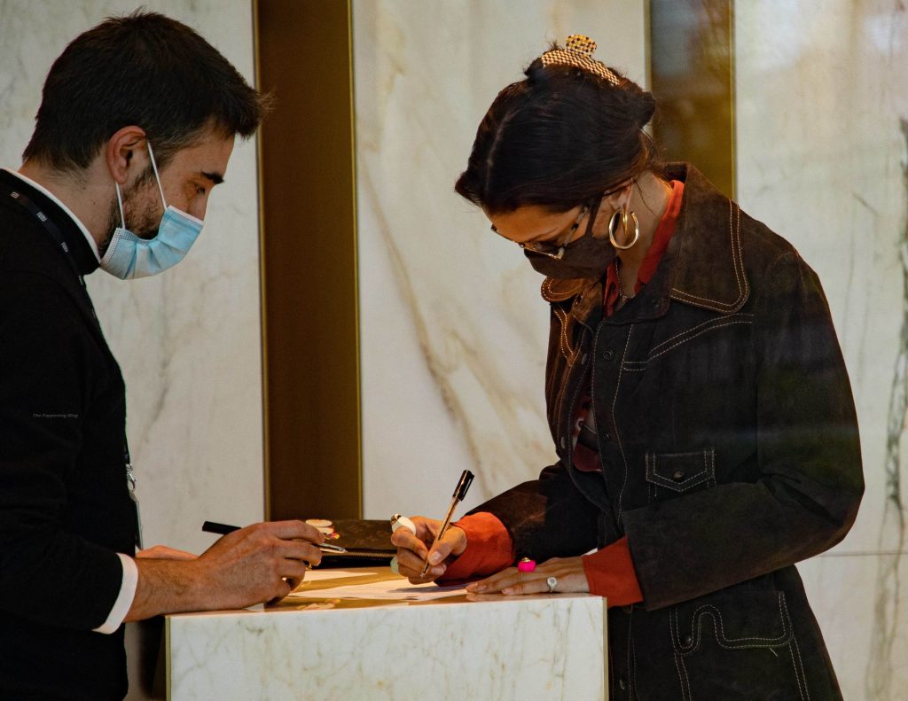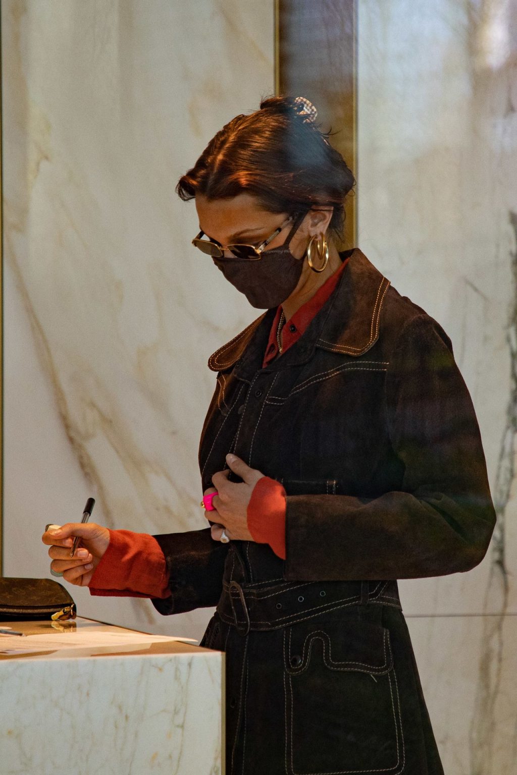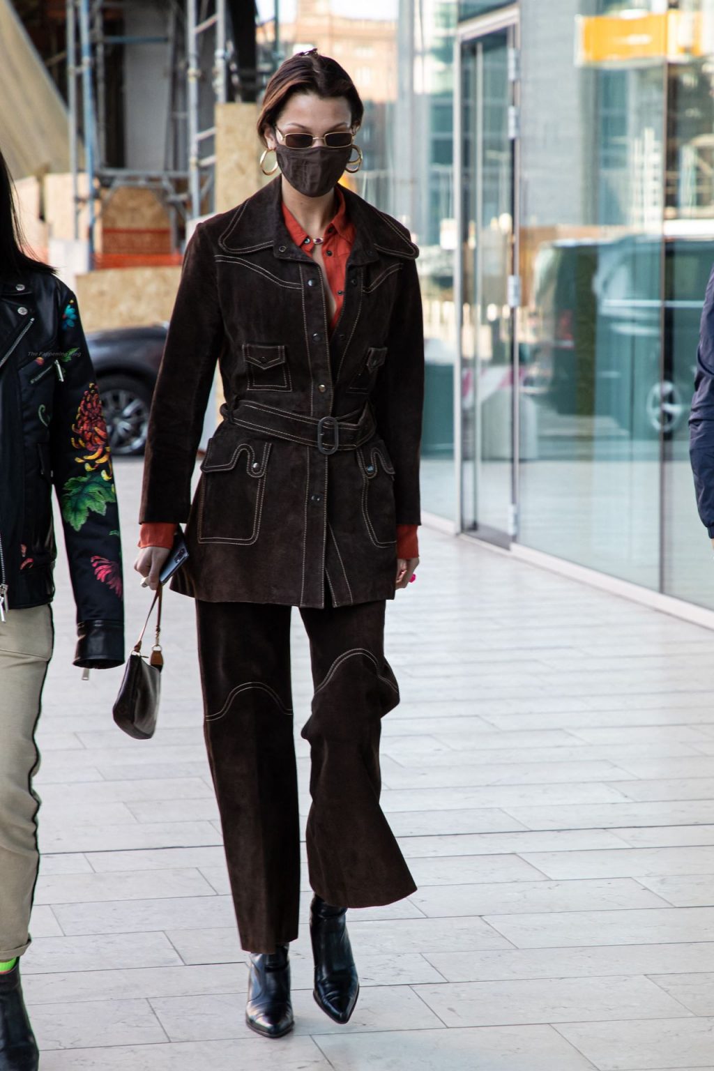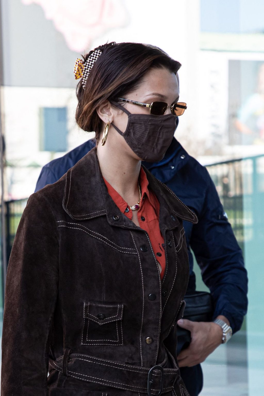 Американская модель Белла Хадид прибывает в штаб-квартиру Versace во время Недели моды в Милане, Милан, Италия, 28.02.2021.