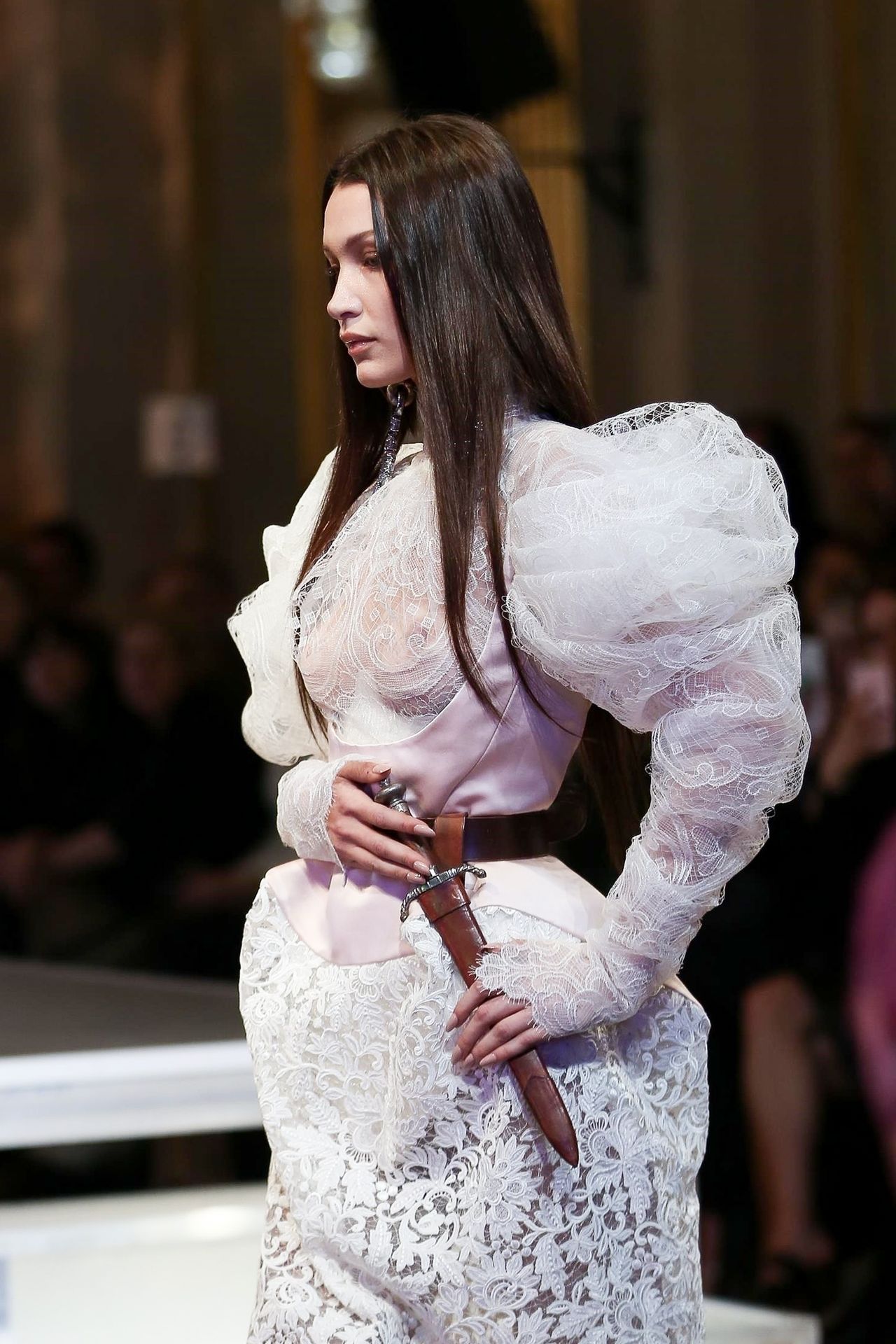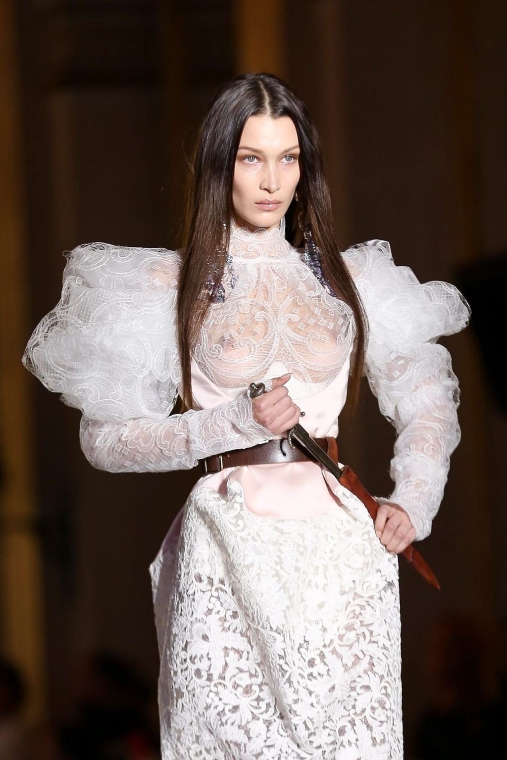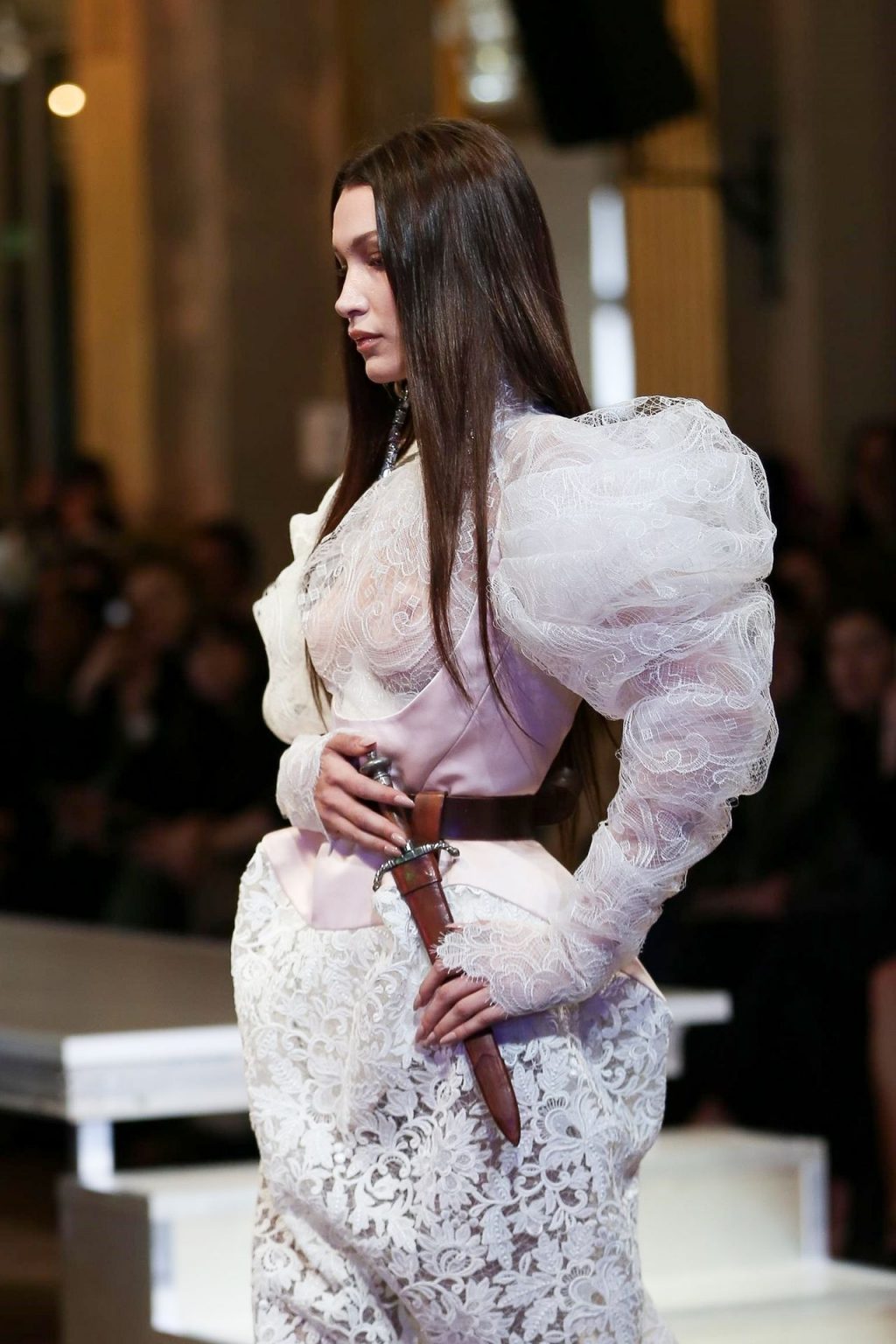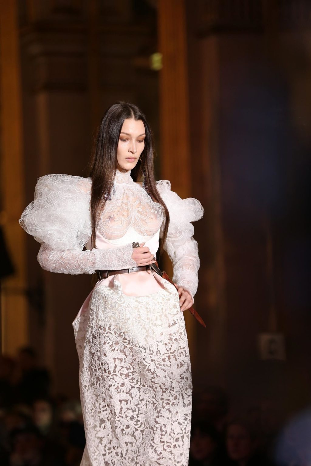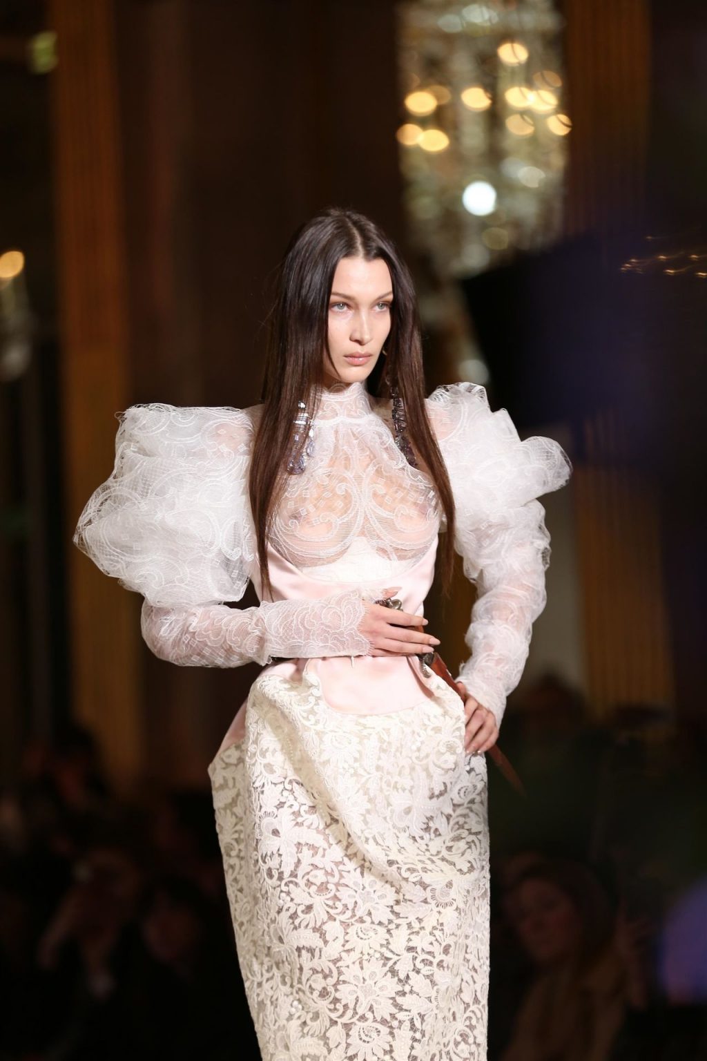 Модель Белла Хадид была замечена без бюстгальтера, выходя на подиум на показе мод Vivienne Westwood во время Недели моды в Париже, 29.02.2020. Белла отрежет тебе яйца, если ты посмотришь на её грудь!