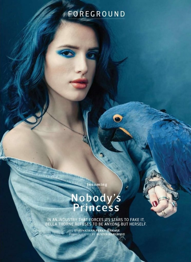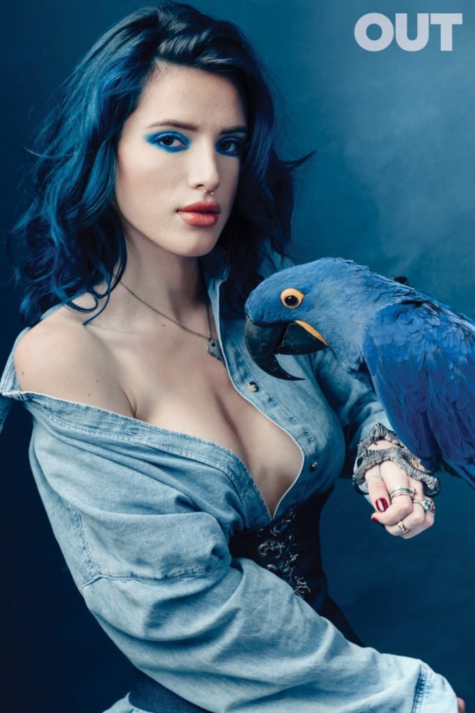 Белла Торн позирует с попугаем для журнала OUT (апрель 2017). Белла Торн — певица, актриса (Shake It Up! (2010)) и танцовщица из Пемброк-Пайнс (Флорида, США). Возраст – 19 лет (8 октября 1997).