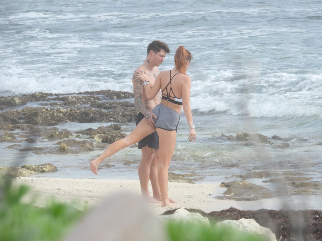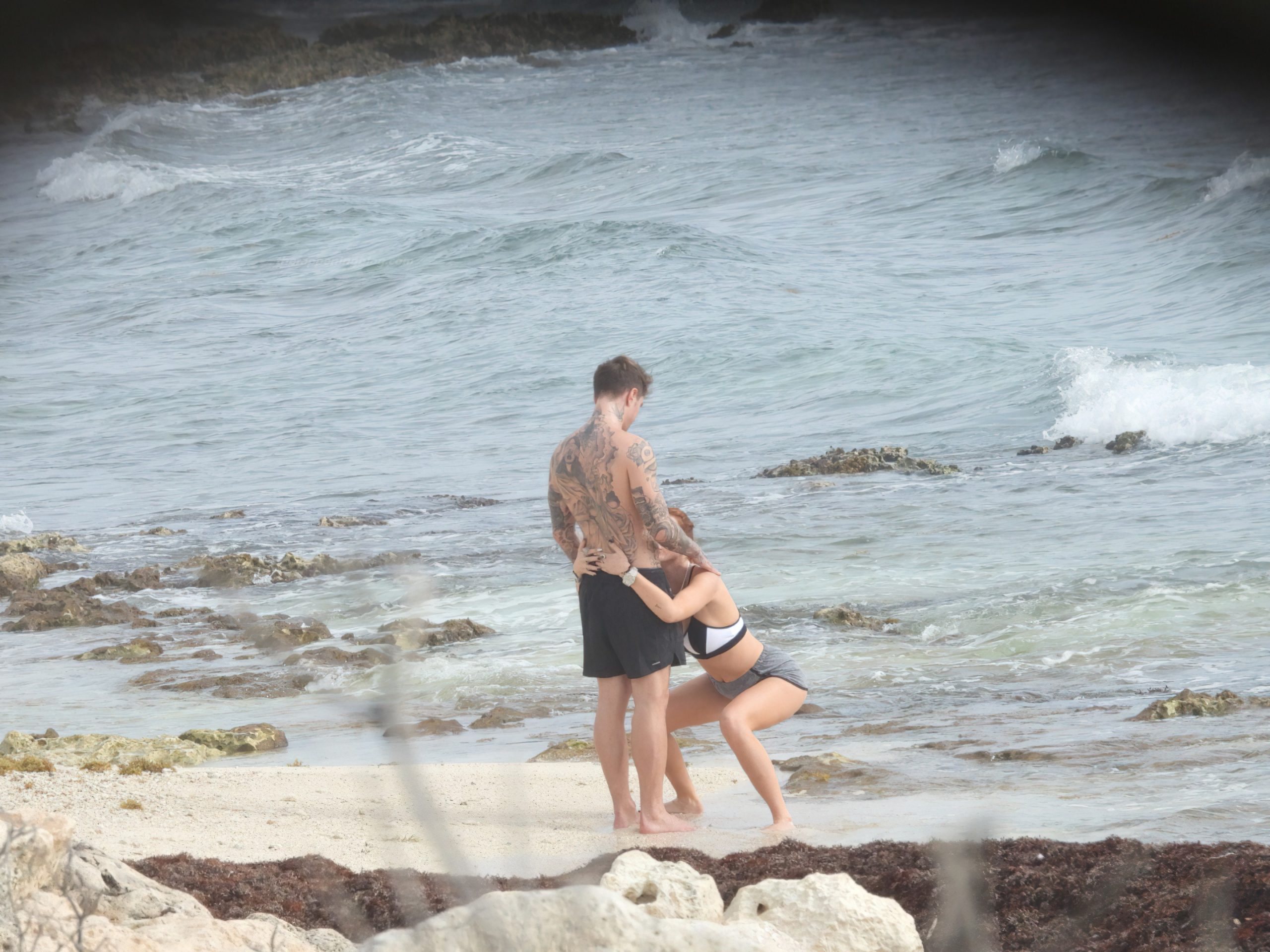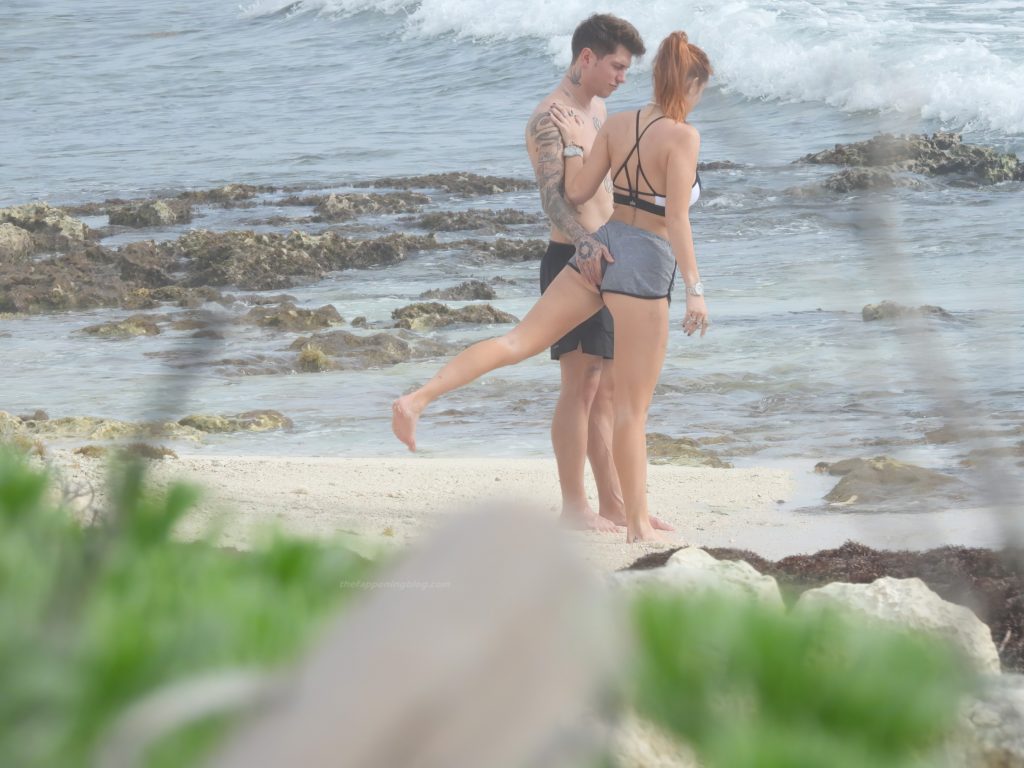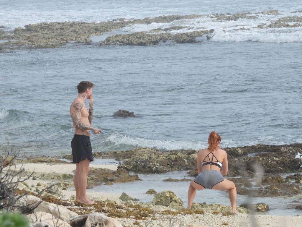 Звезда Фаппенинга, 23 года, была замечена, как она растягивается и занимается на берегу в Тулуме, Мексика, в откровенном топе-бра и шортах.