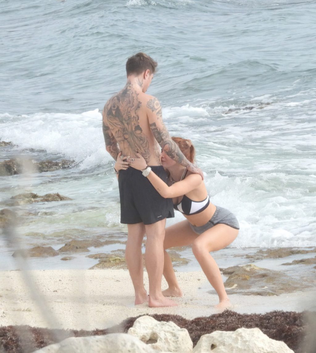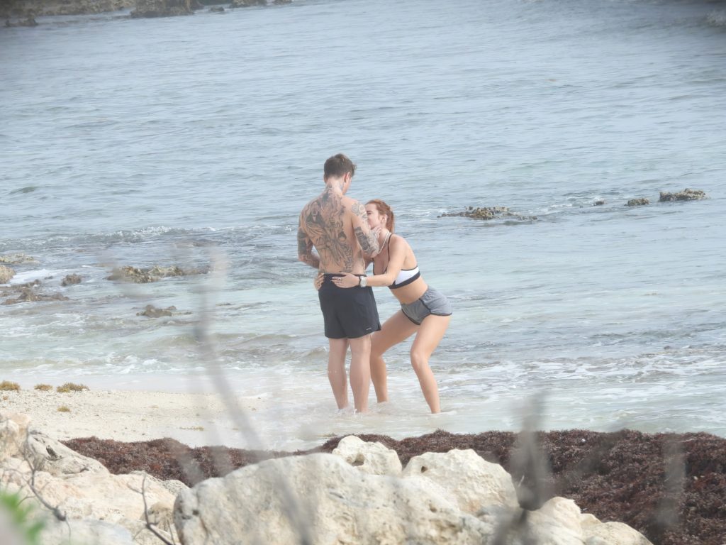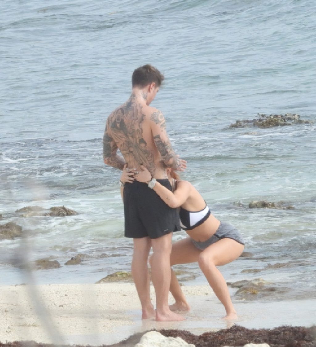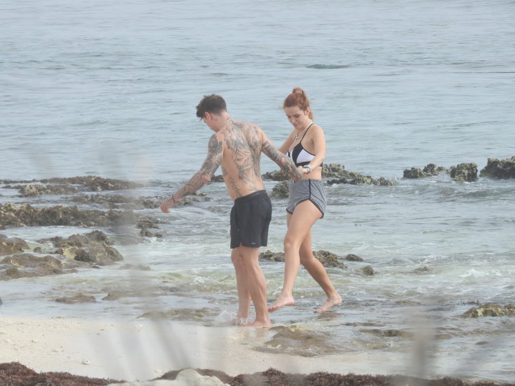 Звезда Фаппенинга, 23 года, была замечена, как она растягивается и занимается на берегу в Тулуме, Мексика, в откровенном топе-бра и шортах.