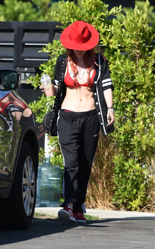 Белла Торн носит красный бюстгальтер в Лос-Анджелесе, 28.08.2017. Белла Эйвери Торн — американская актриса и певица. Она родилась во Флориде, США. Возраст: 19 лет.