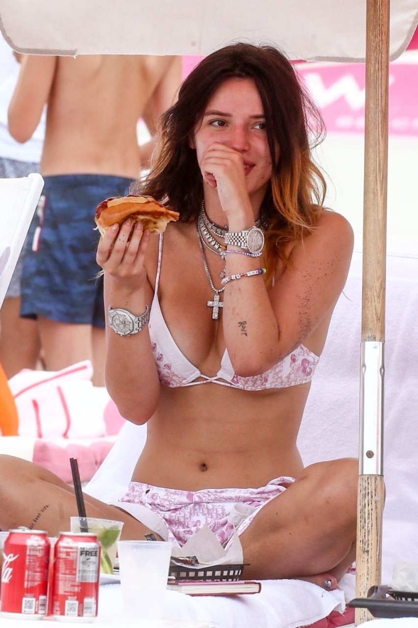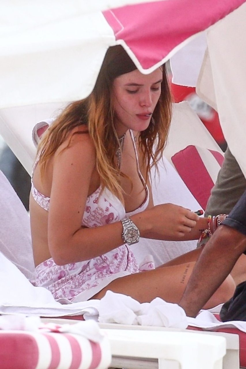 Bella Thorne получает несколько царапин, пытаясь вытащить свою собаку из воды в Майами, 07.08.2019. Актриса и певица носит розовый купальник Dior во время отдыха с друзьями. Она приходит на пляж со своей собственной книгой.