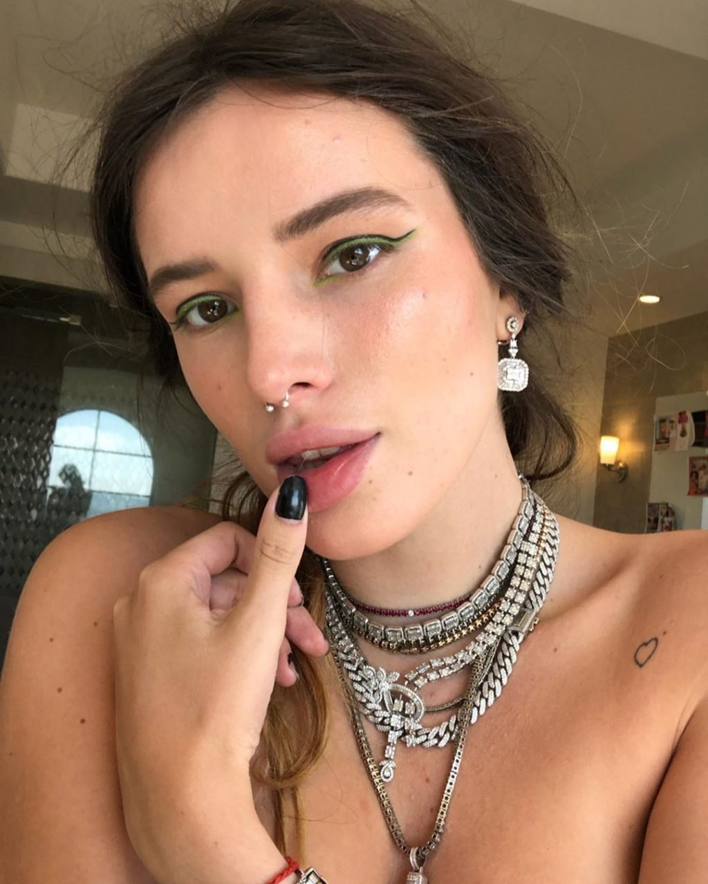 Белла Торн поделилась сексуальными и обнаженными (прикрытыми) фотографиями для своих 21,5 млн подписчиков в Instagram (сентябрь-октябрь 2019). Она показала свои груди в синем бикини, сделала несколько топлесс селфи и провела день с возлюбленным в постели.