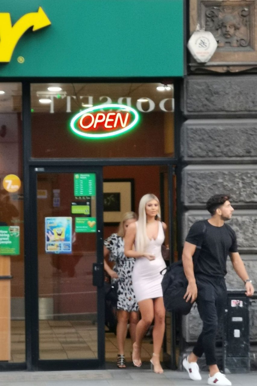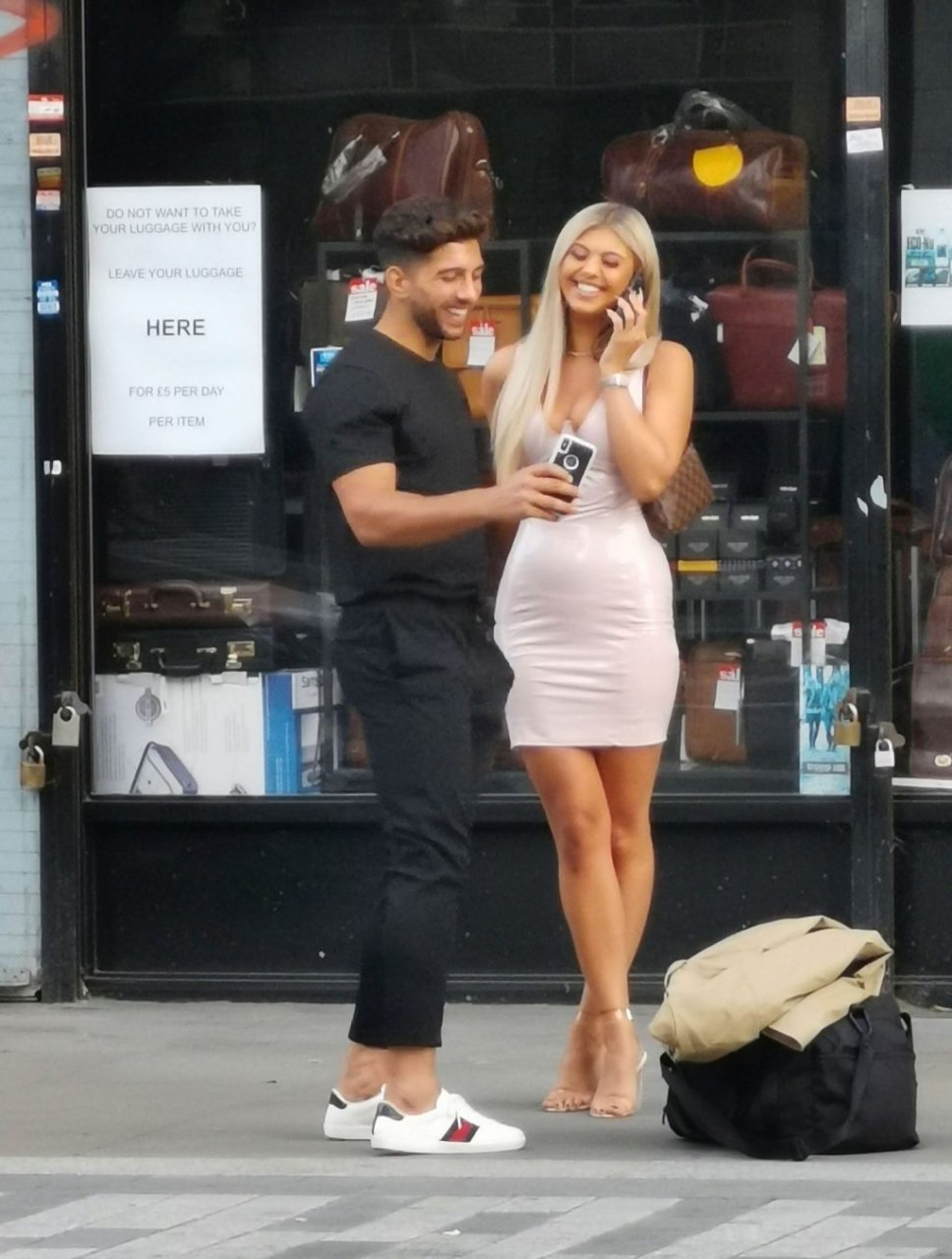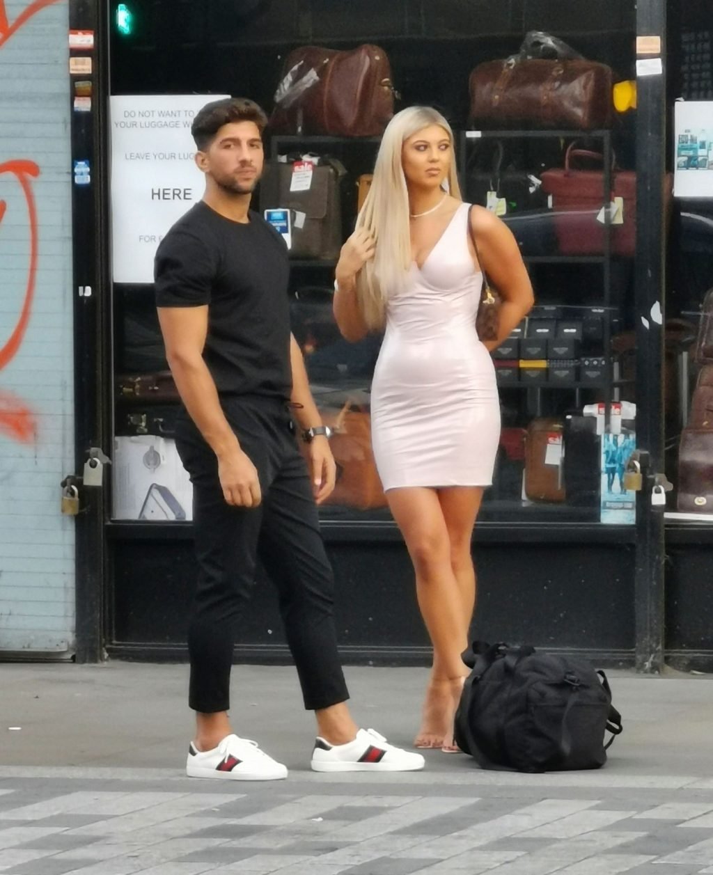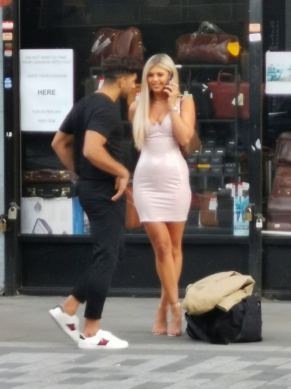 Белль пришлось вызвать помощь, чтобы зашить спинку платья, и она зашла в ресторан, чтобы починить платье, но вышла оттуда с улыбкой, в компании коллеги по Love Island Марвина Брукса.