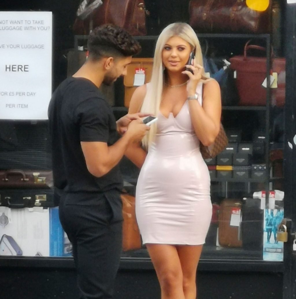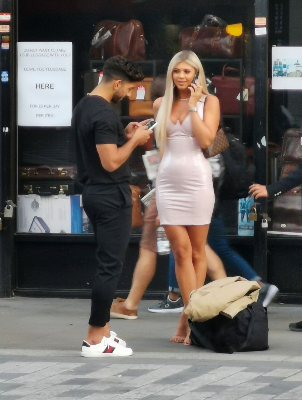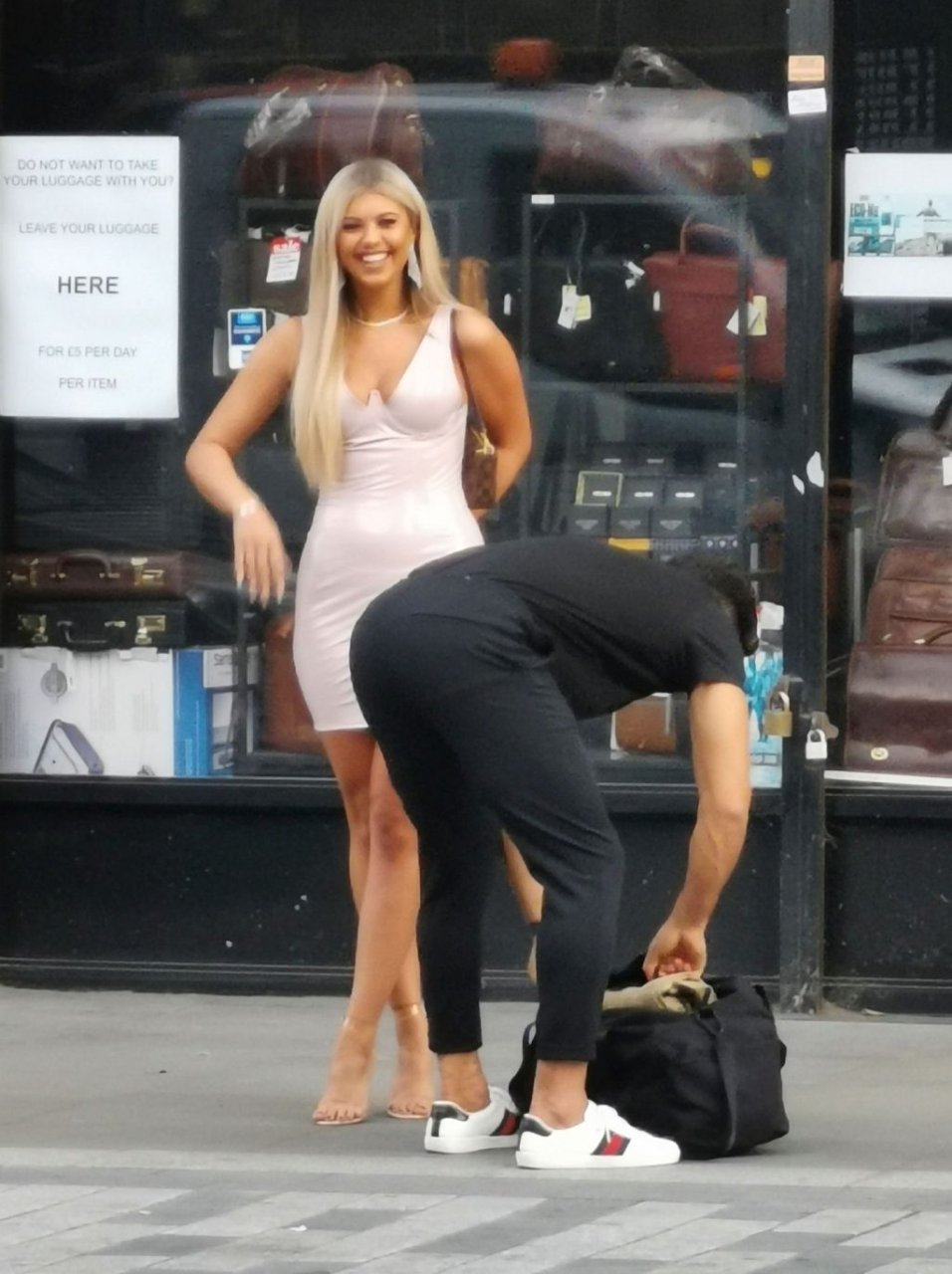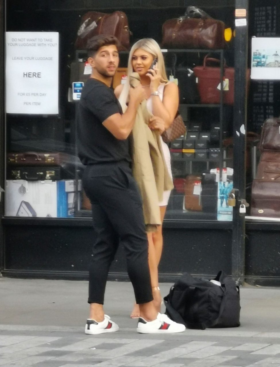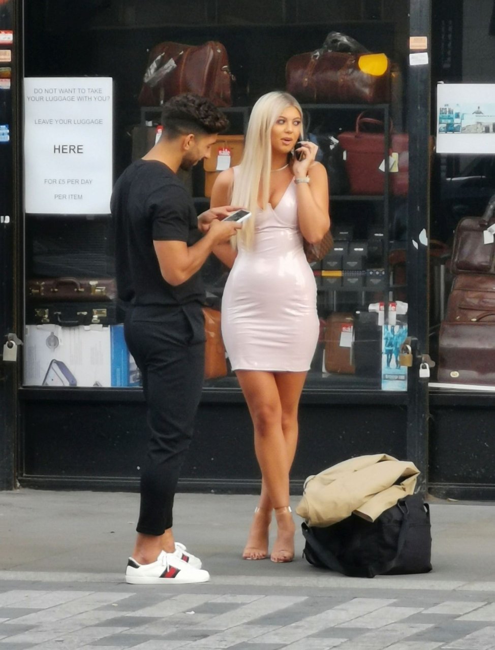 Белль пришлось вызвать помощь, чтобы зашить спинку платья, и она зашла в ресторан, чтобы починить платье, но вышла оттуда с улыбкой, в компании коллеги по Love Island Марвина Брукса.