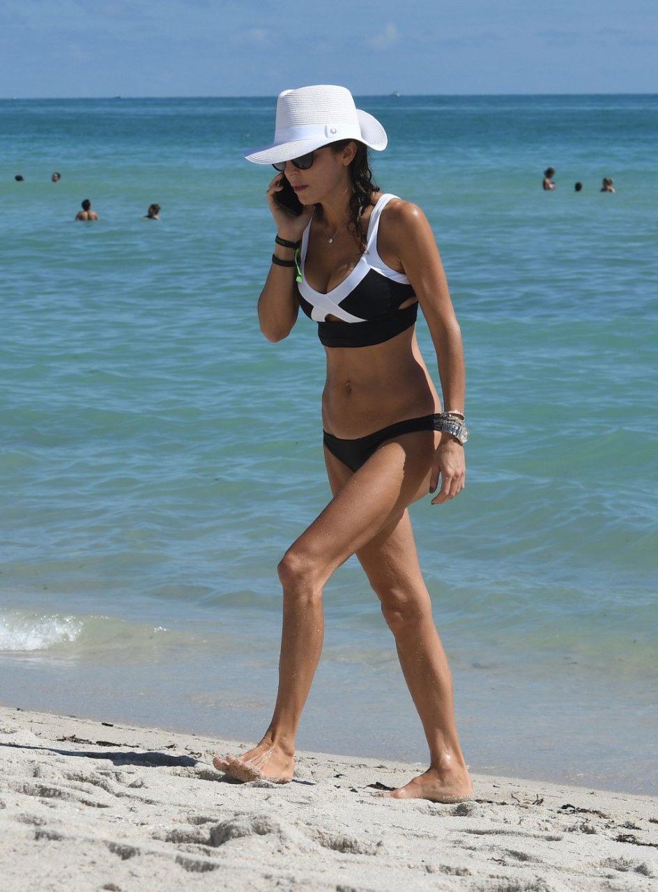 Американская звезда телевидения Бетенни Франкел (47) в черно-белом бикини на пляже в Майами, 20.10.2018.