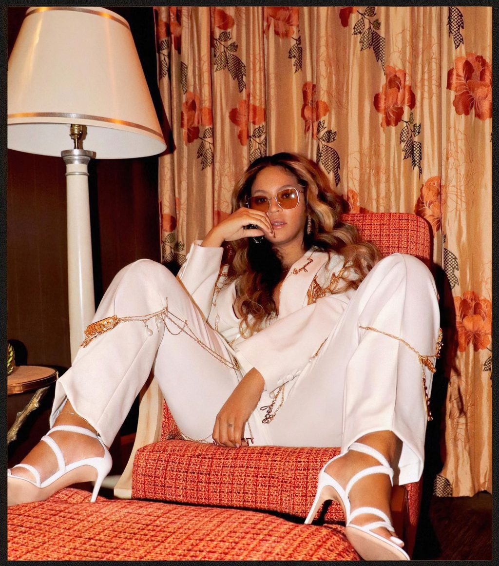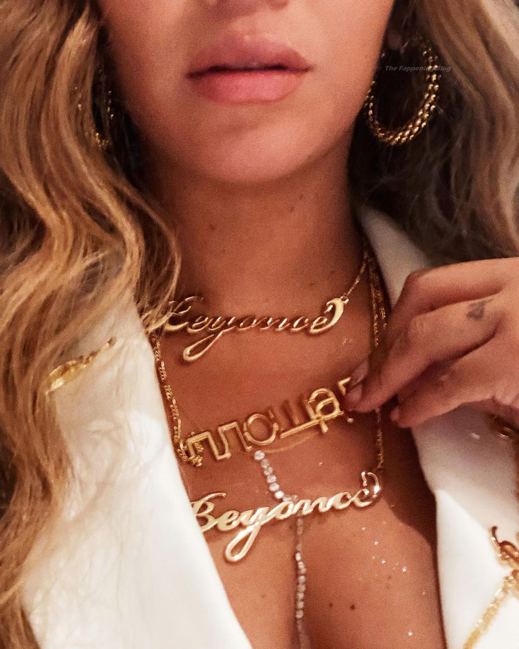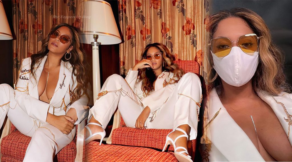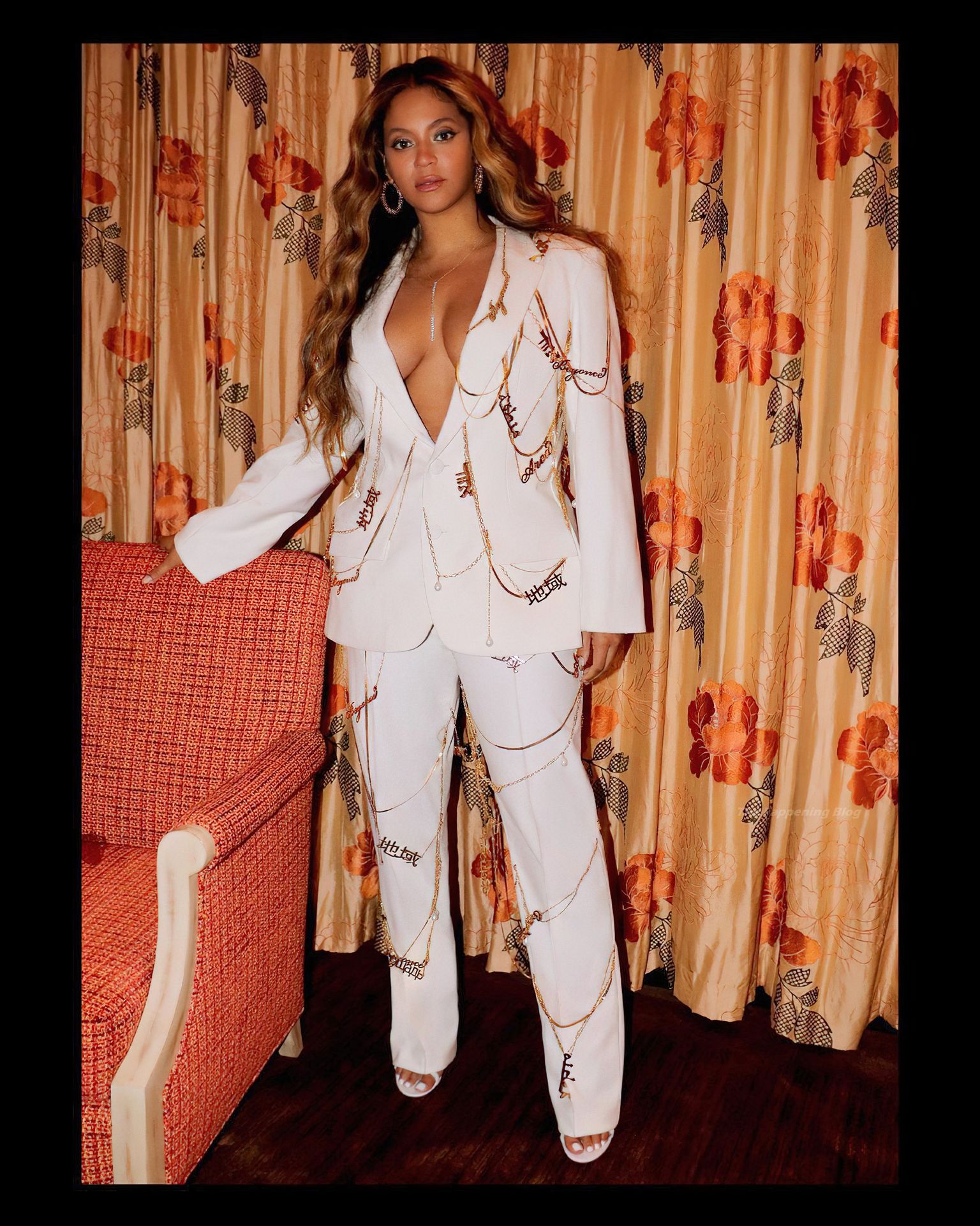 Певица Бейонсе демонстрирует своё красивое декольте и украшения, позируя без бюстгальтера в белом костюме-брюках в новой фотосессии для социальных сетей (апрель 2021).