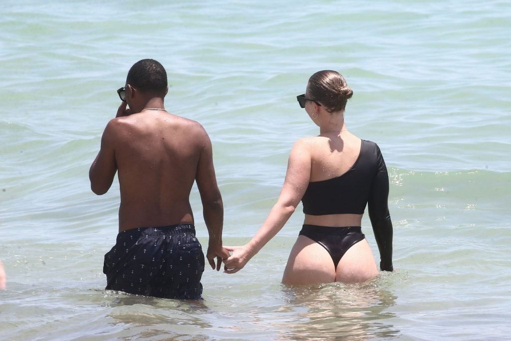 Модель в бикини Бьянка Элуиз выходит на пляж со своим парнем, чтобы позагорать в расслабленный день – Майами, 15.08.2019. Бьянка блистала в черном двухсекционном купальнике и охлаждала свои сексуальные изгибы в воде.