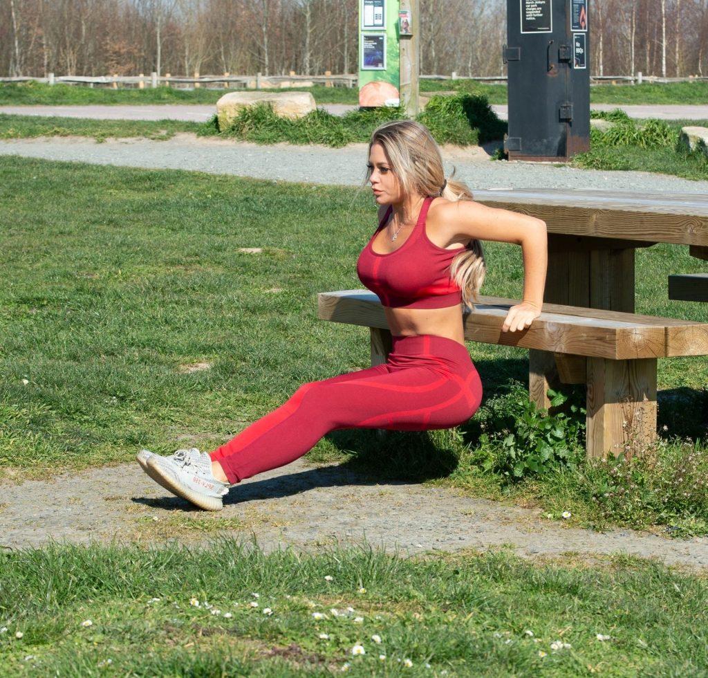 Финалистка шоу “Celebrity Big Brother” демонстрирует свою улучшенную грудь и ягодицы в красном укороченном топе и леггинсах. Бьянка, дочь футболиста Пола Гаскойна, показывает свои потрясающие пресс, следуя рекомендациям правительства заниматься спортом по 1 часу в день.