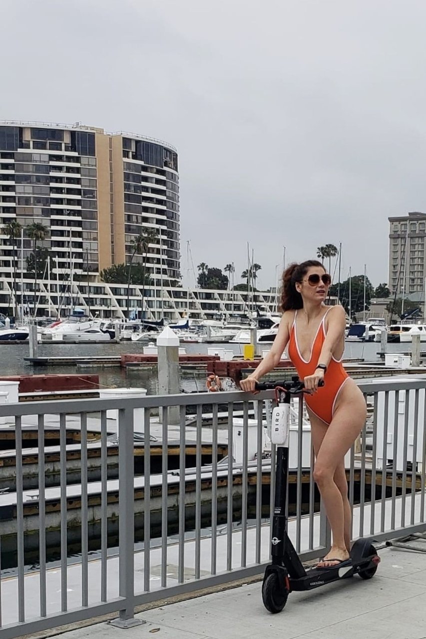 Актриса Бланка Бланко демонстрирует свое подтянутое тело в оранжевом купальнике, катаясь на самокате в Лос-Анджелесе, 21.06.2019.