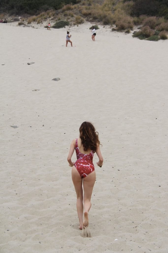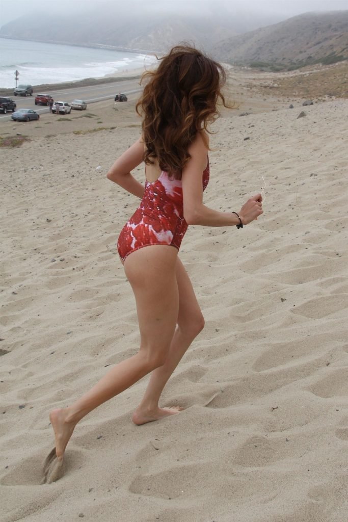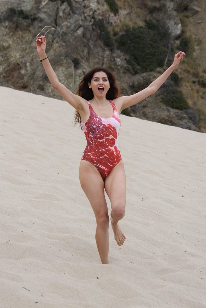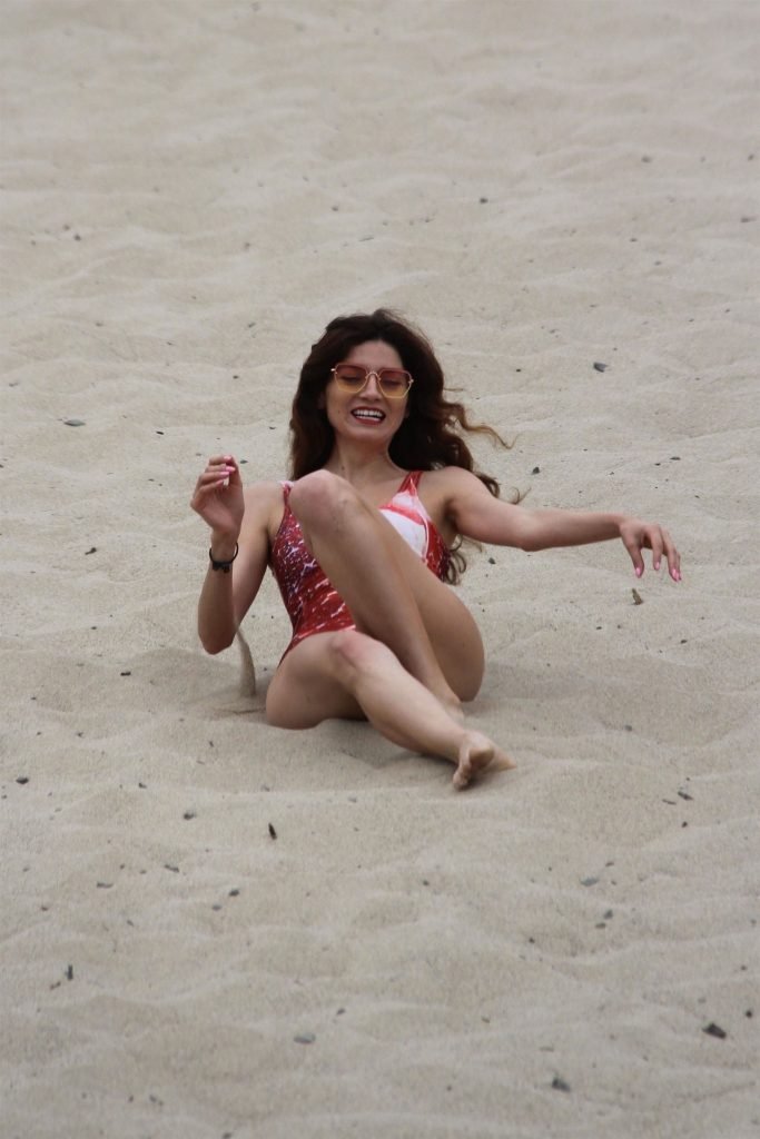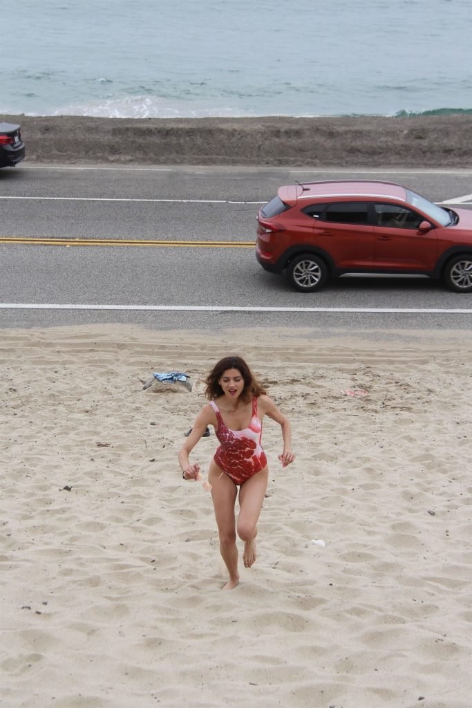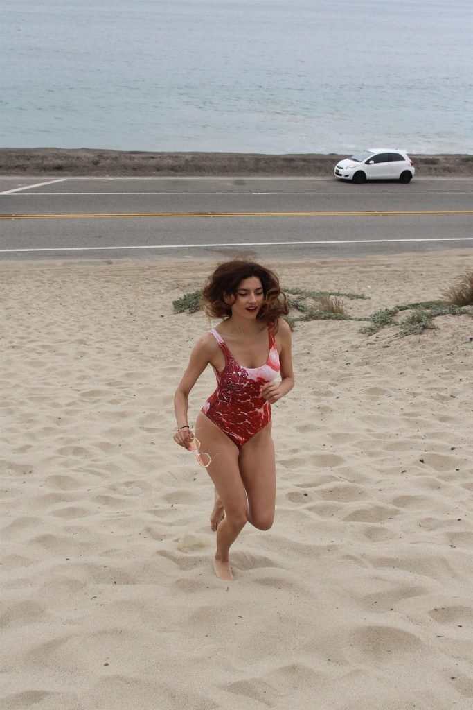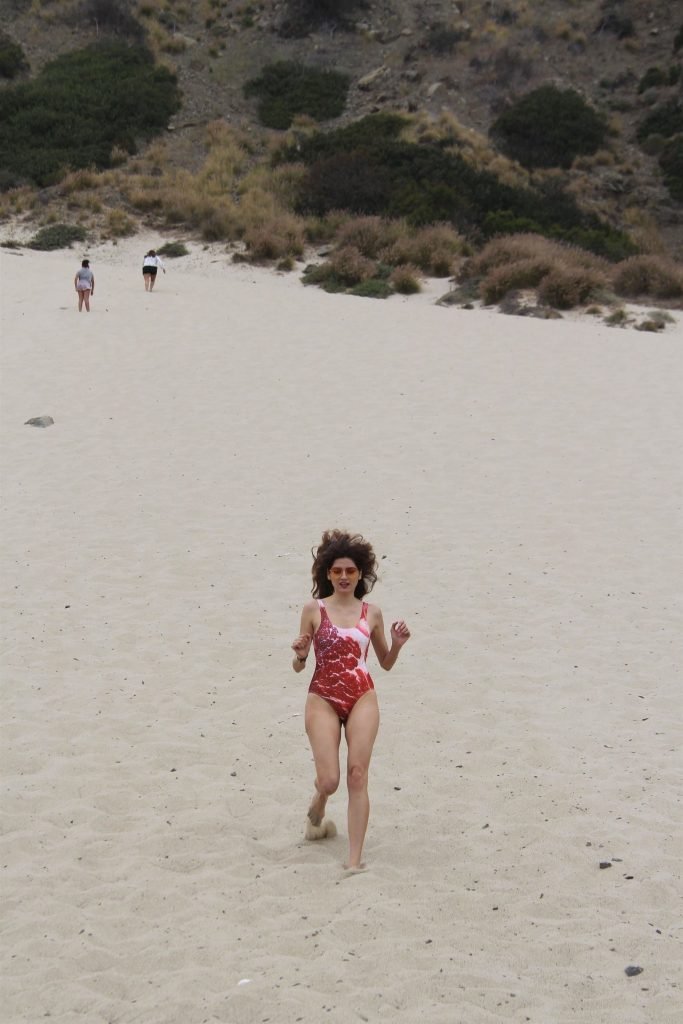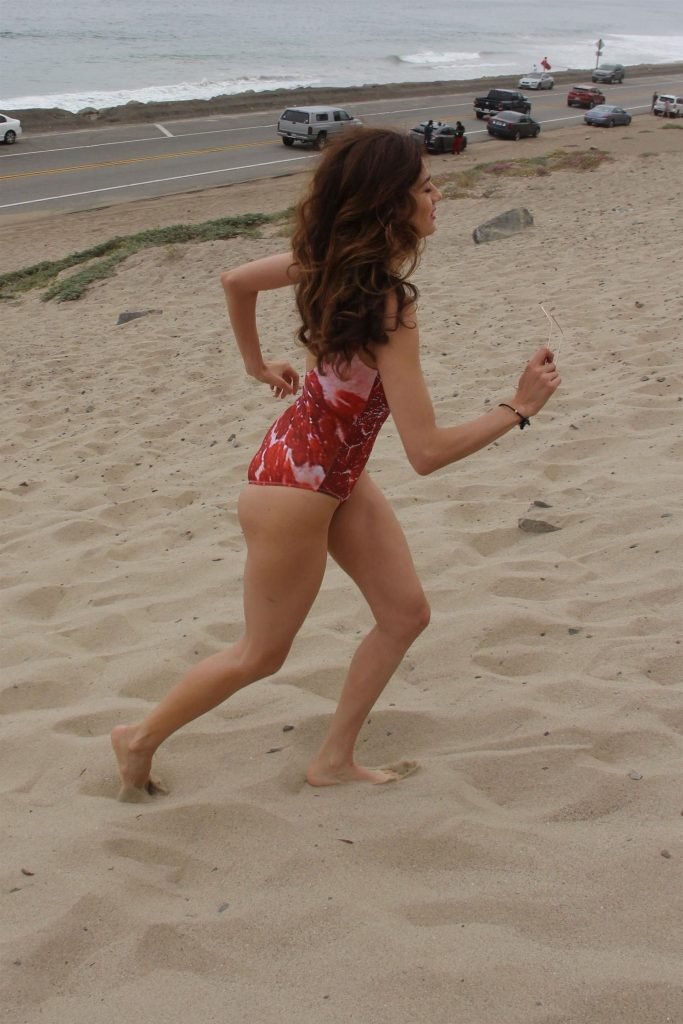 Актриса Бланка Бланко весело бегает и прыгает по песчаному холму в Малибу, 07/03/2018. Бланка была в красно-белом купальнике, когда резвилась на холме.