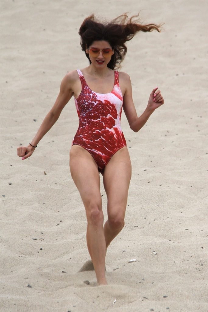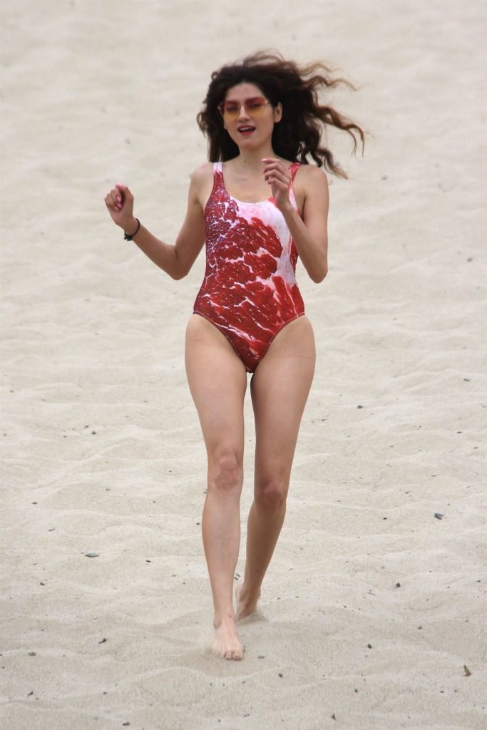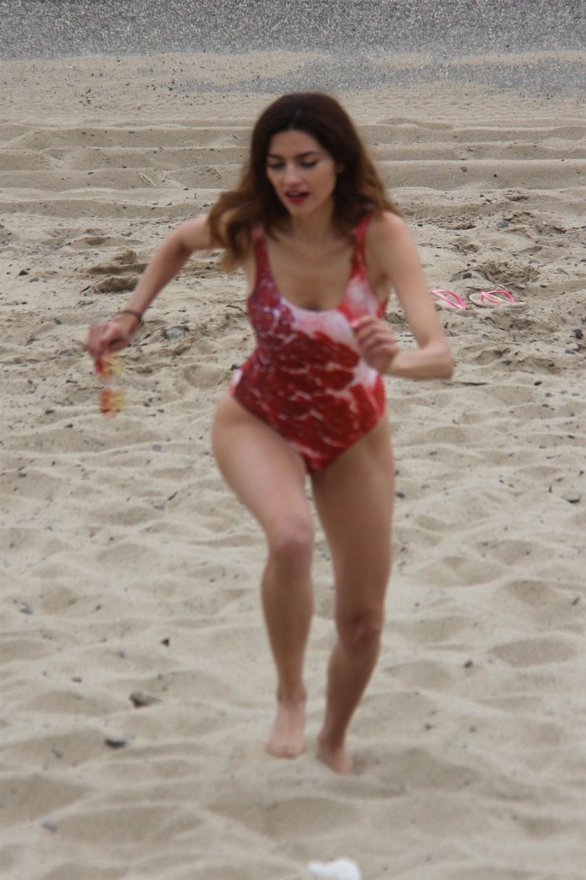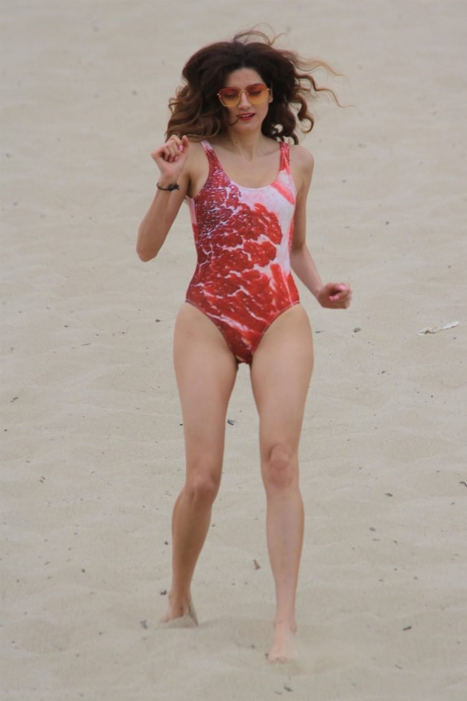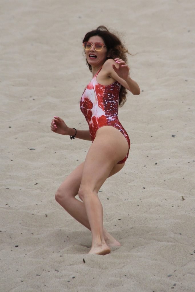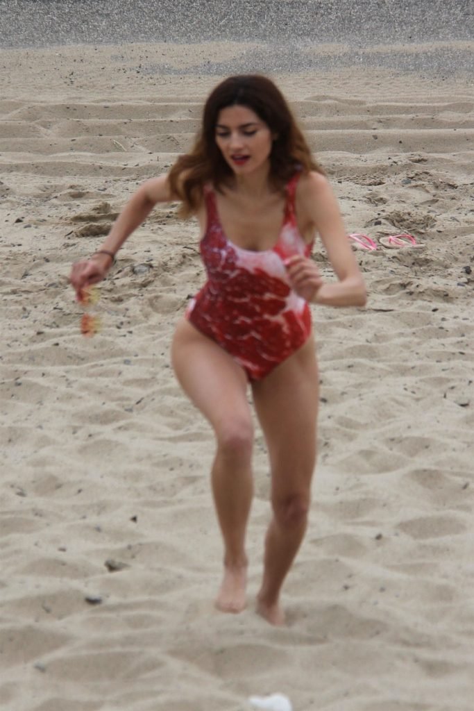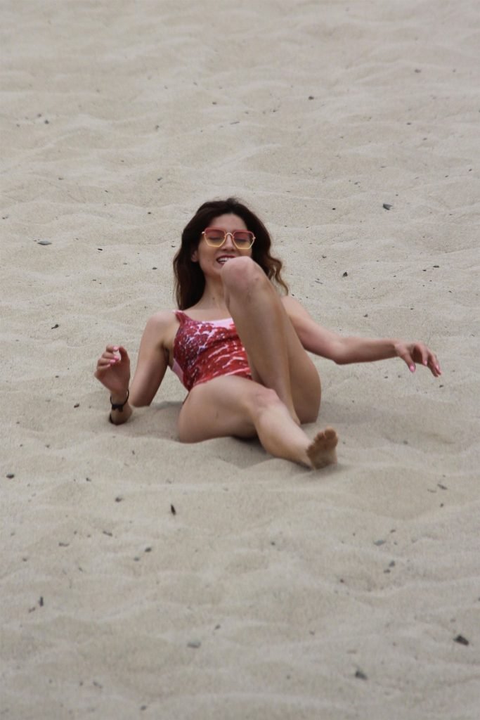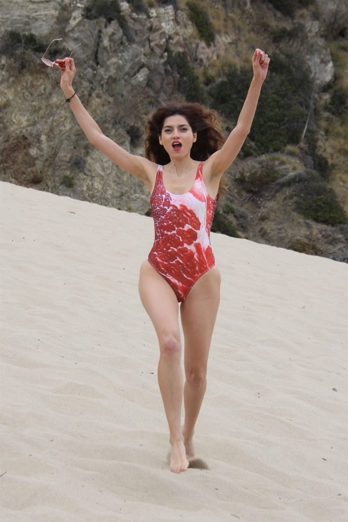 Актриса Бланка Бланко весело бегает и прыгает по песчаному холму в Малибу, 07/03/2018. Бланка была в красно-белом купальнике, когда резвилась на холме.