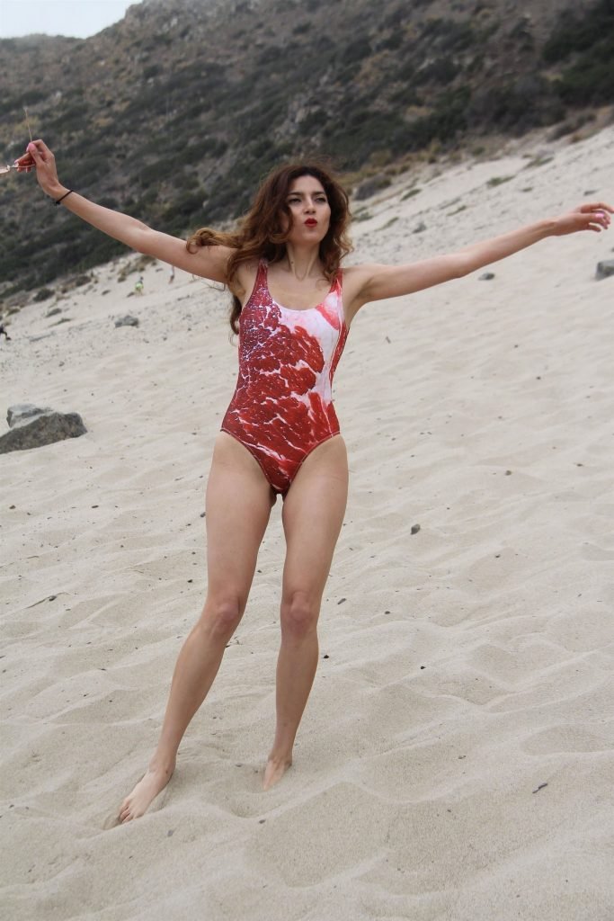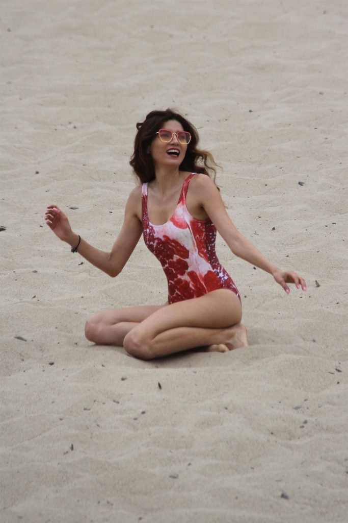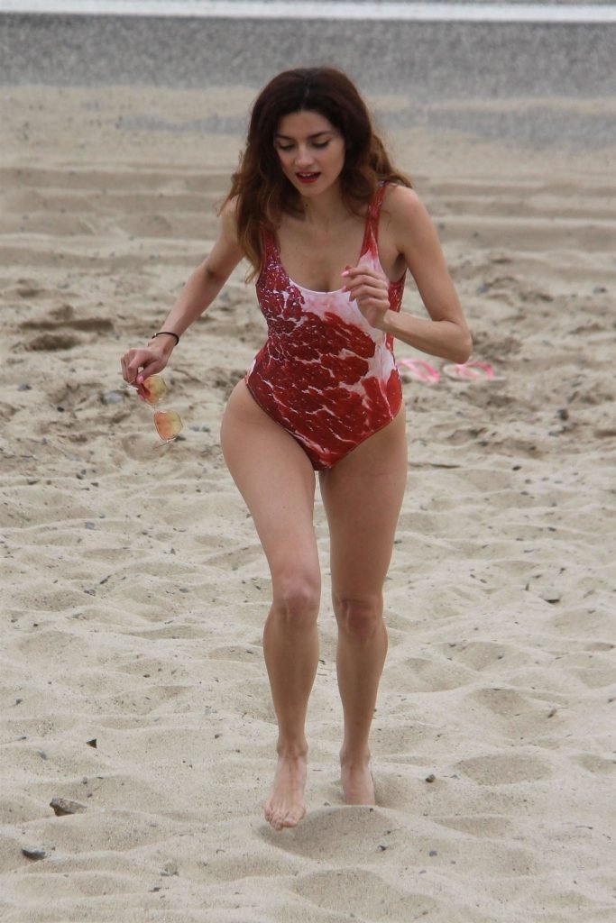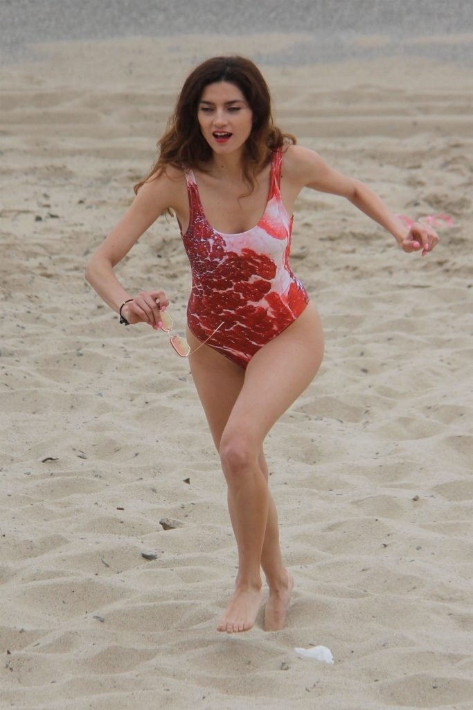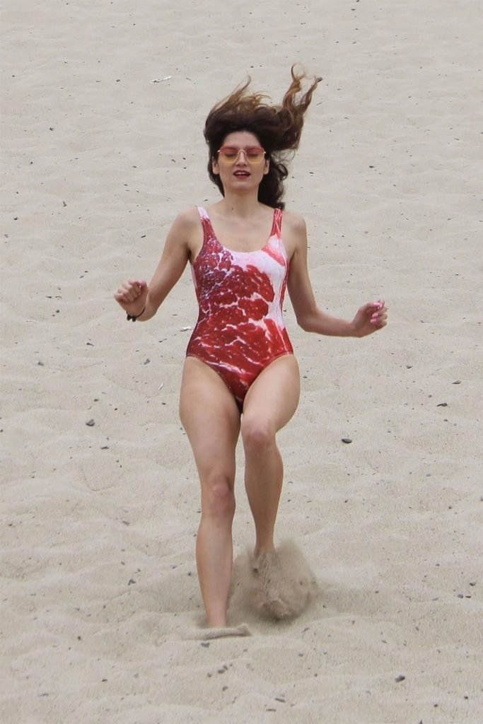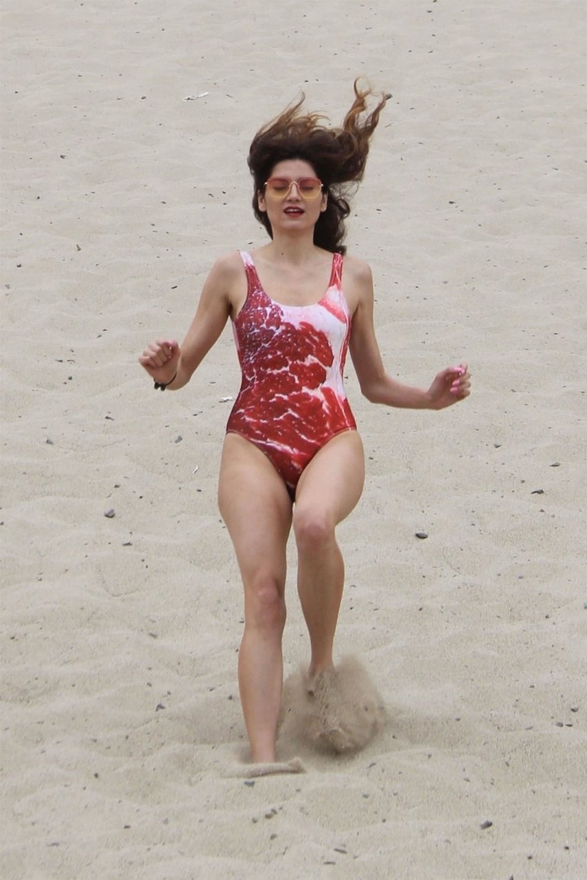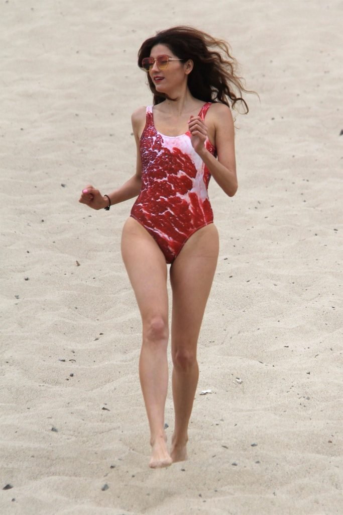 Актриса Бланка Бланко весело бегает и прыгает по песчаному холму в Малибу, 07/03/2018. Бланка была в красно-белом купальнике, когда резвилась на холме.