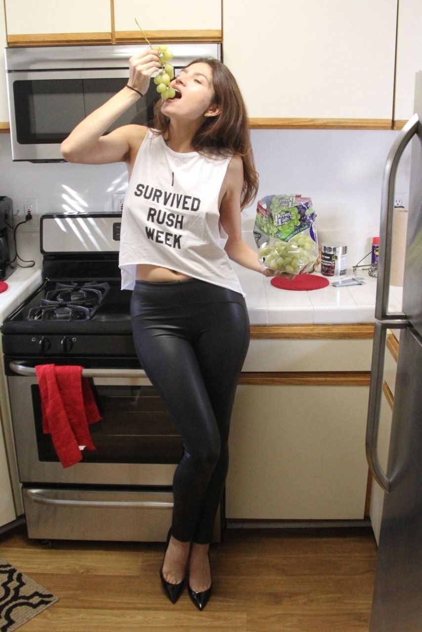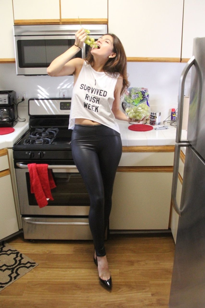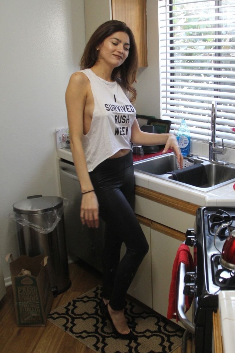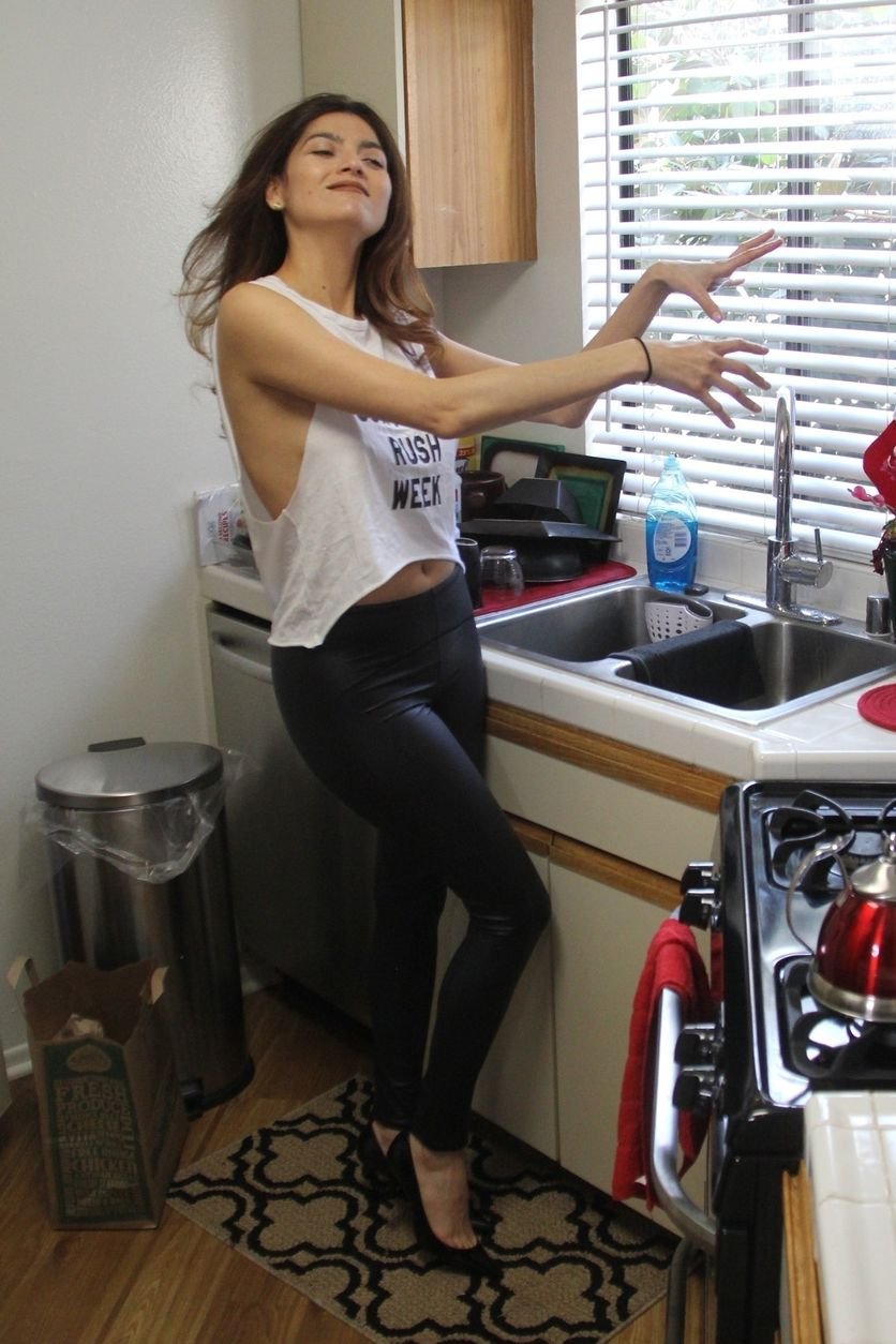 Бланка Бланко демонстрирует образ без бюстгальтера, находясь дома в Лос-Анджелесе, 01/11/2019. 37-летняя актриса выглядит расслабленной, убирая в своей квартире в безрукавке с надписью «I Survived Rush Week», без бюстгальтера, в черных кожаных леггинсах и черных туфлях на каблуках.