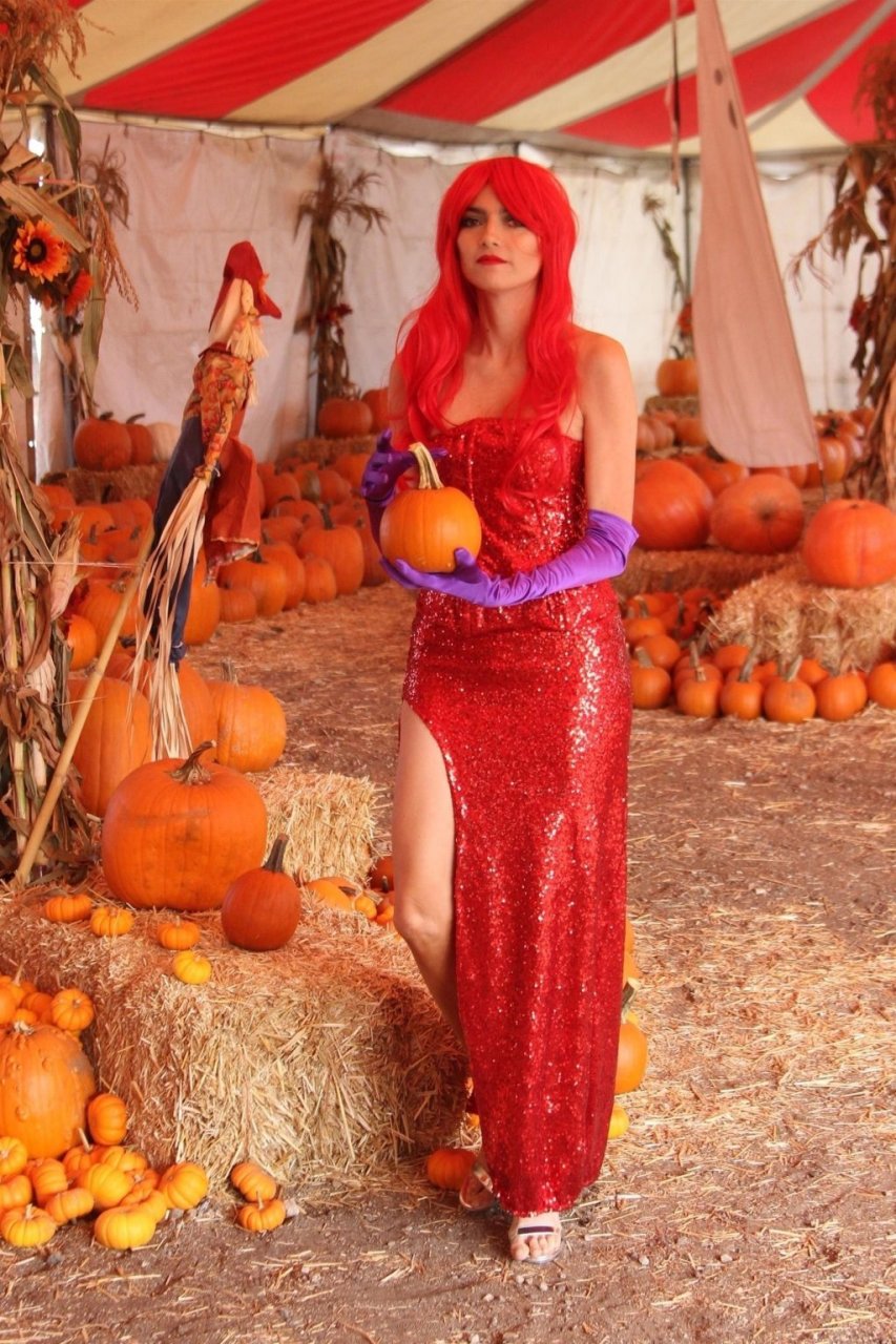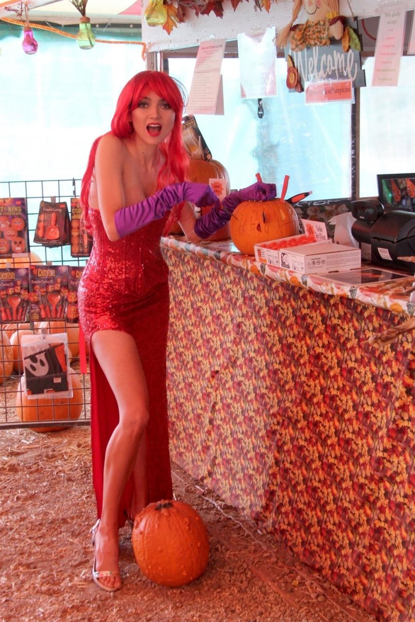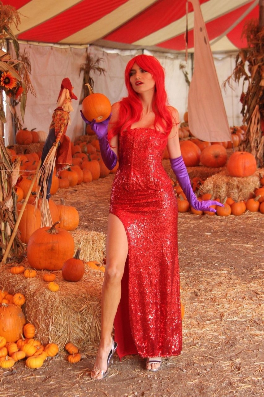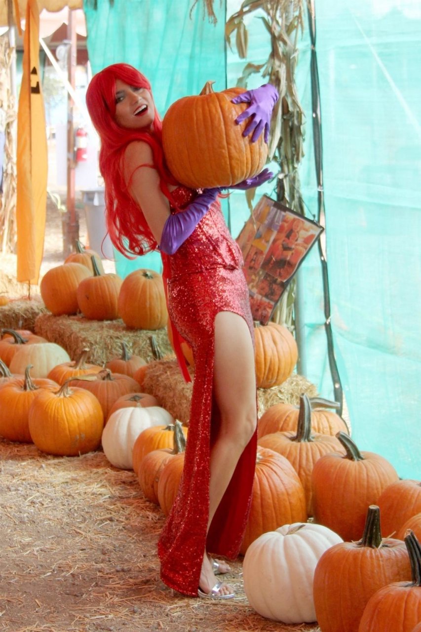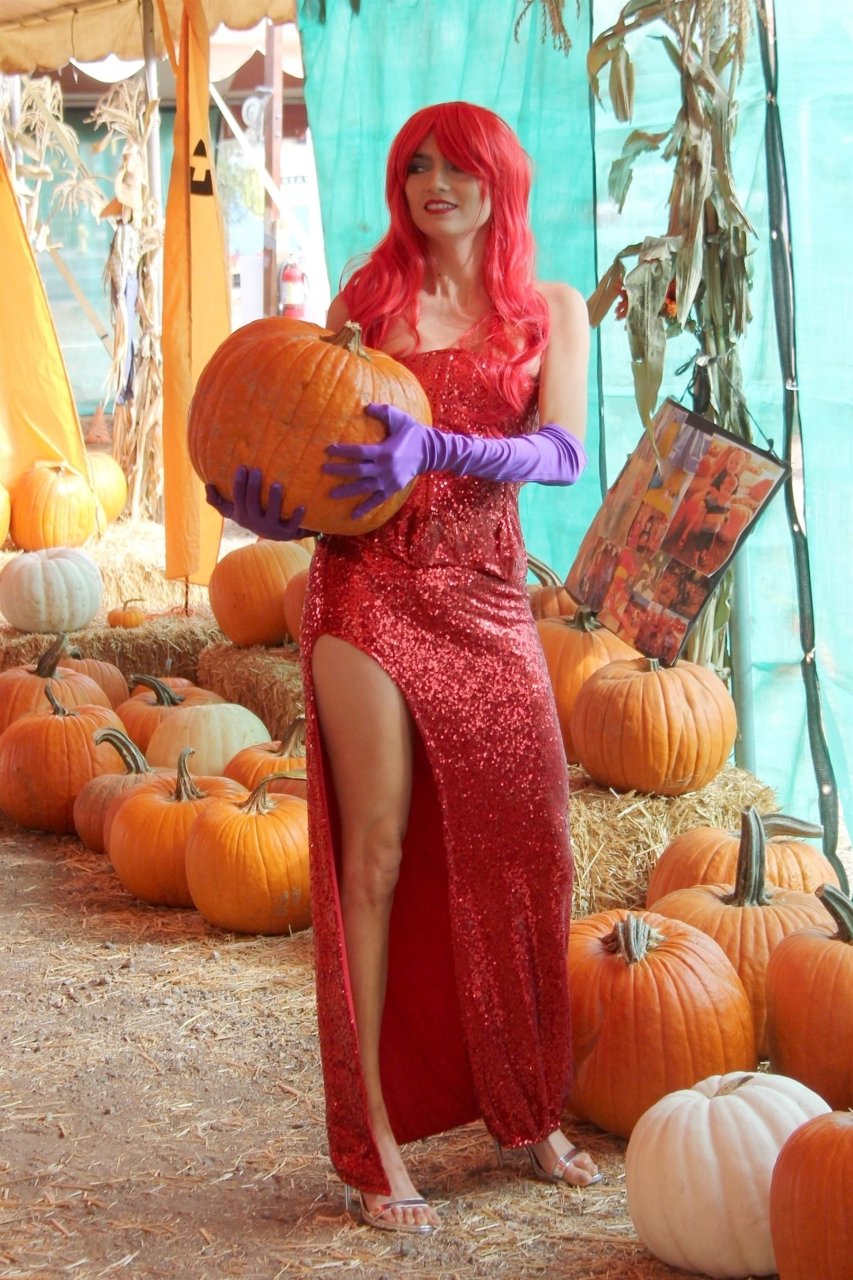 Актриса Бланка Бланко выбирает сексуальный образ, отправляясь на тыквенные поля Лос-Анджелеса в образе Джессики Рэббит в длинном красном платье и с подходящими красными волосами, 22.10.2018. Бланка проводит время, выбирая тыкву и наслаждаясь временем на надувной горке.