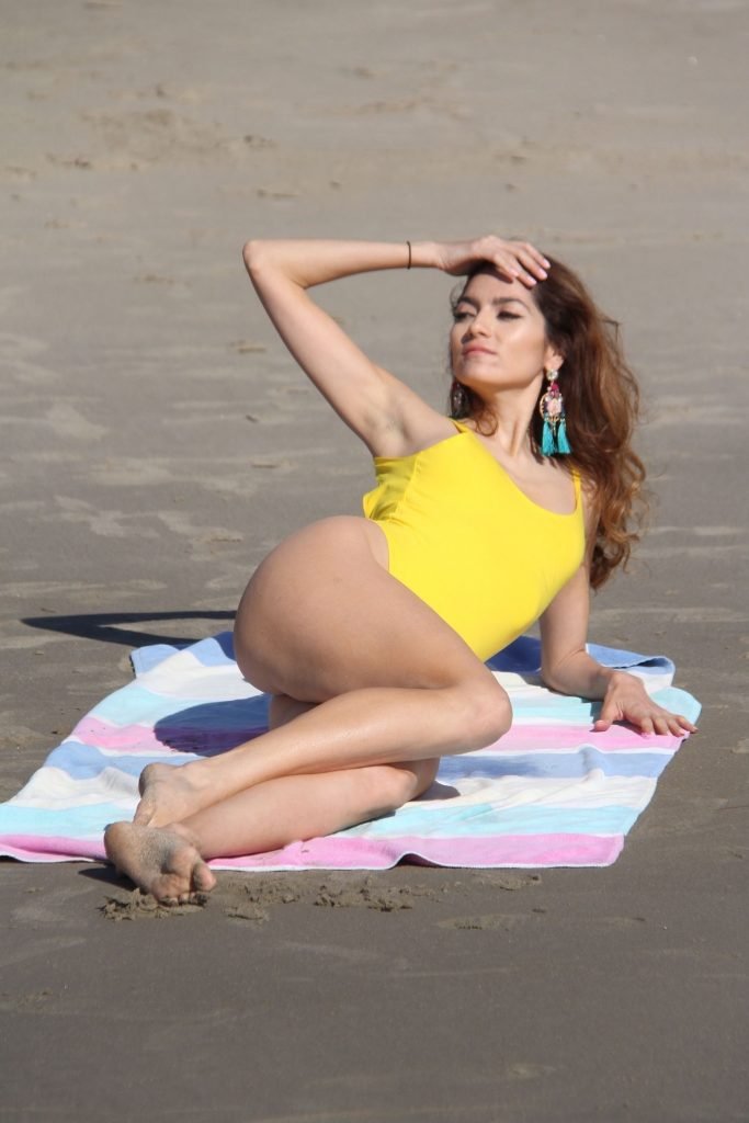 Актриса Бланка Бланко (36) смело переносит холод ради фотосессии на пляже. Бланка выделяется в ярком желтом цельном купальнике, прогуливаясь по пляжам Малибу, 30.12.2017.