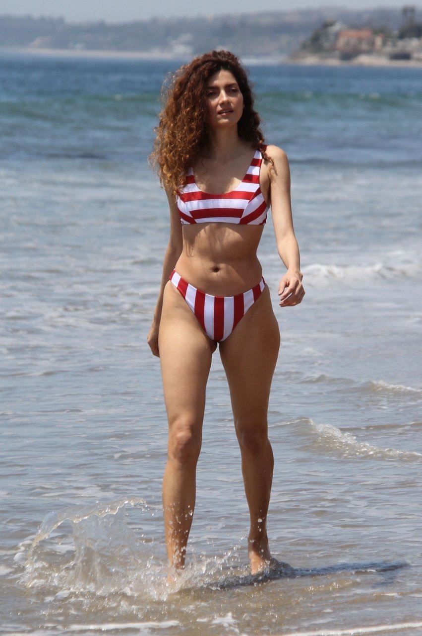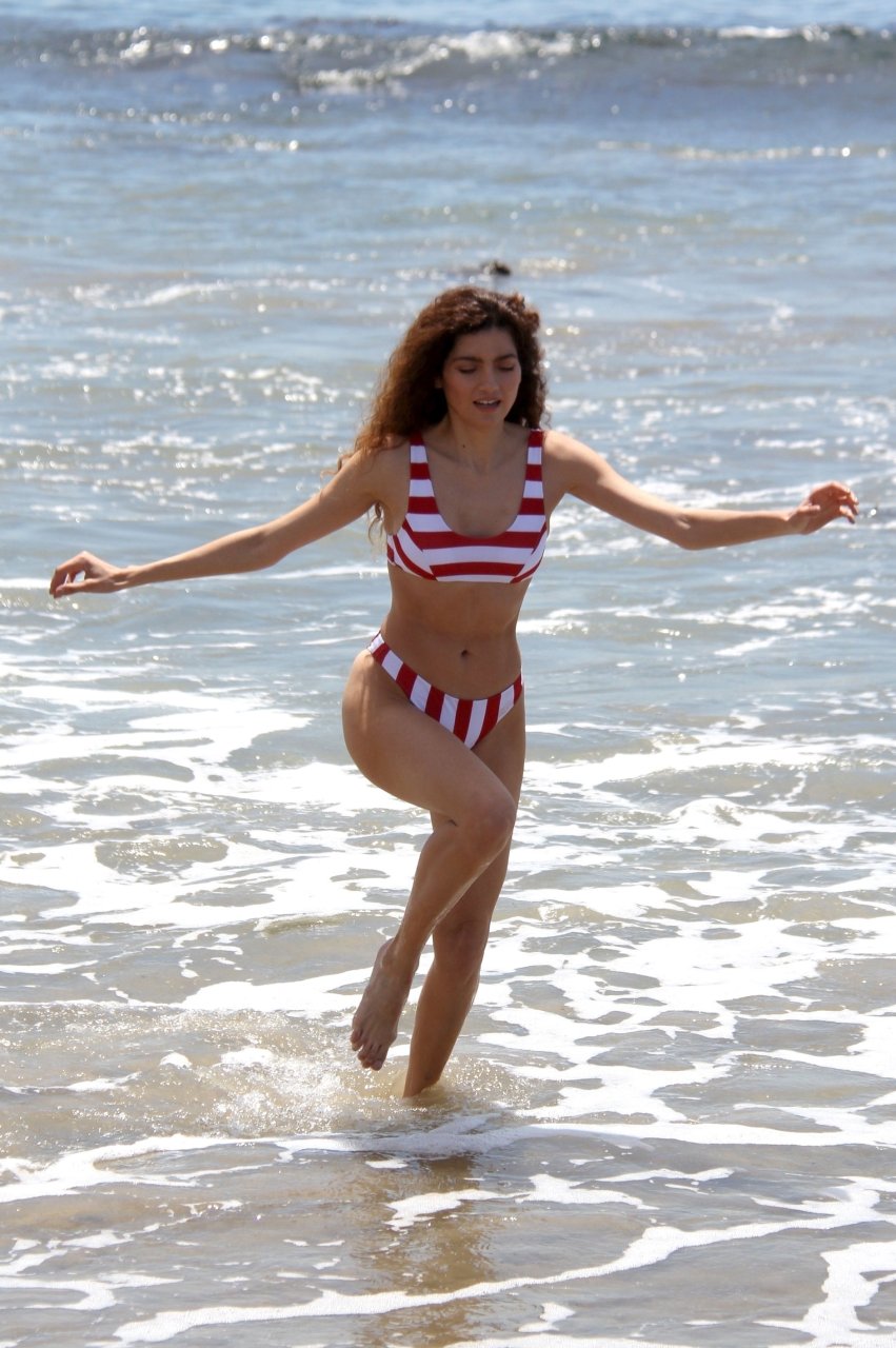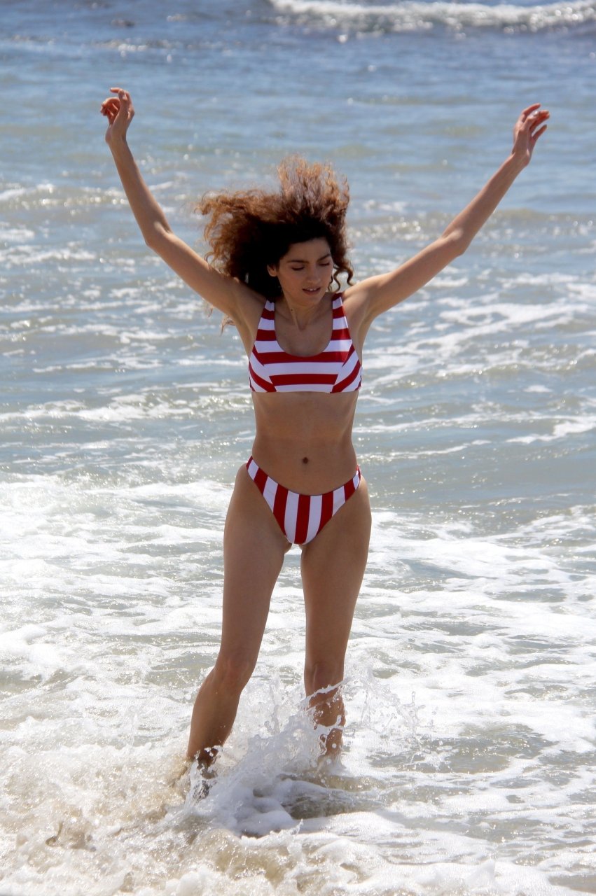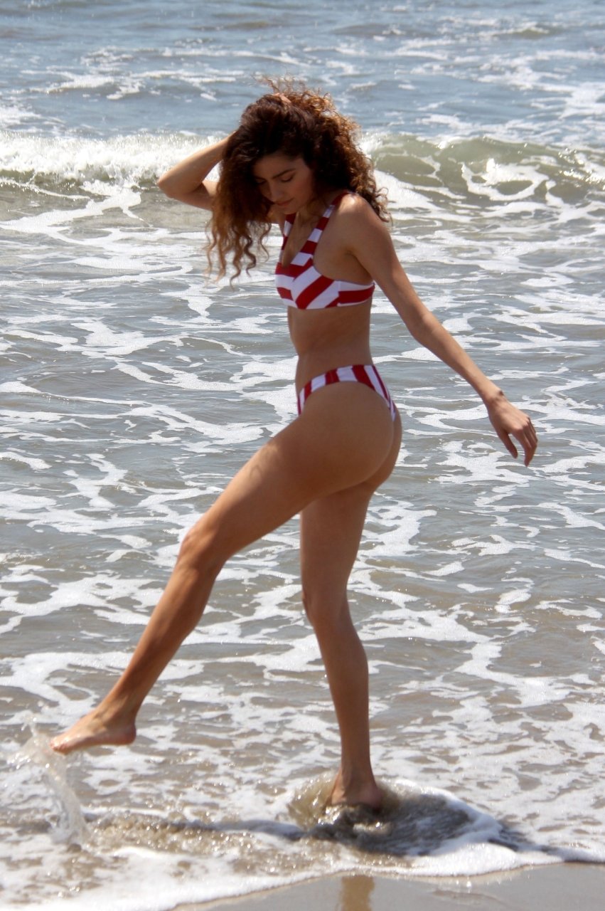 Актриса Бланка Бланко, 37 лет, наслаждается днем на пляже в Малибу в милом красно-белом полосатом бикини, 08.05.2018.