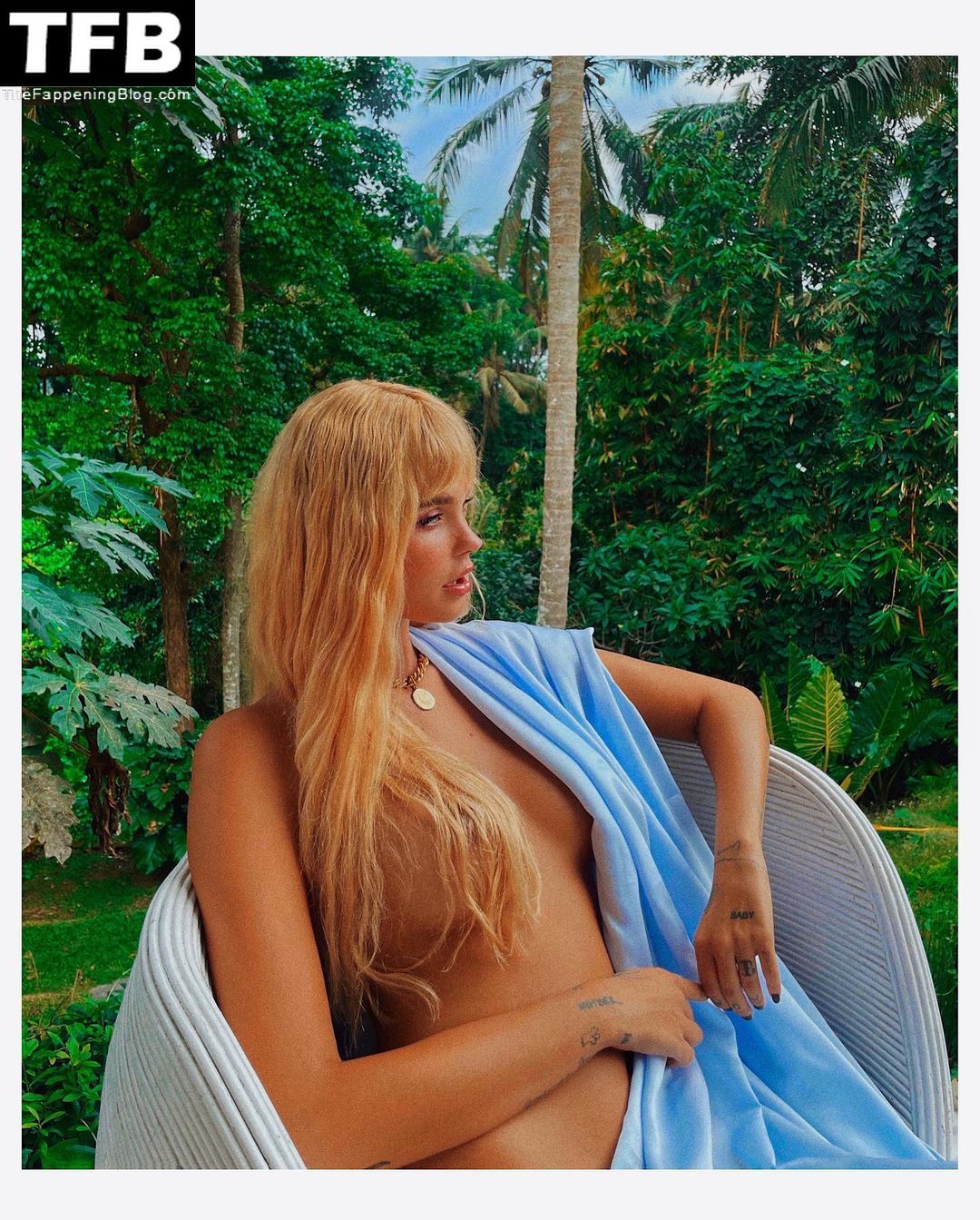 Модель, певица и икона моды Бонни Стрейндж позирует обнажённой на природе, показывая свои груди и ноги (октябрь 2021).