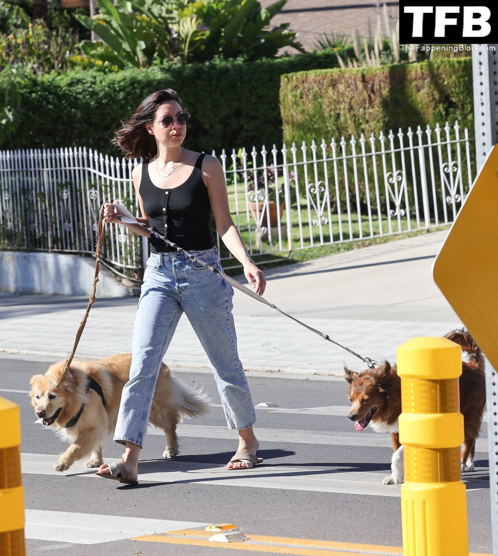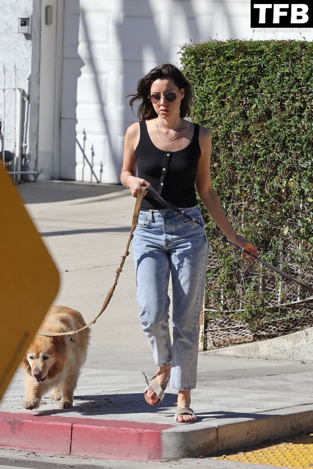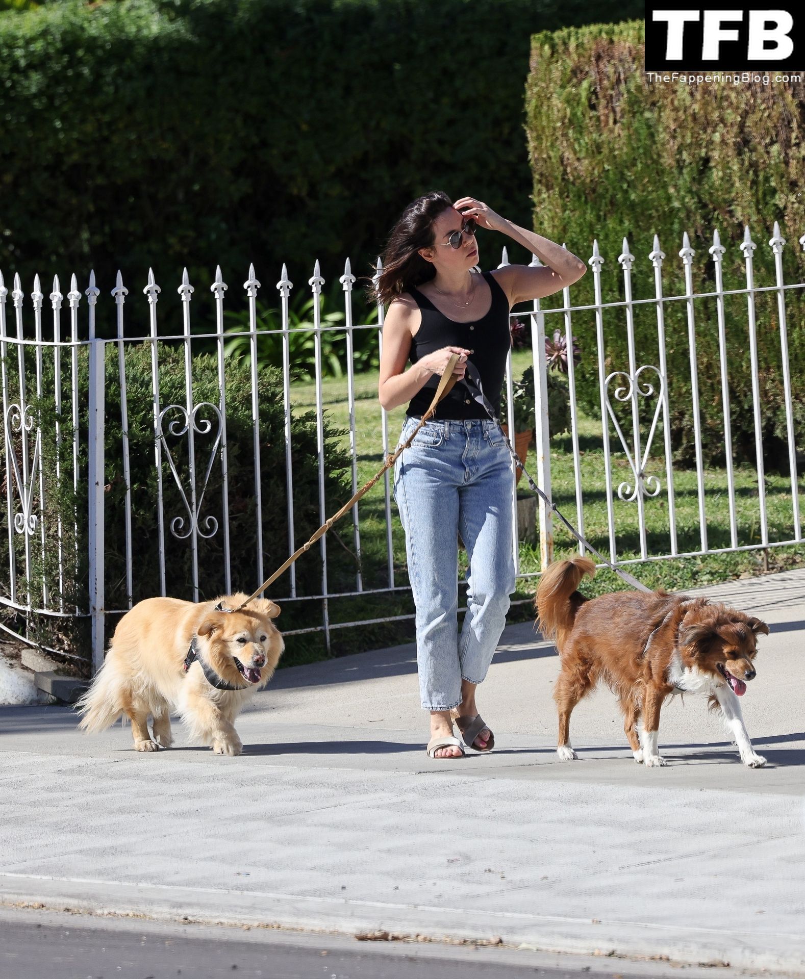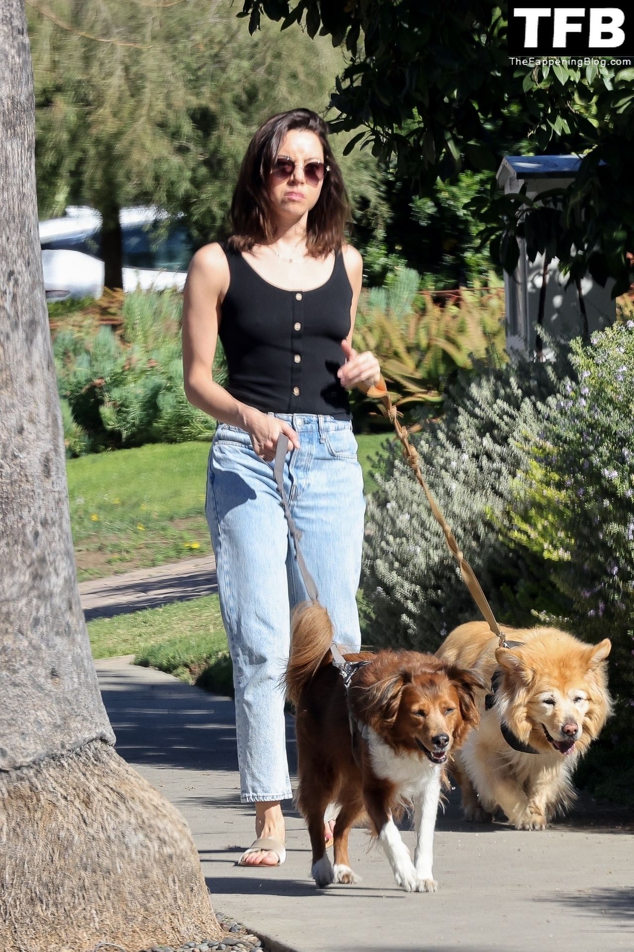 Актриса Обри Плаза выглядит непринуждённо в джинсах и чёрном топе, когда выгуливает своих собак утром по окрестностям Лос-Фелиса, 13.02.2022.