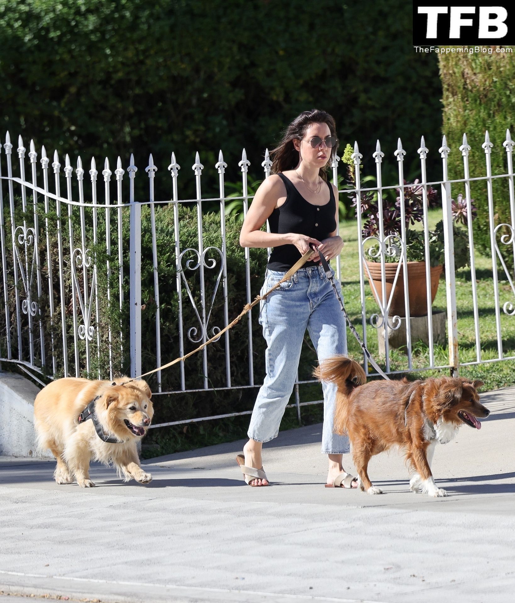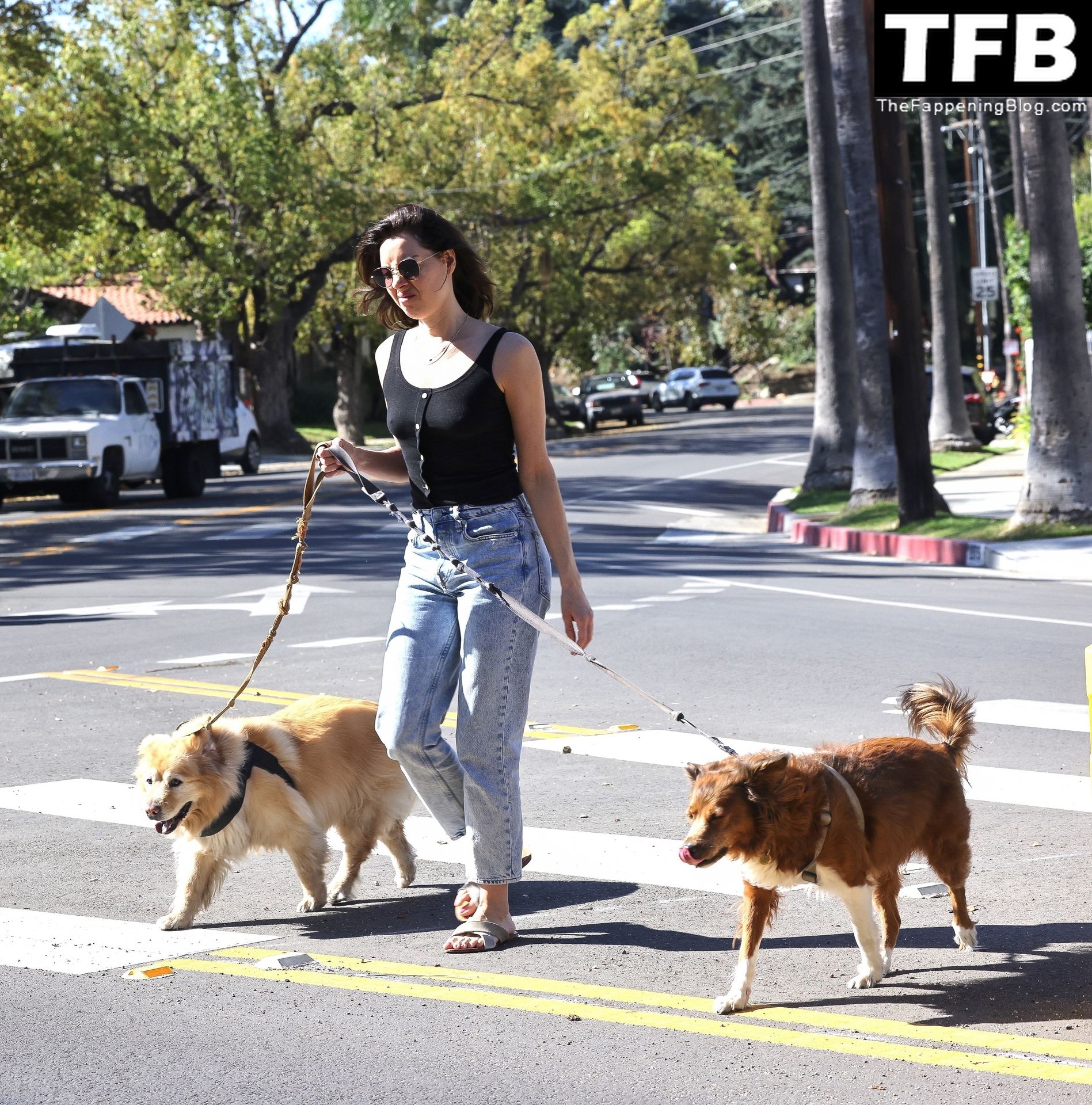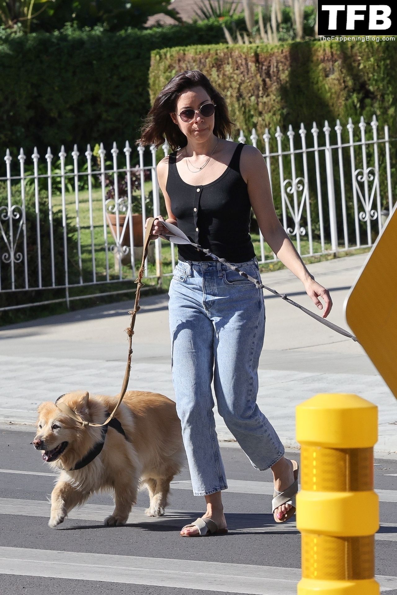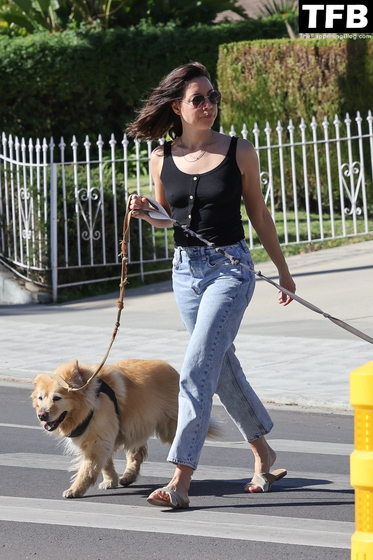 Актриса Обри Плаза выглядит непринуждённо в джинсах и чёрном топе, когда выгуливает своих собак утром по окрестностям Лос-Фелиса, 13.02.2022.