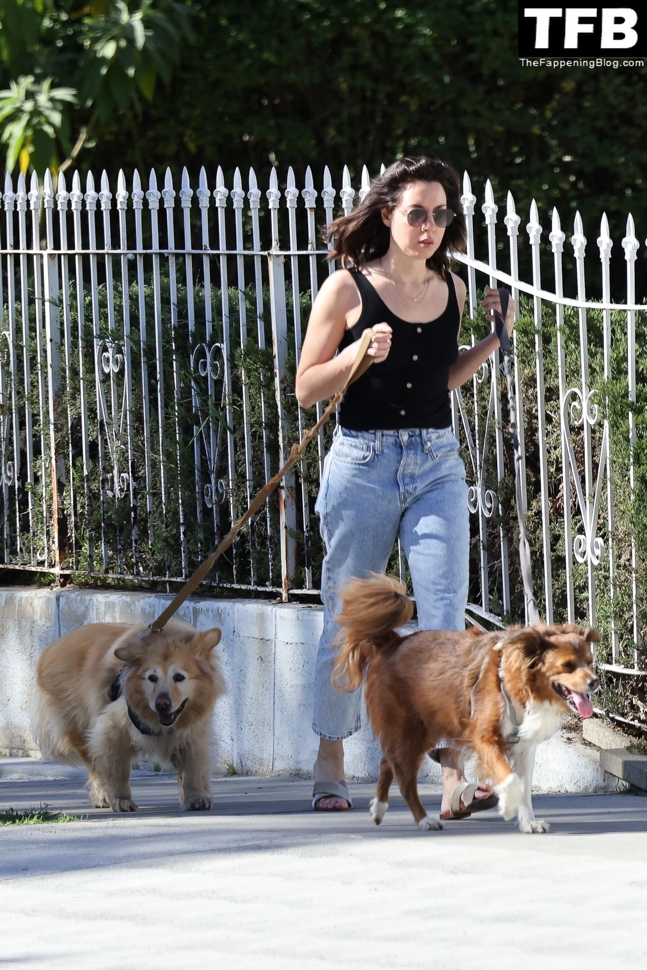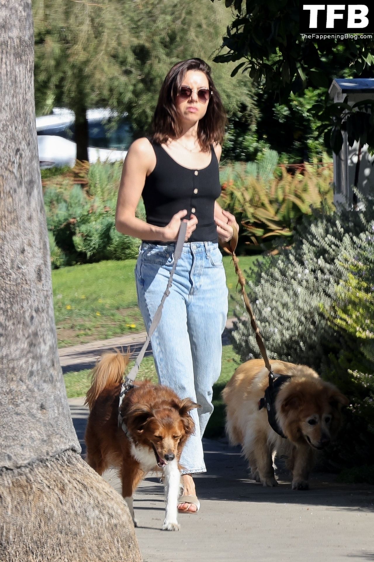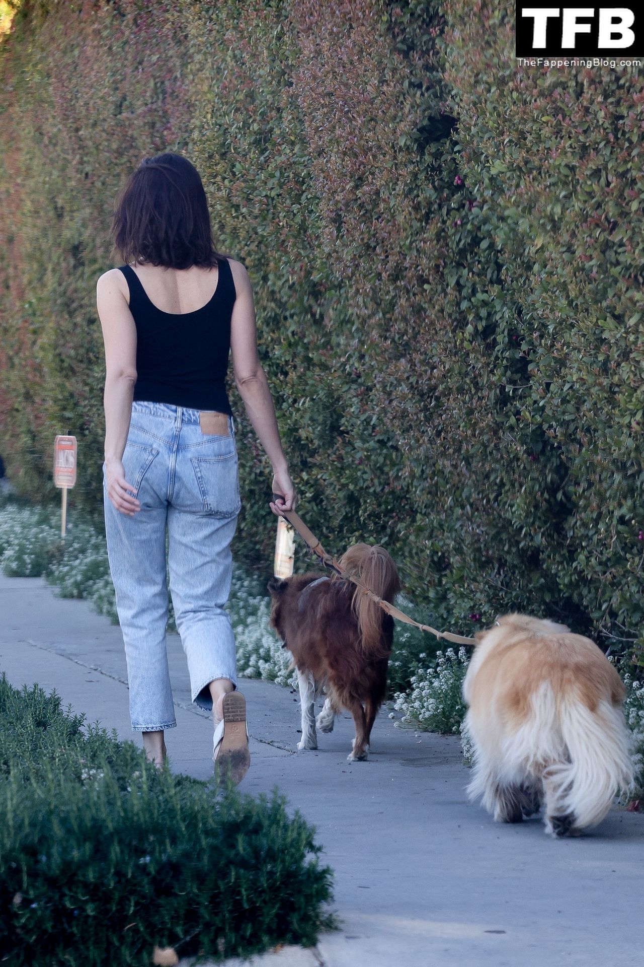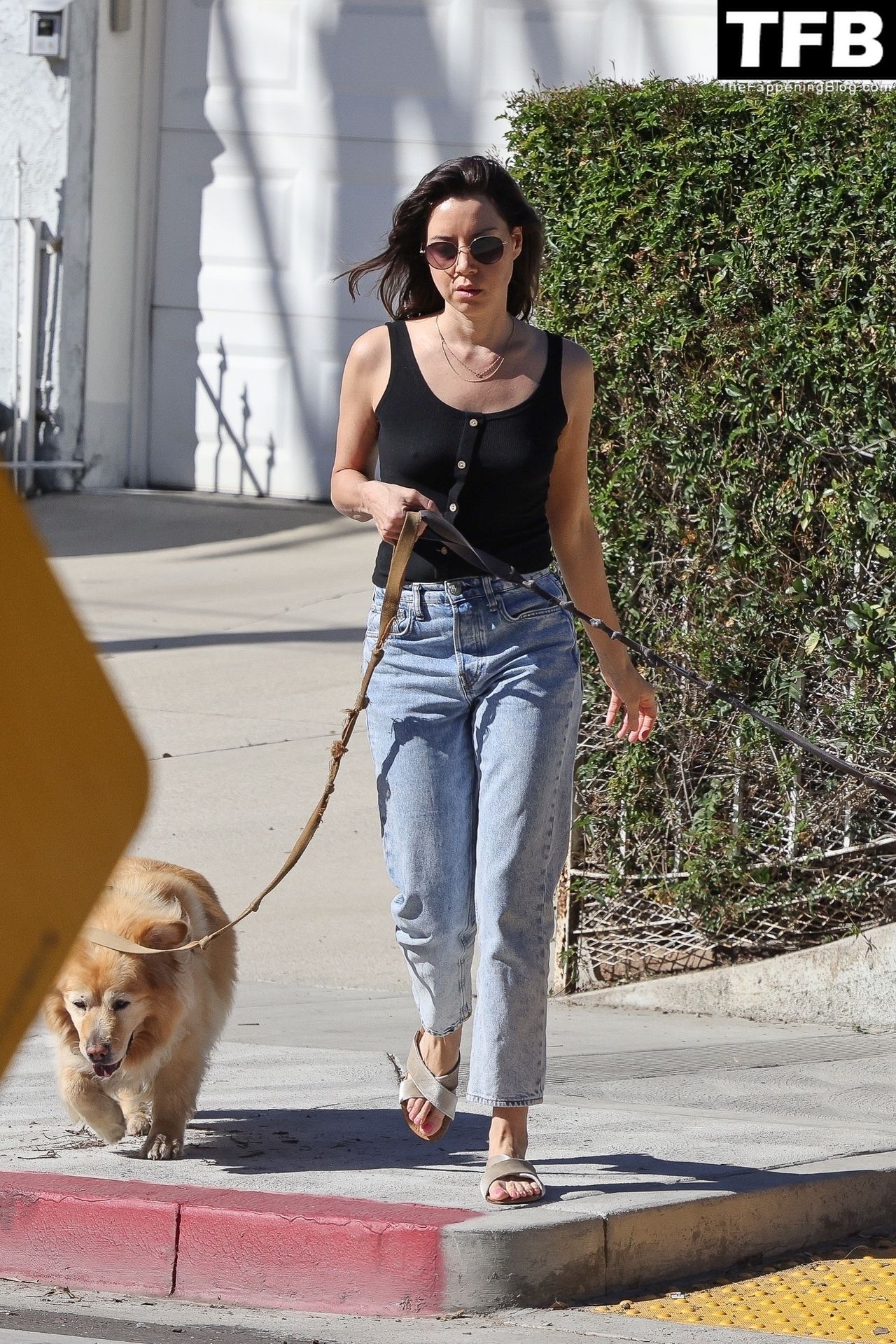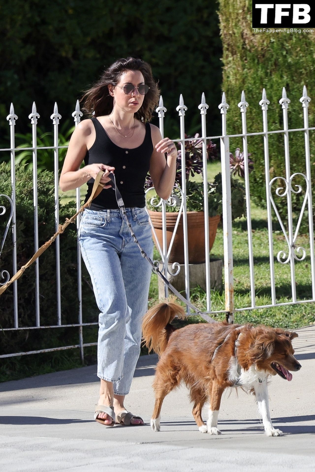 Актриса Обри Плаза выглядит непринуждённо в джинсах и чёрном топе, когда выгуливает своих собак утром по окрестностям Лос-Фелиса, 13.02.2022.