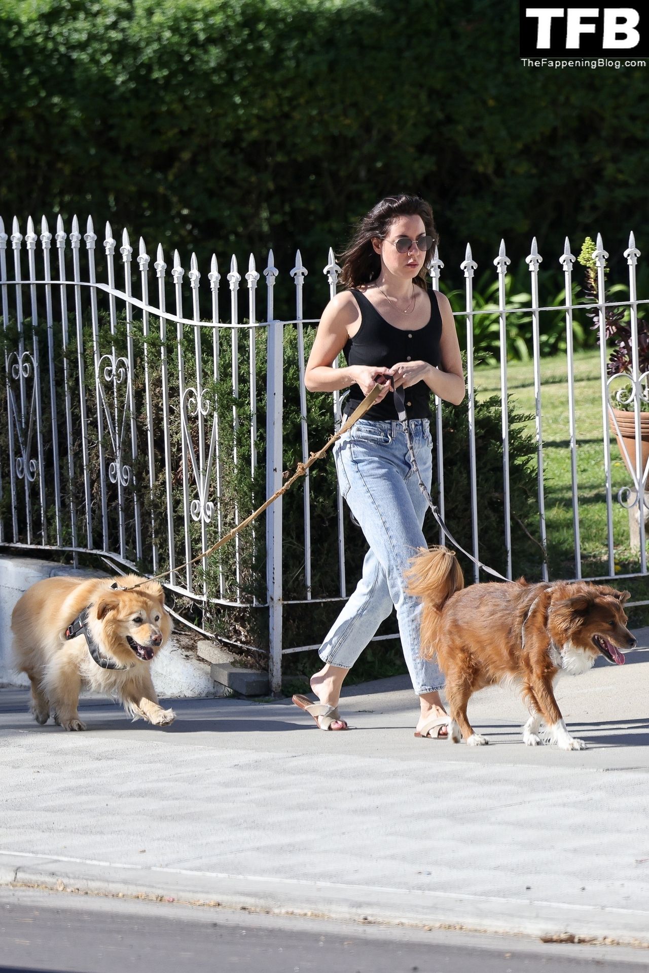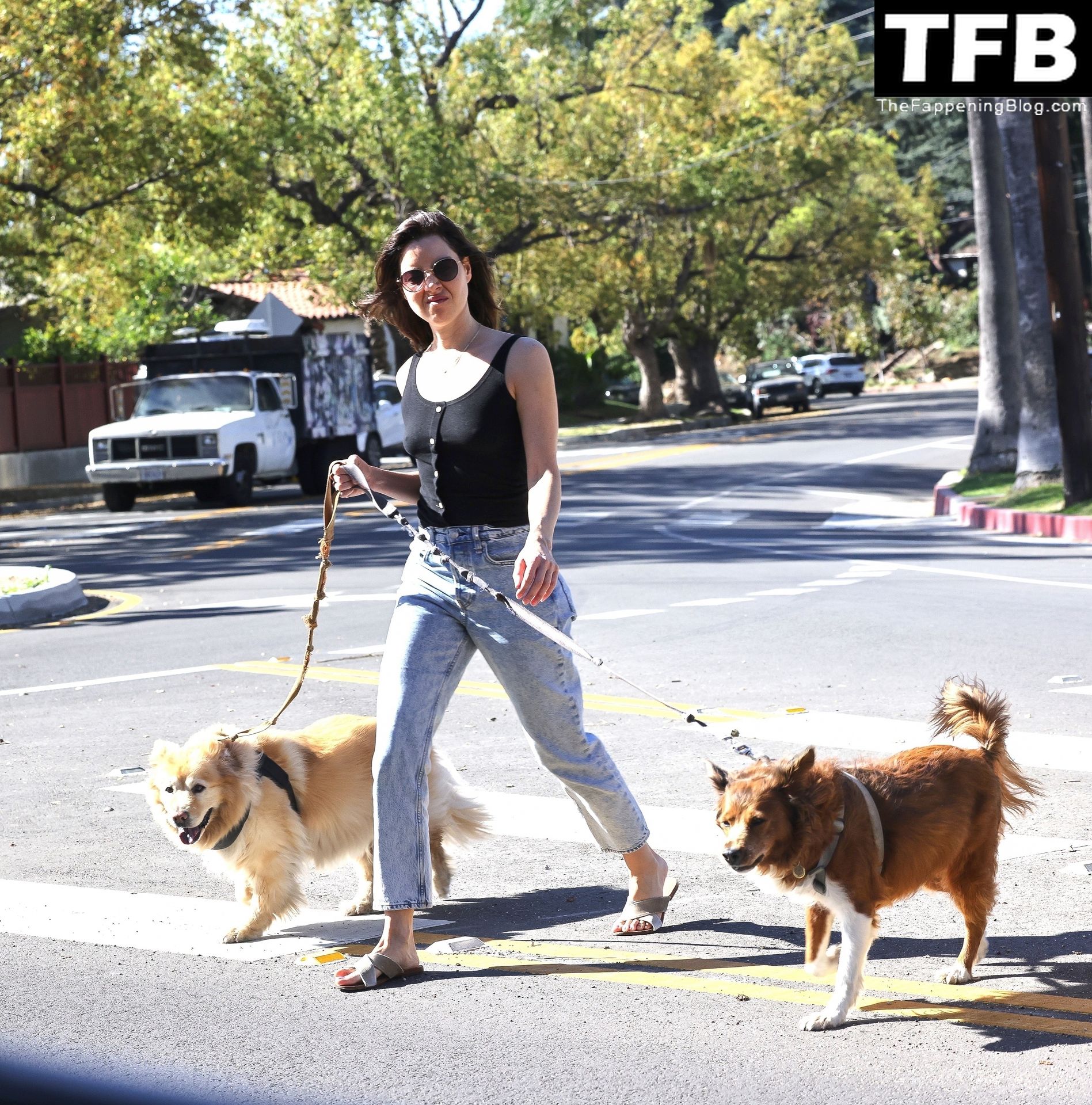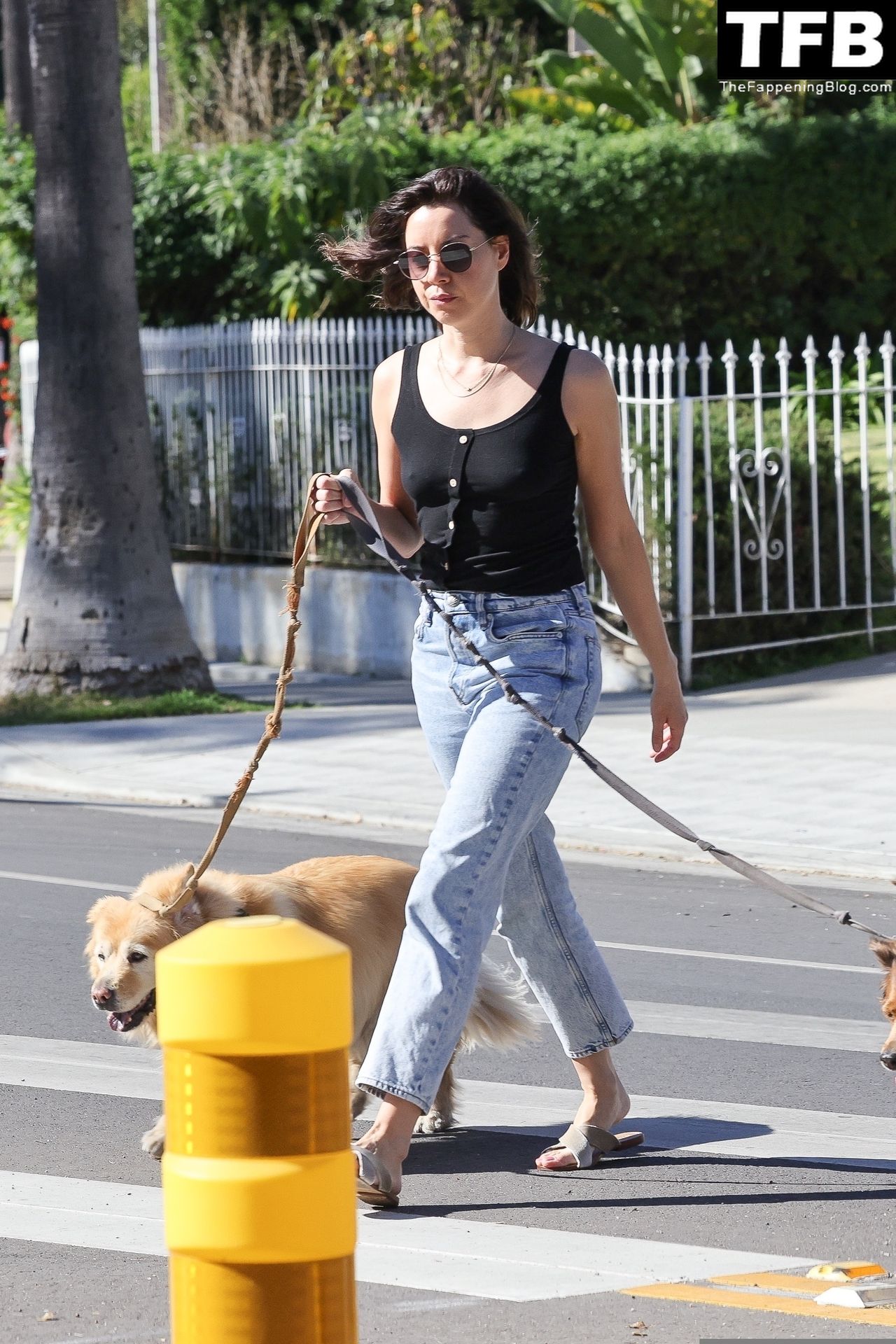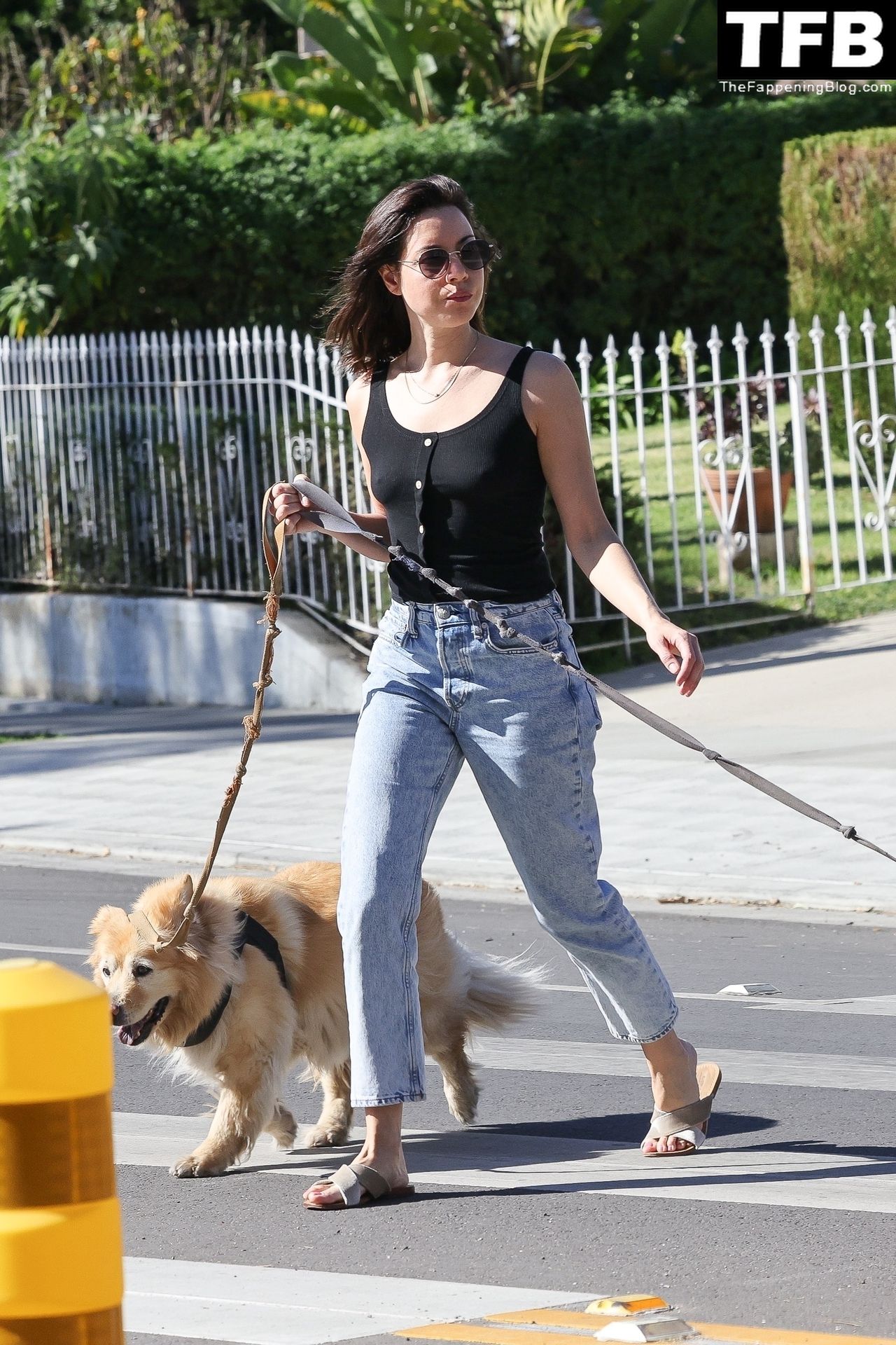 Актриса Обри Плаза выглядит непринуждённо в джинсах и чёрном топе, когда выгуливает своих собак утром по окрестностям Лос-Фелиса, 13.02.2022.