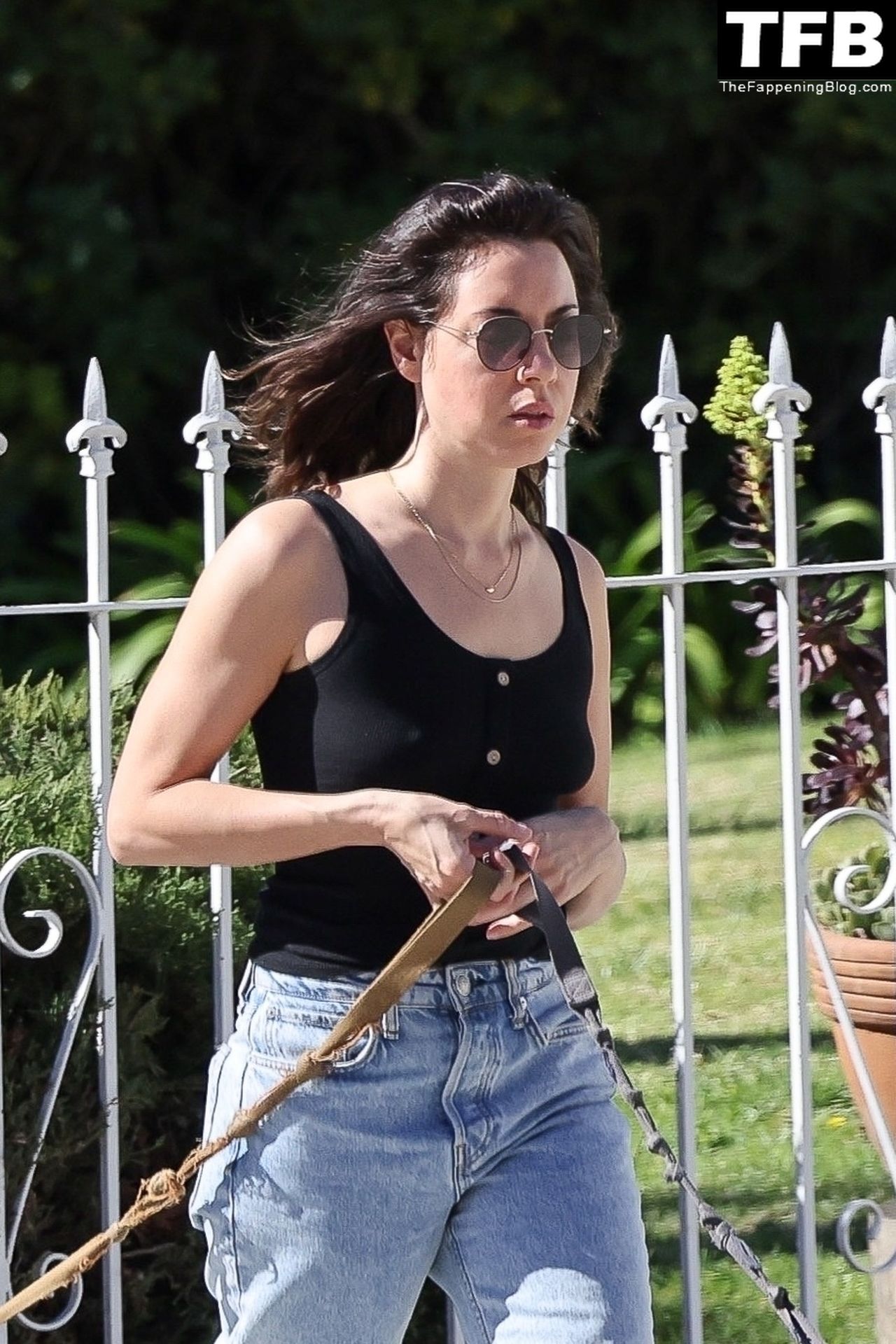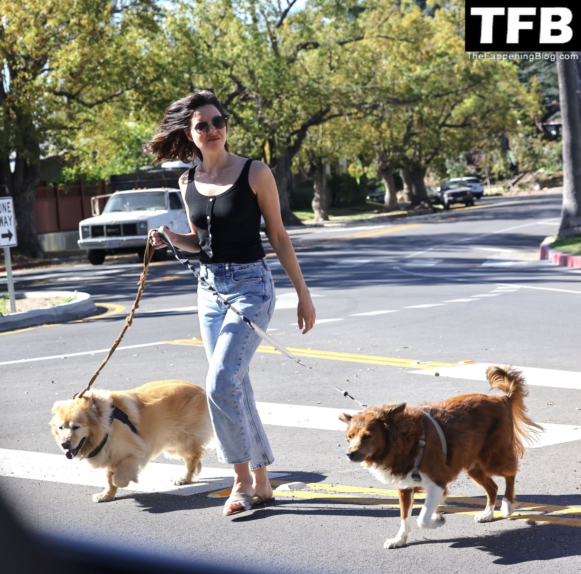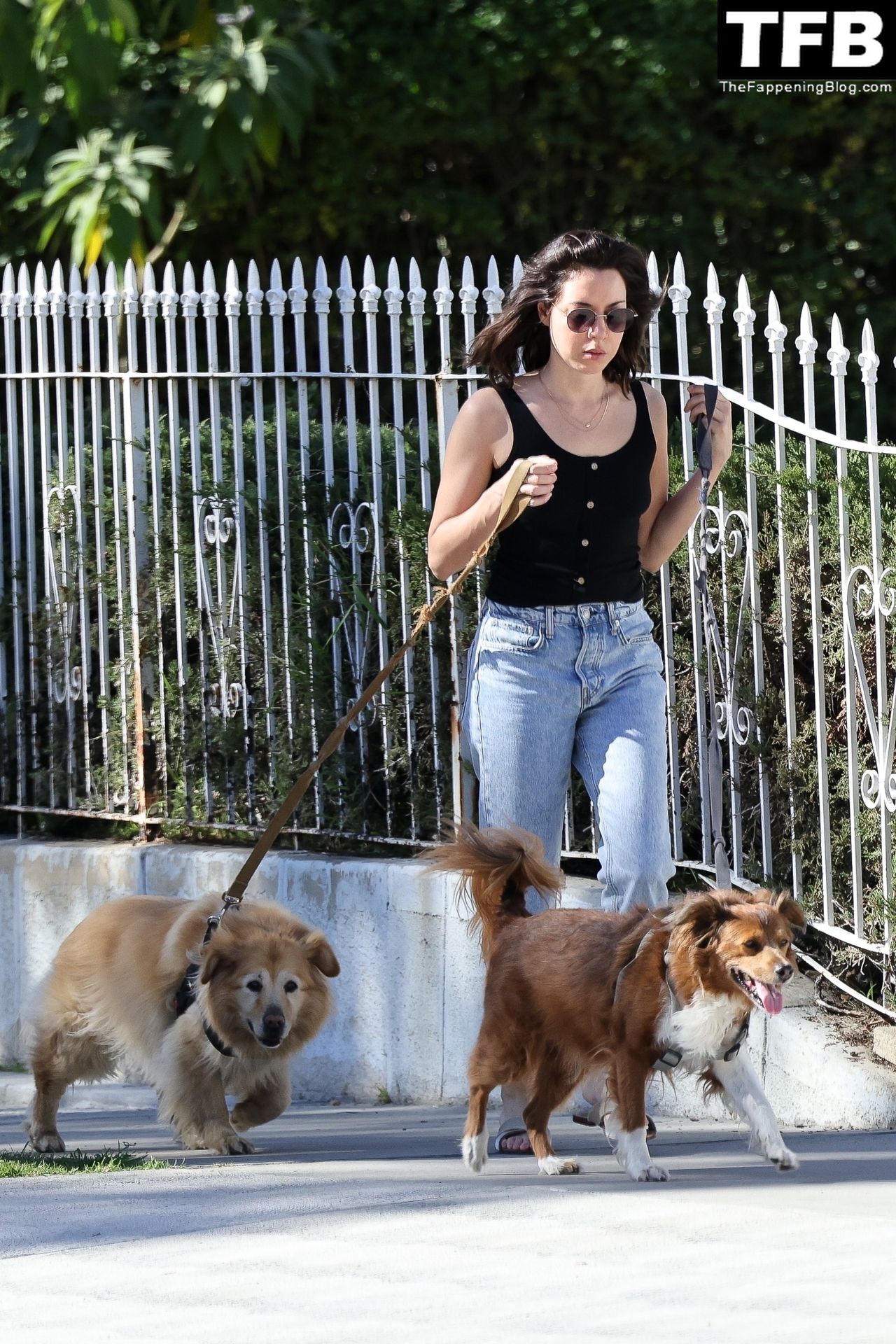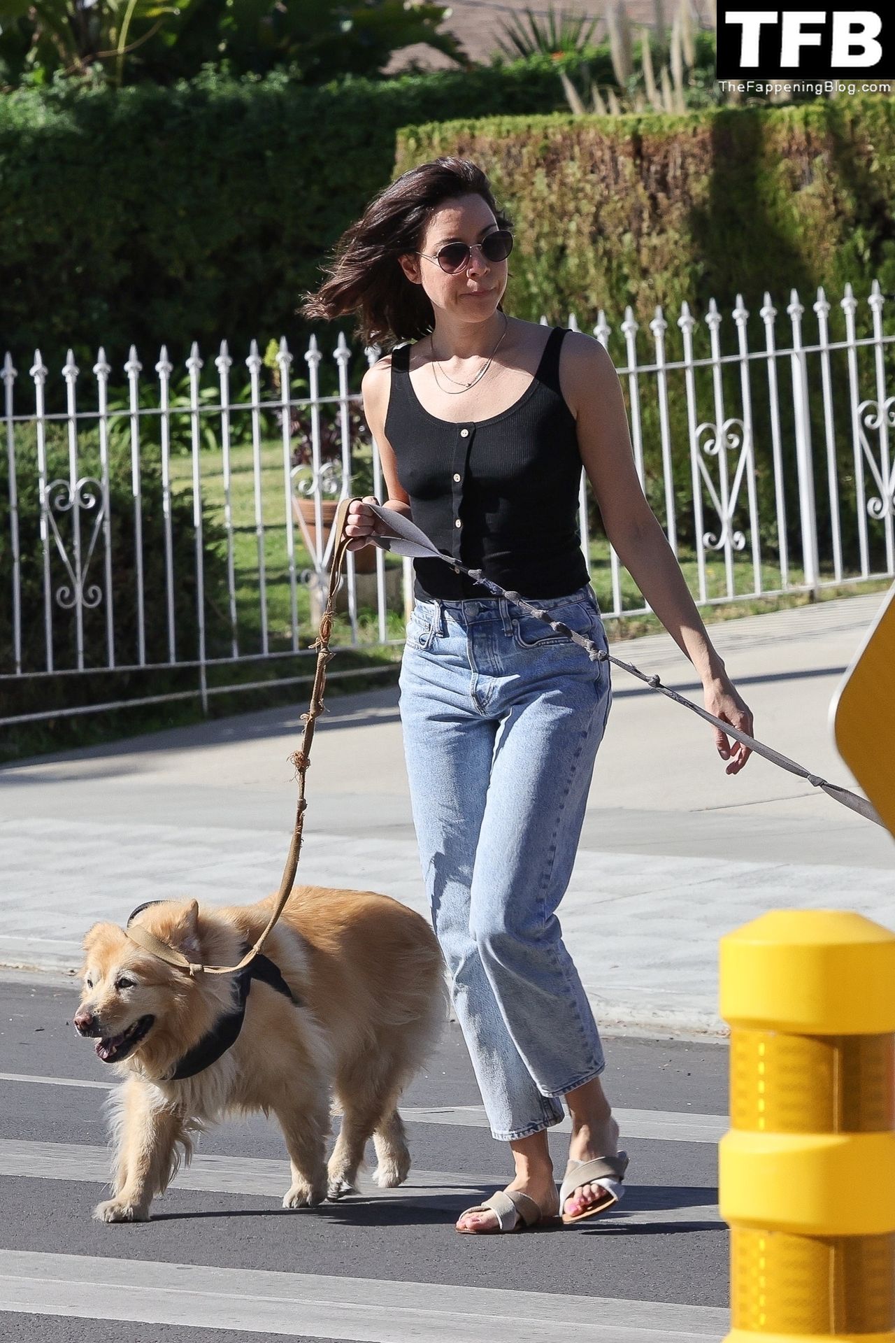 Актриса Обри Плаза выглядит непринуждённо в джинсах и чёрном топе, когда выгуливает своих собак утром по окрестностям Лос-Фелиса, 13.02.2022.