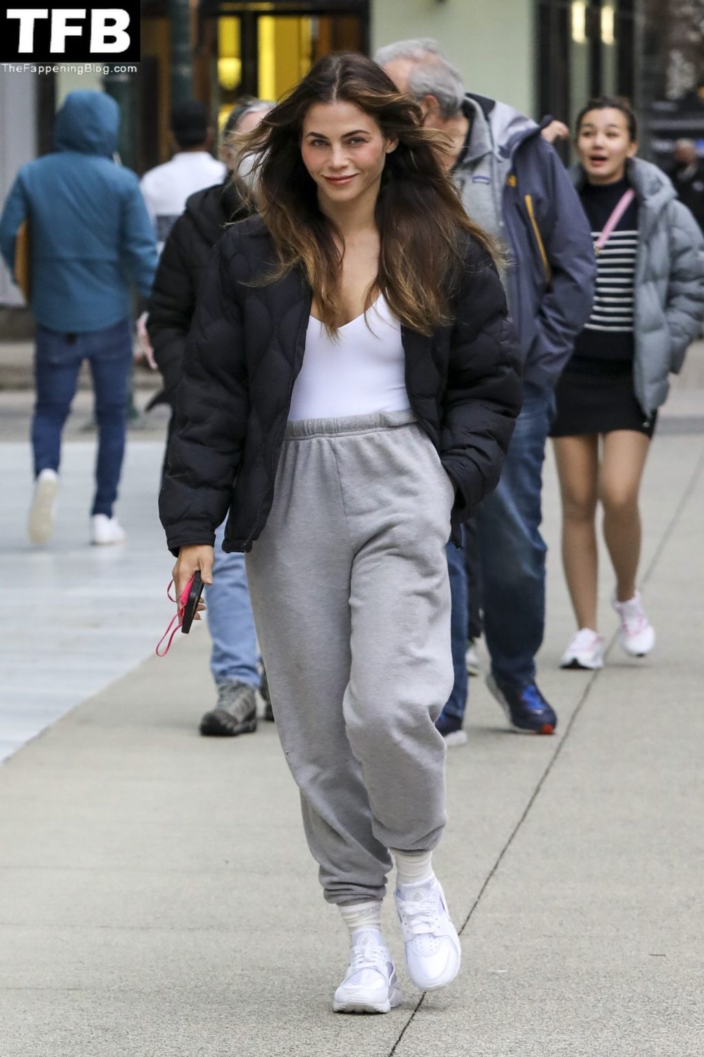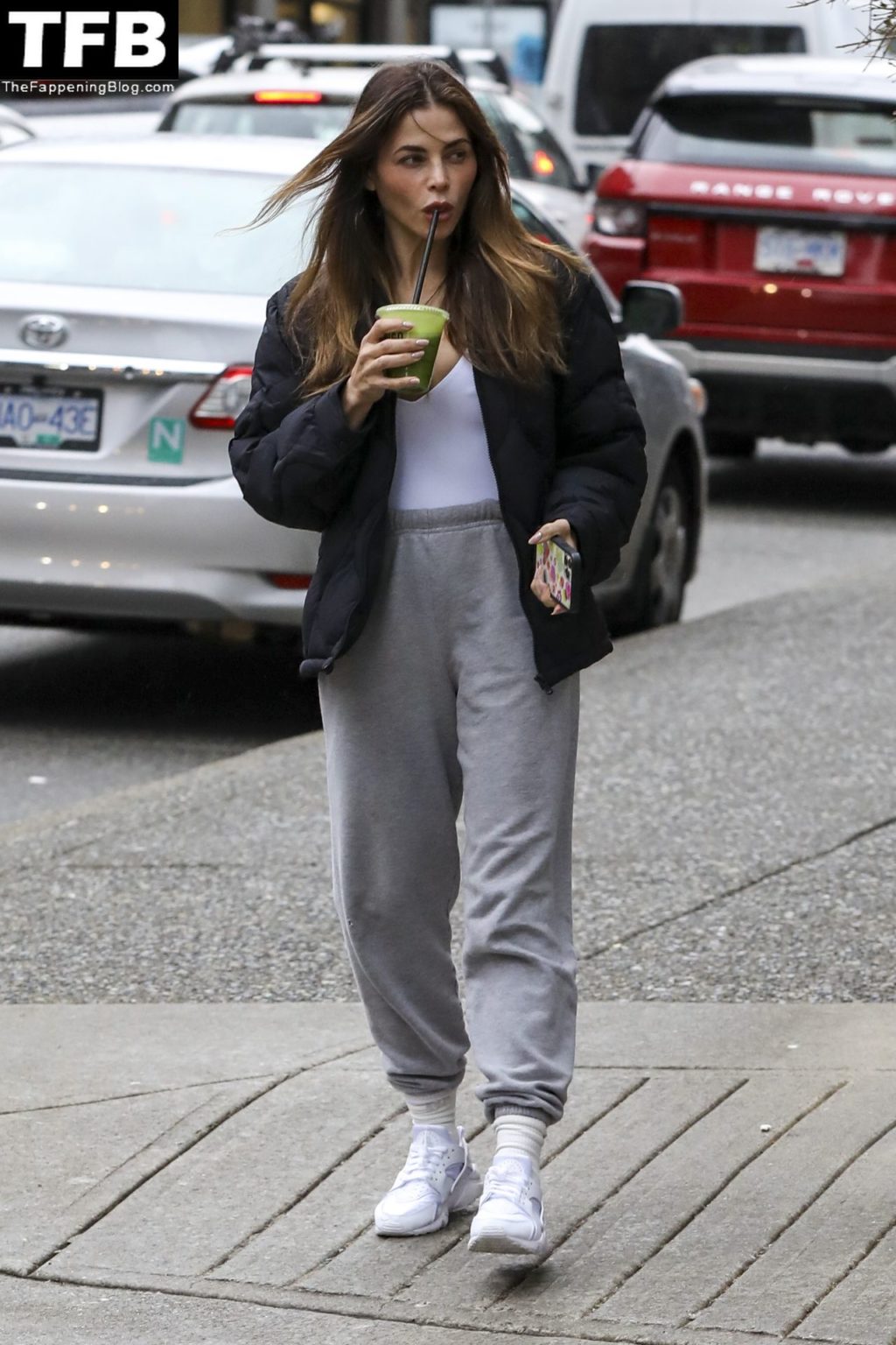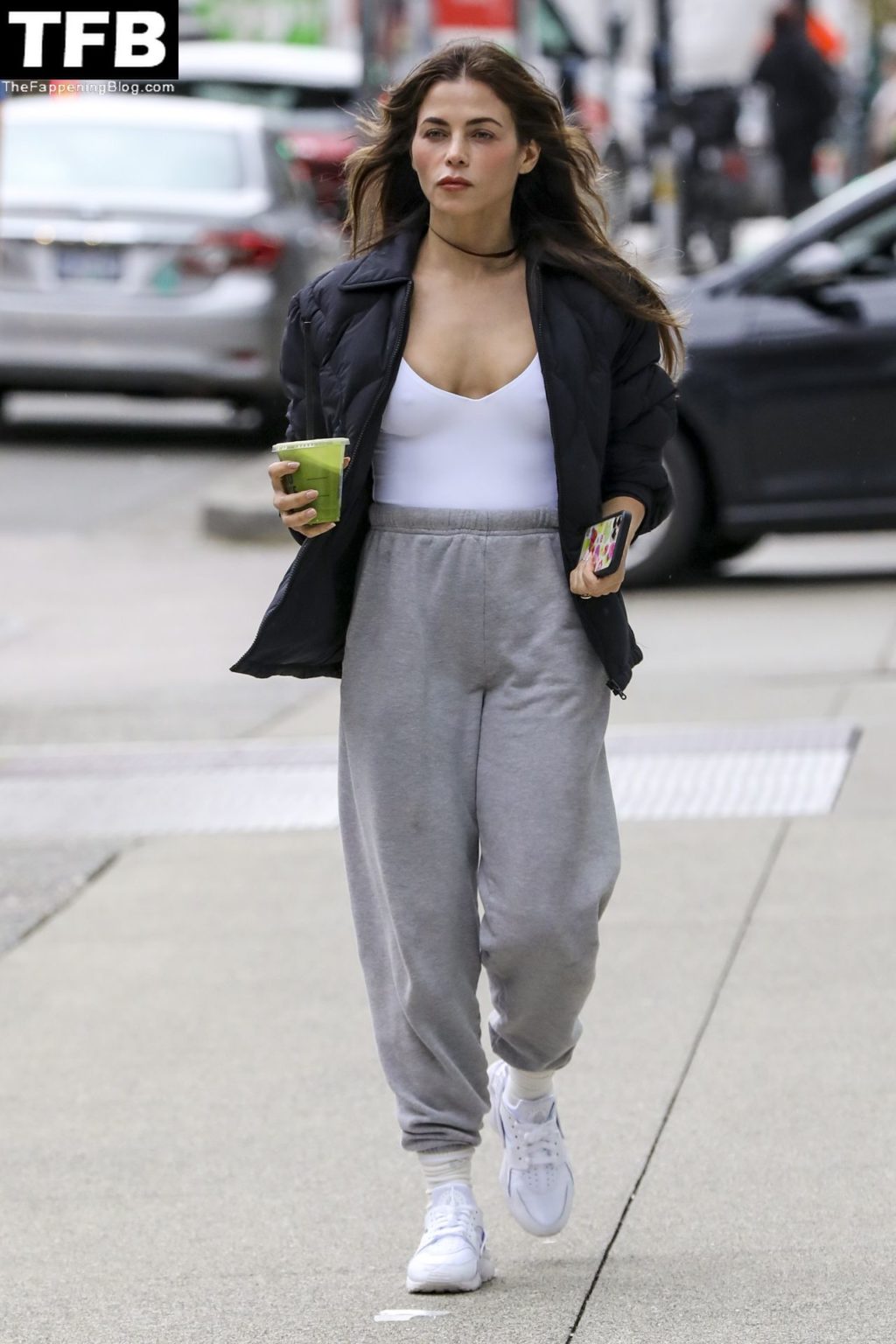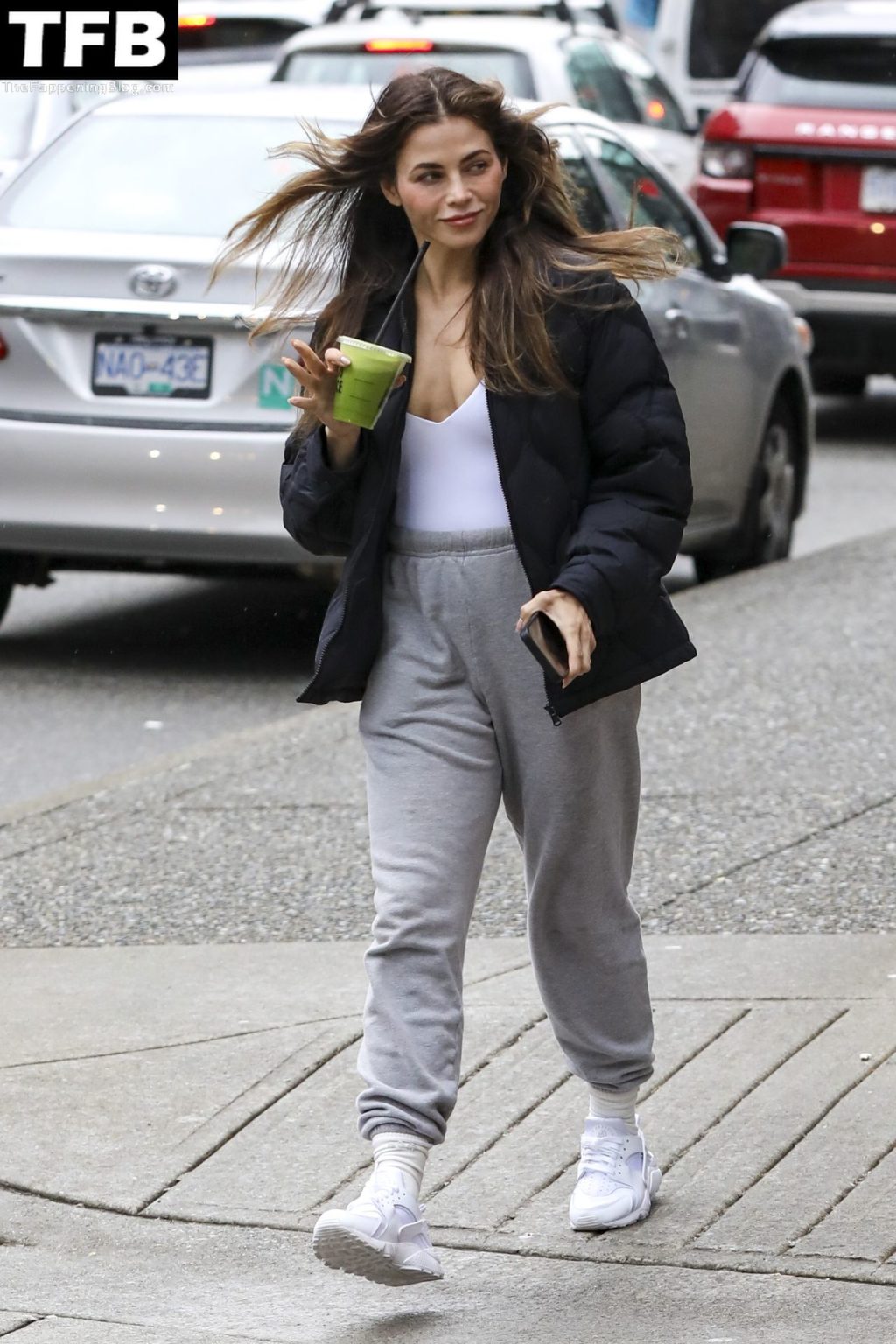 Дженна Дьюэн выходит за зеленым соком в Ванкувере, 30.03.2022. 41-летняя актриса была одета в черный пиджак, белую футболку, серые спортивные штаны и белые кроссовки.