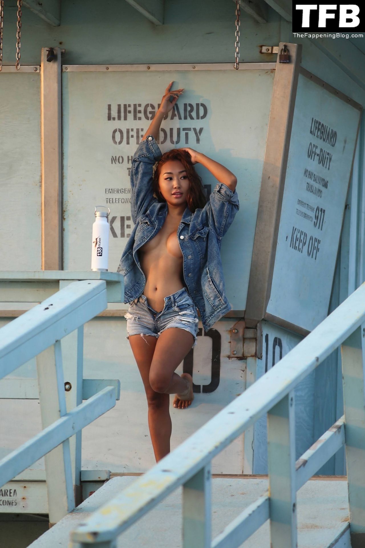 Нора Кызы выглядит потрясающе в оверсайз джинсовой куртке без бюстгальтера и в джинсовых шортах, позируя для фотосессии 138 Water в Малибу, 29.08.2021.