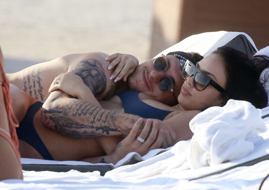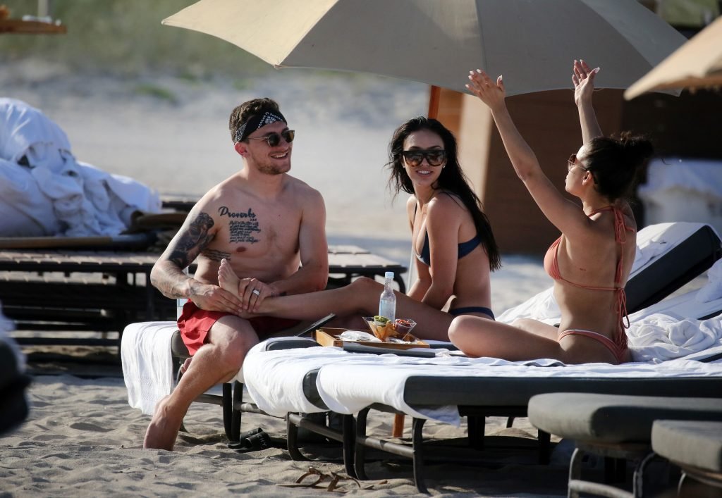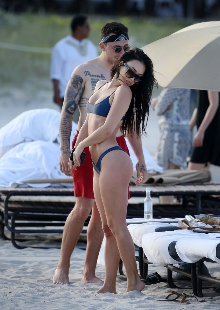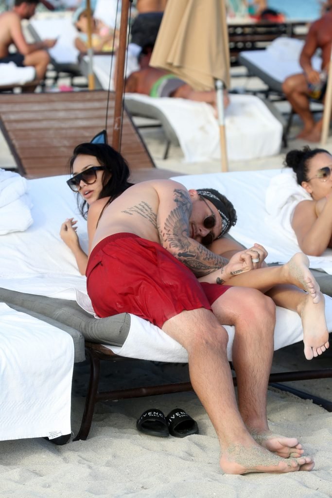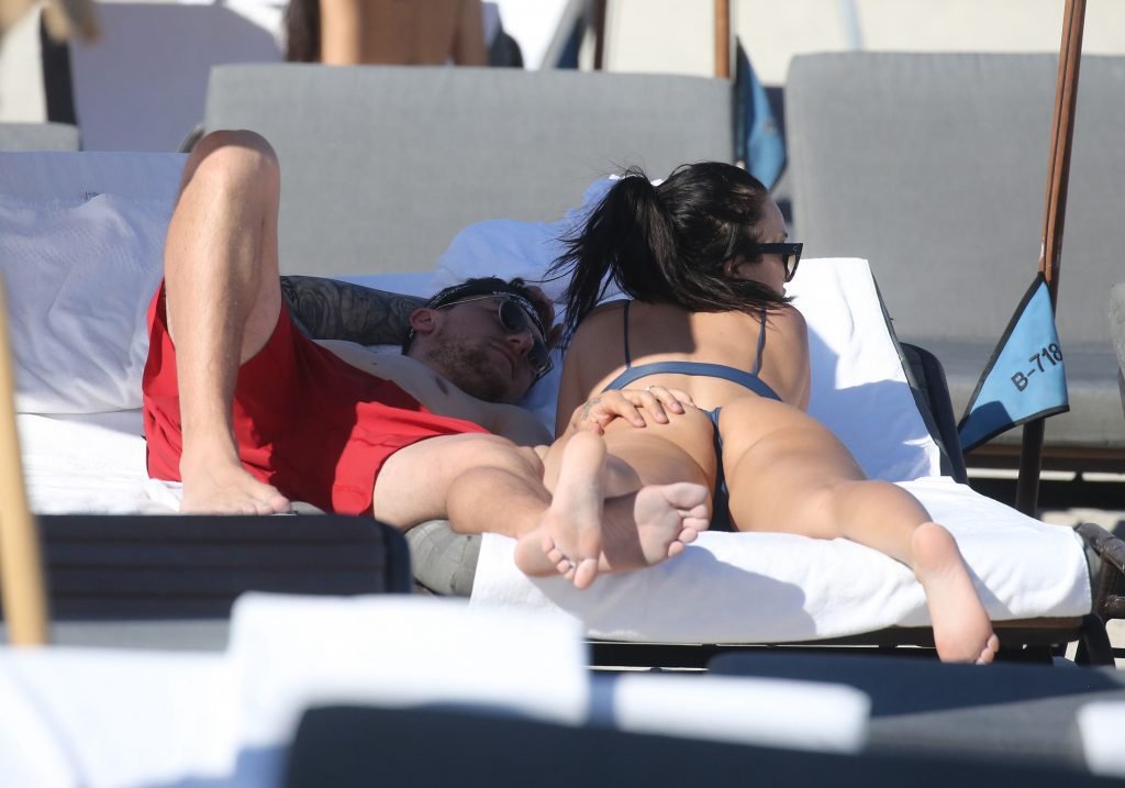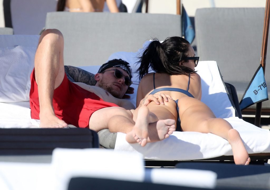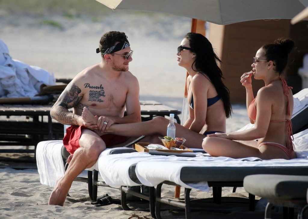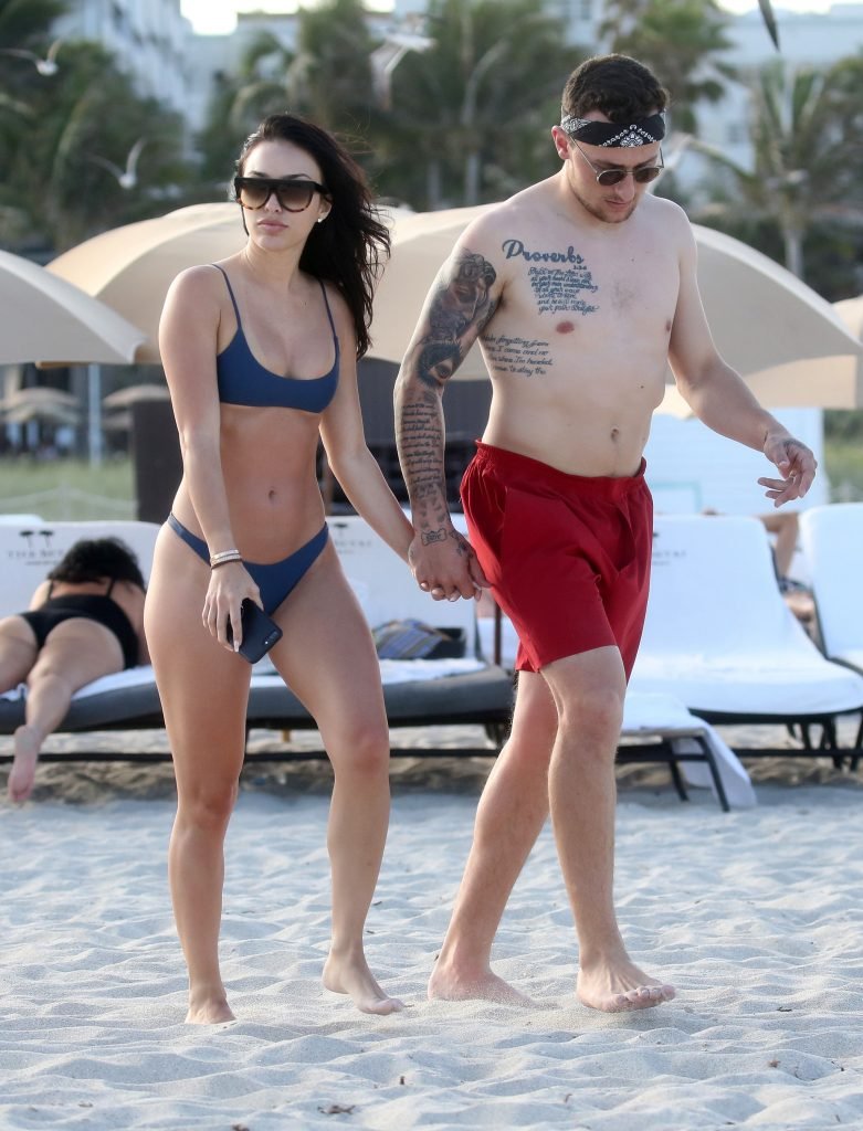 Johnny Manziel и его невеста модель Bre Tiesi в бикини демонстрируют свои пляжные тела и много публичных проявлений чувств в Майами, 01.03.2018.