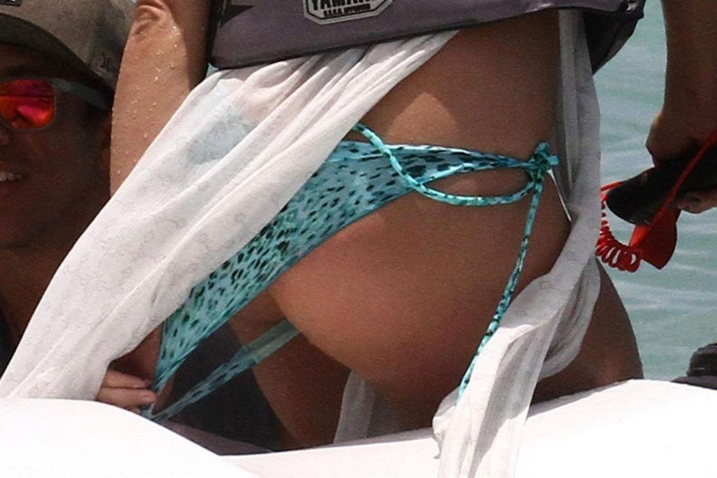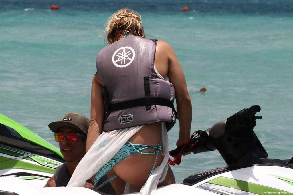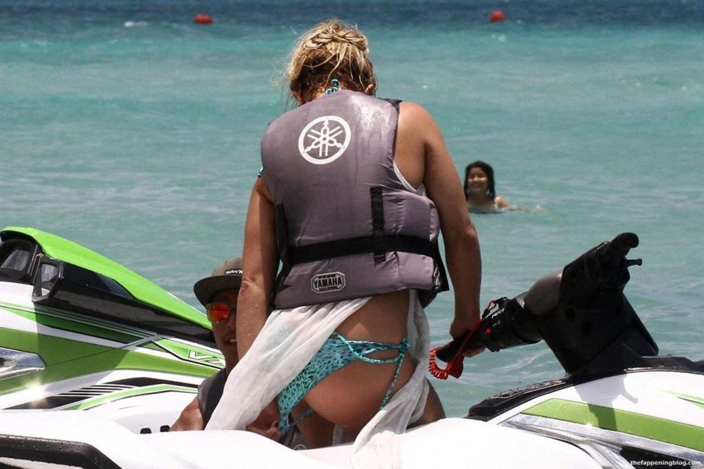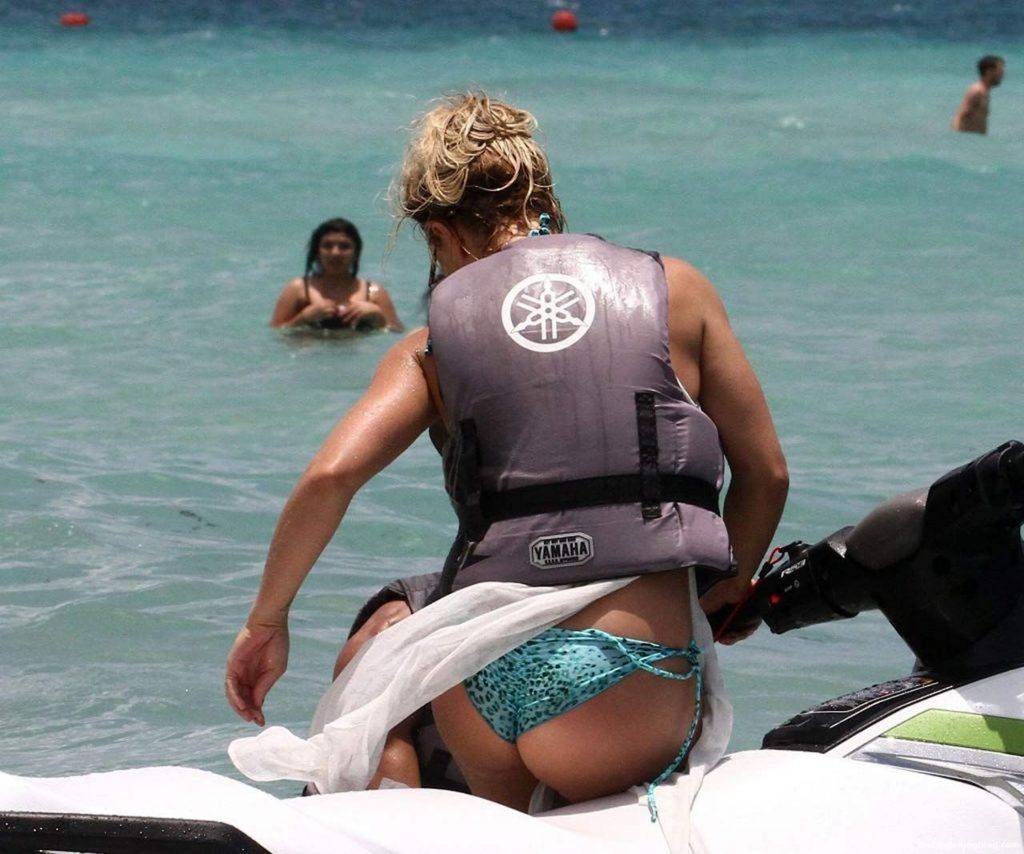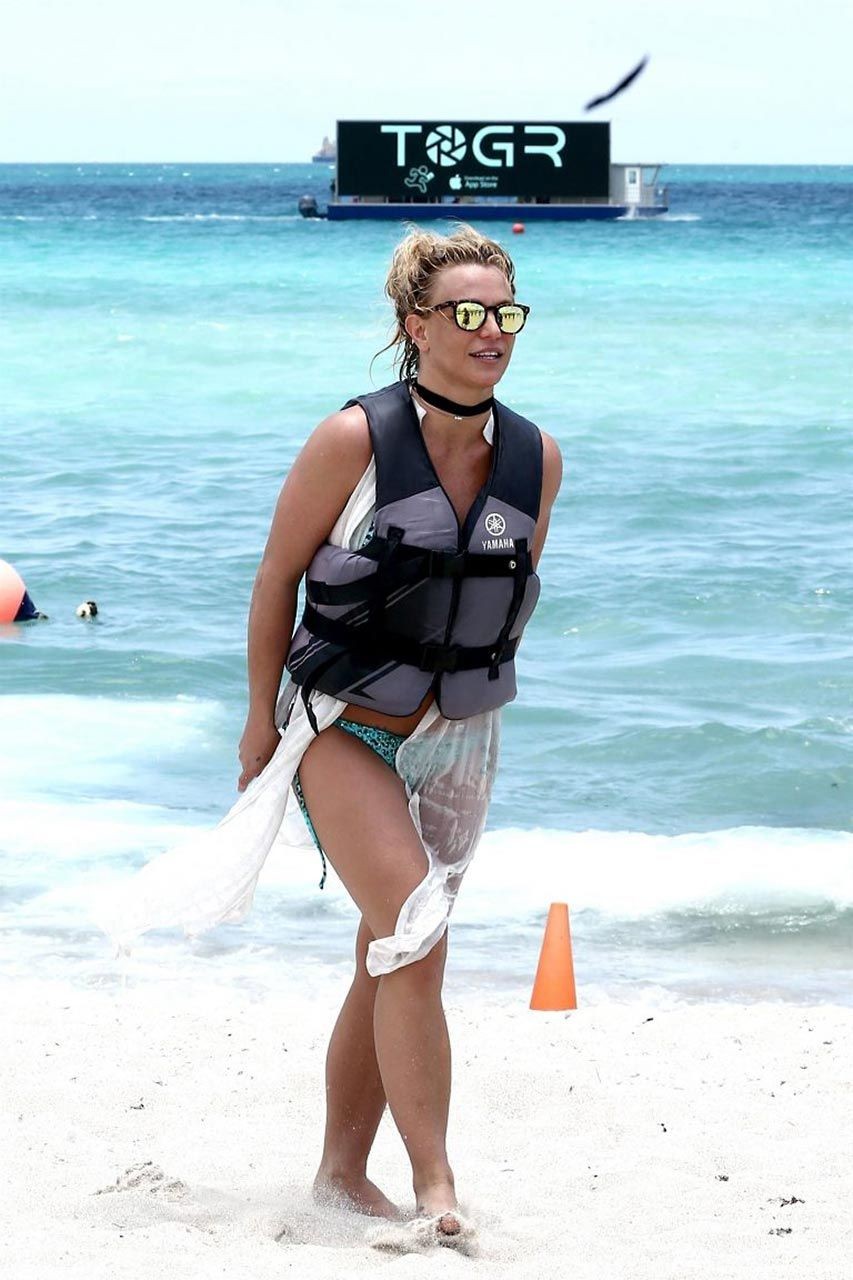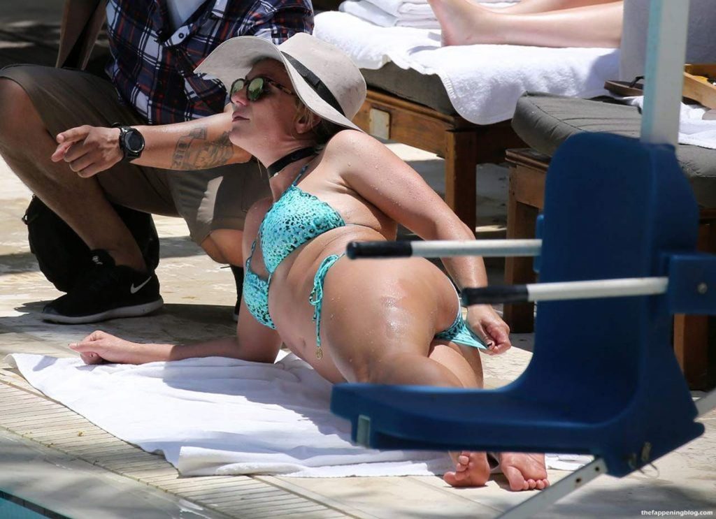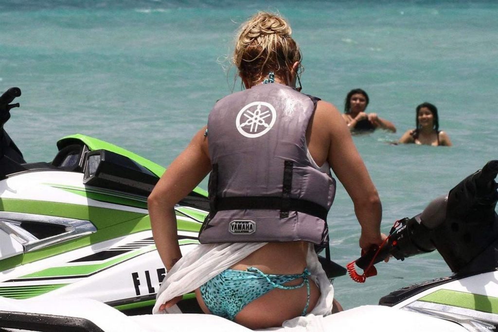 Britney Spears’s bikini photos are here, and she’s looking quite good comparing how we’re used to seeing her drunk & disgusting! The famous singer was sunbathing and enjoying the day at the poolside in Miami. So you can see her wet ass and nice figure here! Then Britney Spears went to ride a jet ski and had a slight bikini malfunction. Her panties are so unnecessary here, so she pulled them out of her ass, and the paparazzi almost saw her pussy! We aren’t happy that much, so all you will see are Spears in a bikini!