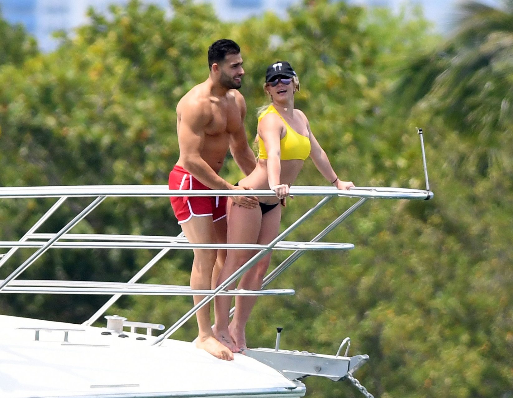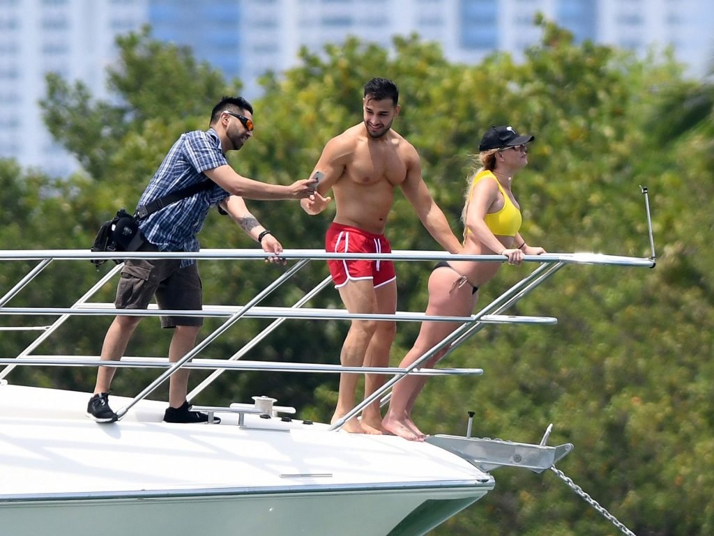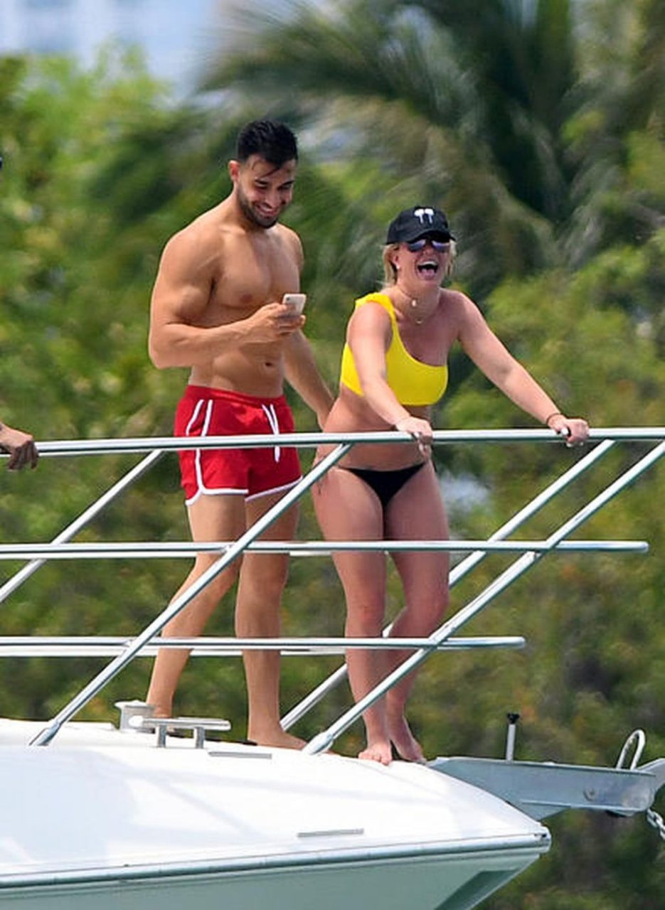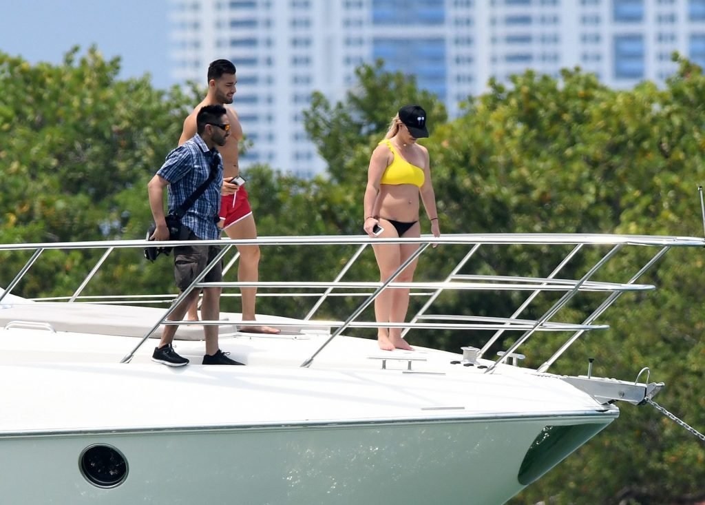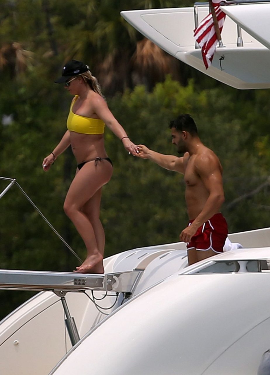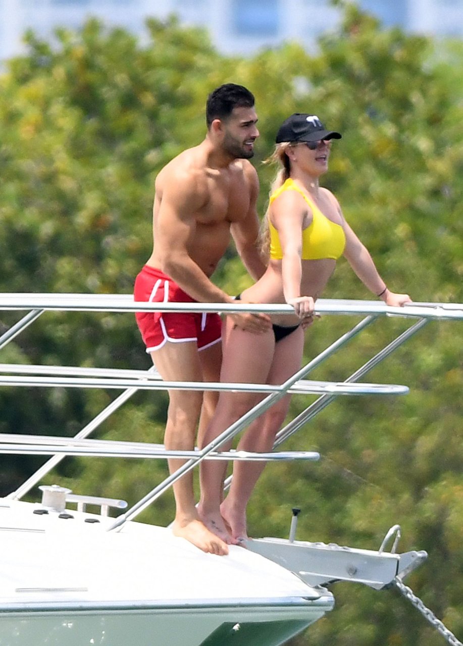 Britney Spears носит желтый бикини, проводя насыщенный событиями день на яхте с бойфрендом Сэмом Асгари в Майами, 06/08/2019.
