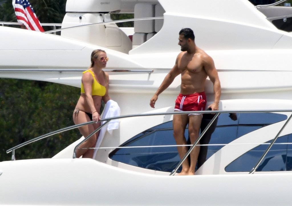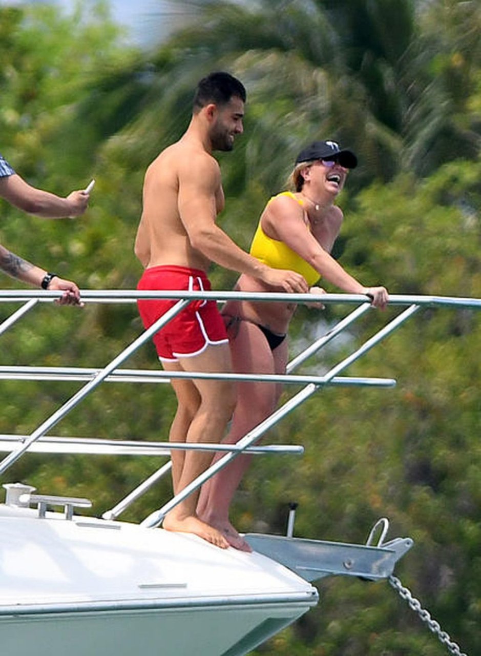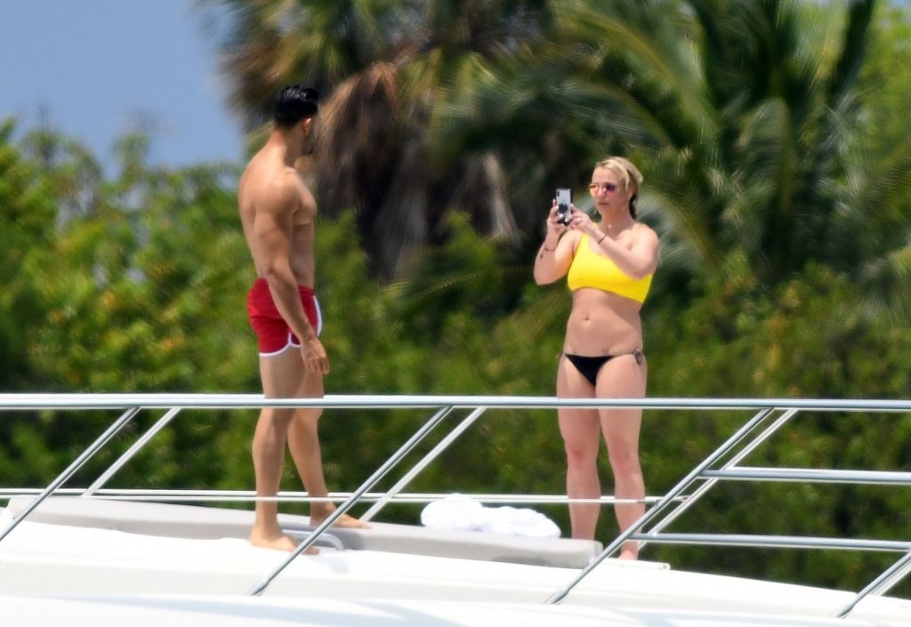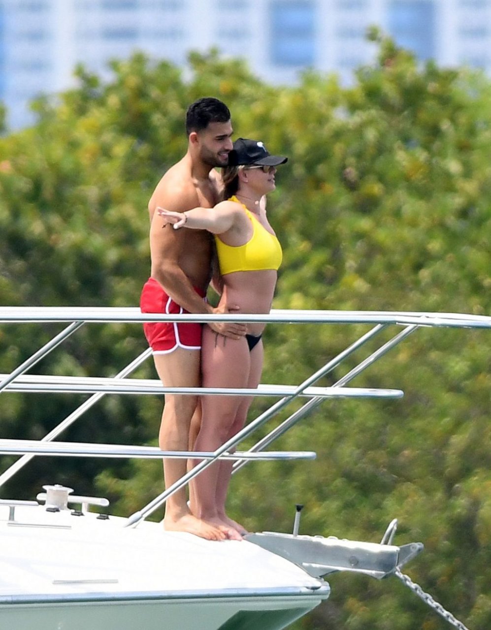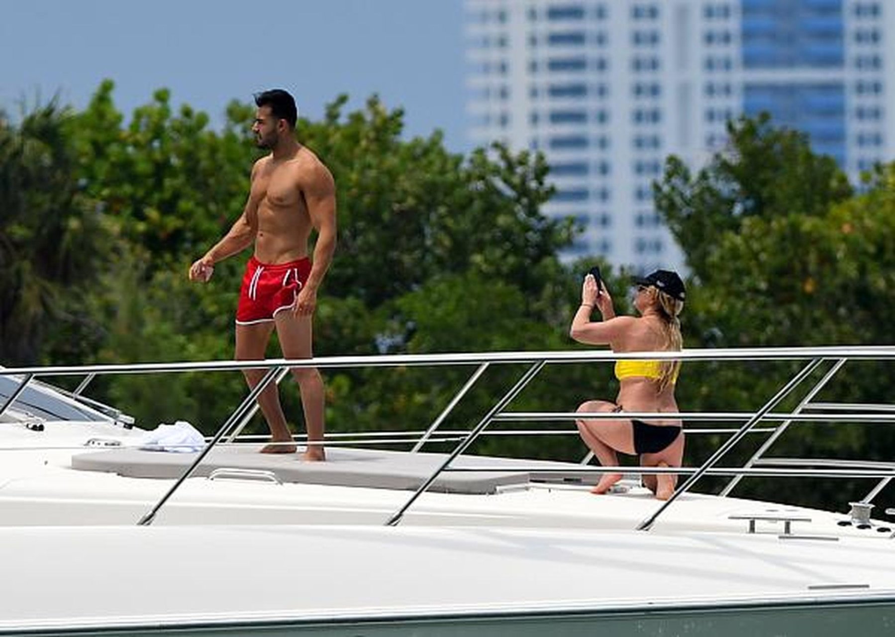 Britney Spears носит желтый бикини, проводя насыщенный событиями день на яхте с бойфрендом Сэмом Асгари в Майами, 06/08/2019.