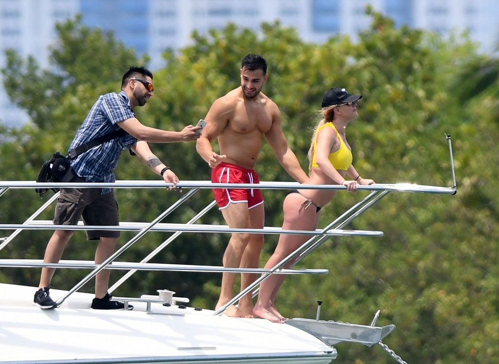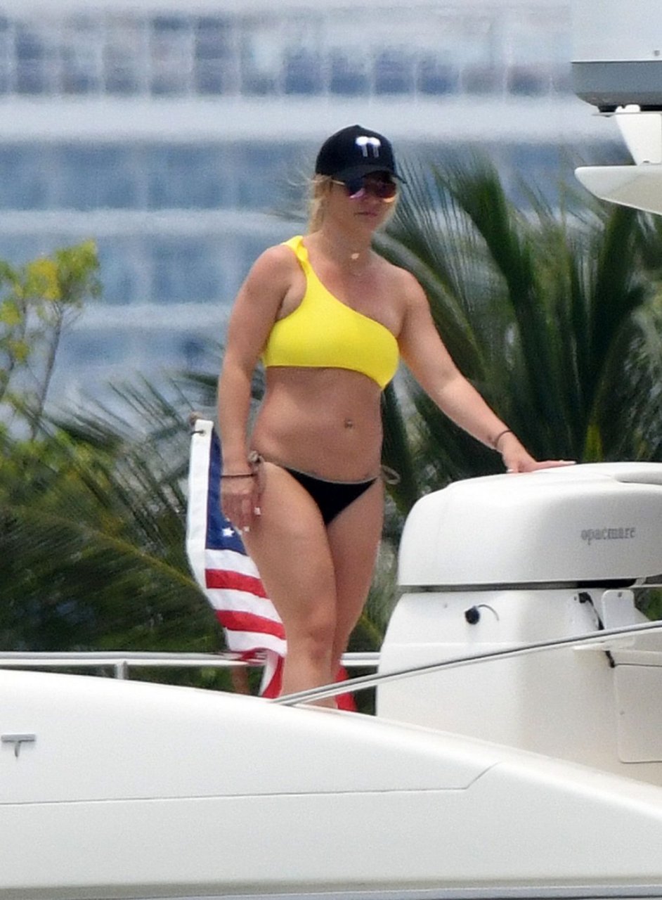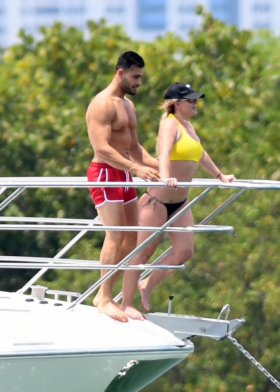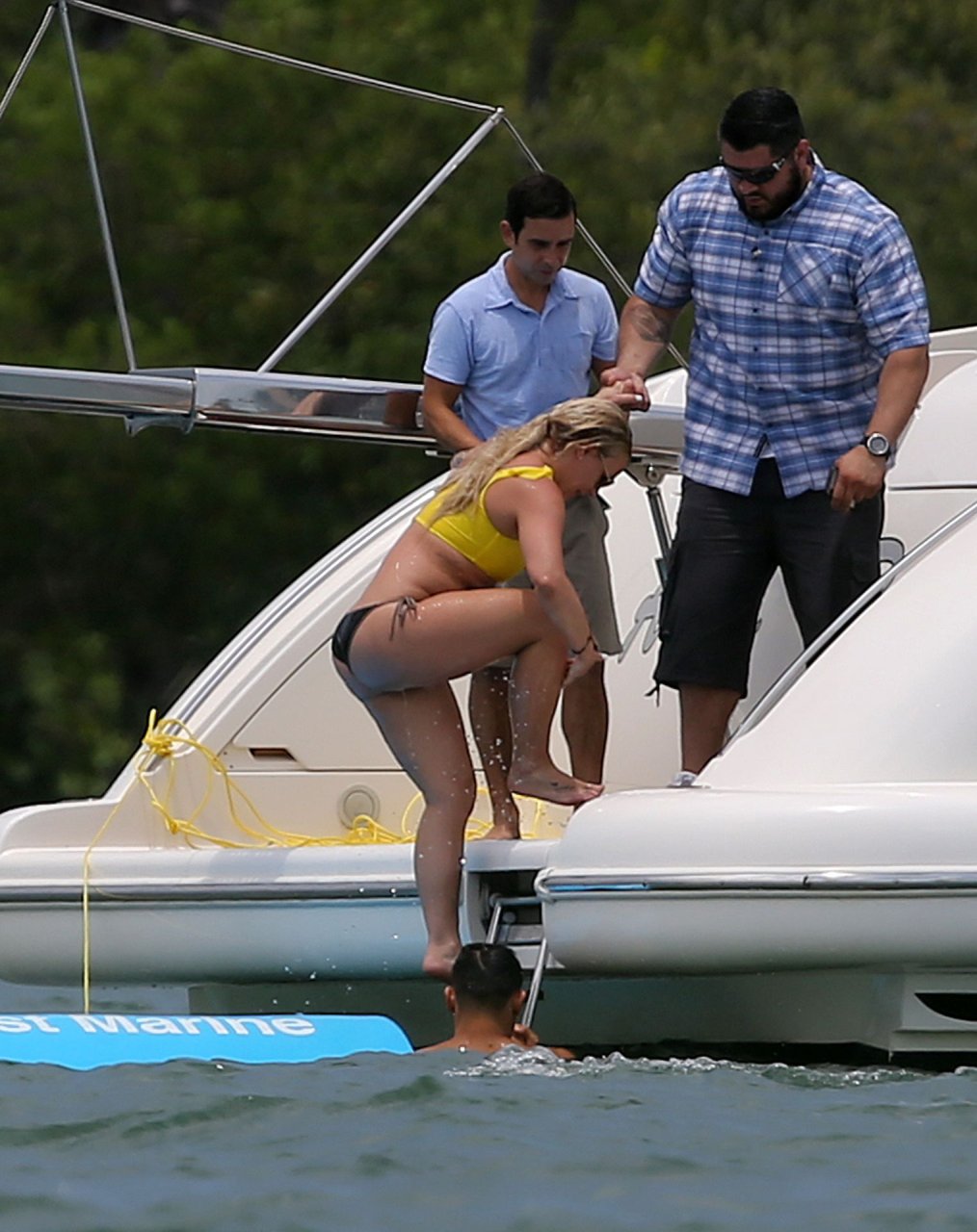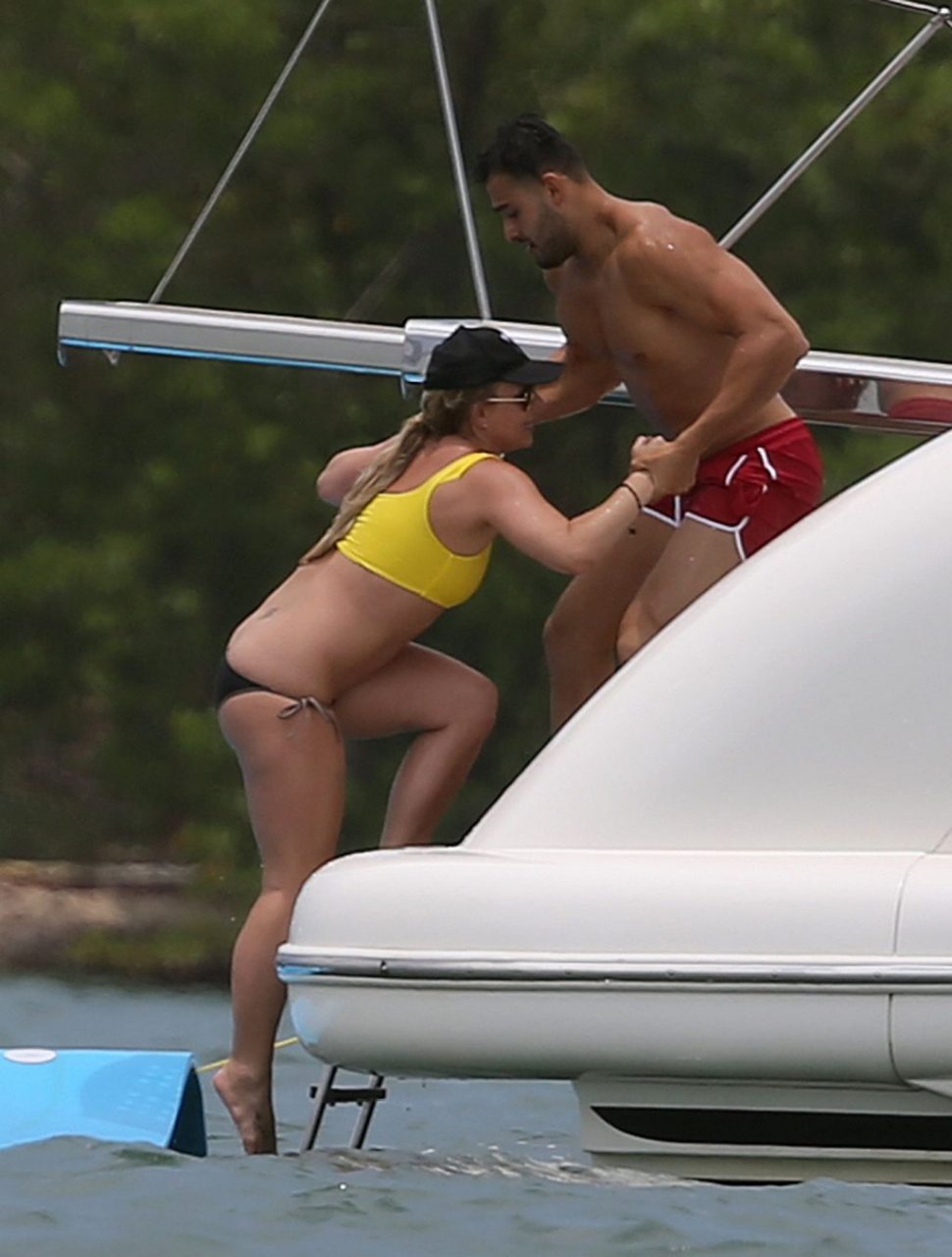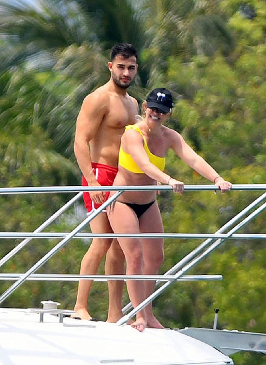 Britney Spears носит желтый бикини, проводя насыщенный событиями день на яхте с бойфрендом Сэмом Асгари в Майами, 06/08/2019.
