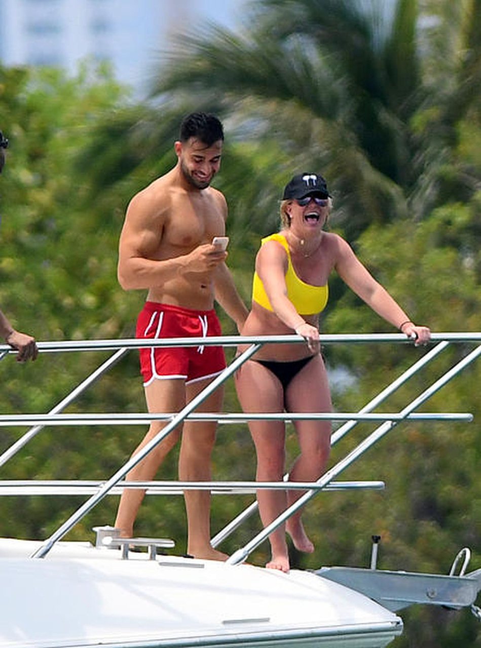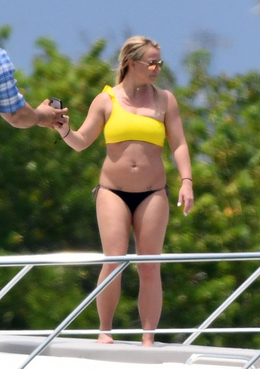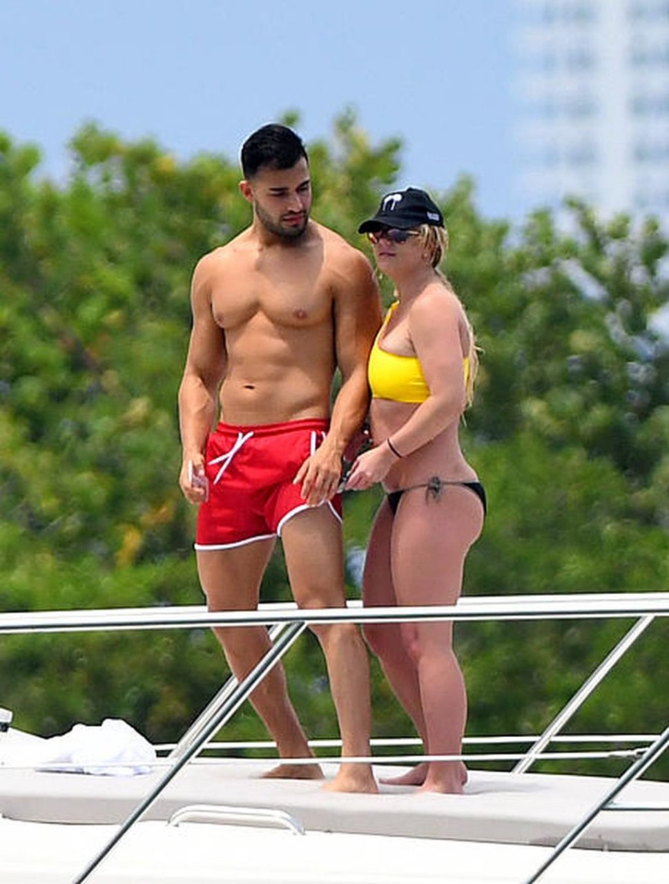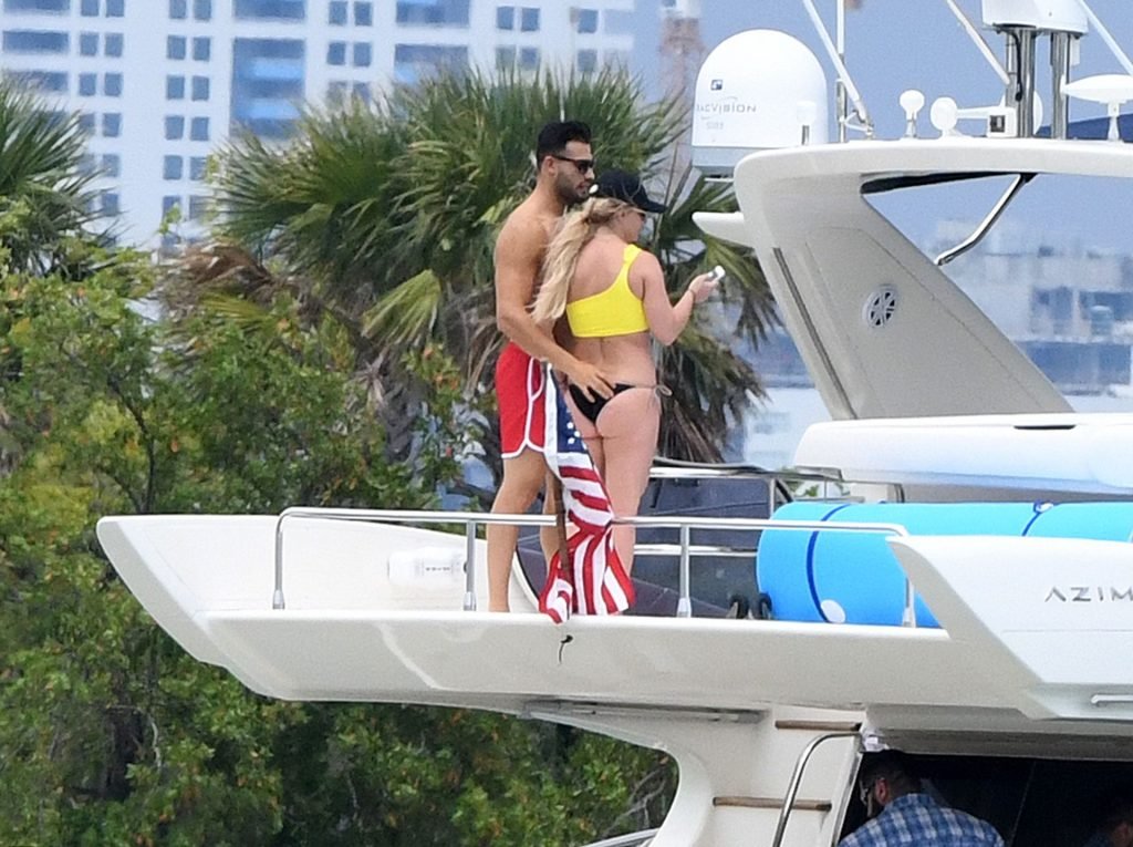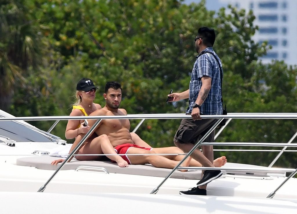 Britney Spears носит желтый бикини, проводя насыщенный событиями день на яхте с бойфрендом Сэмом Асгари в Майами, 06/08/2019.