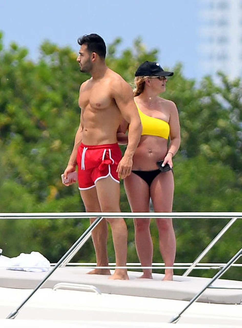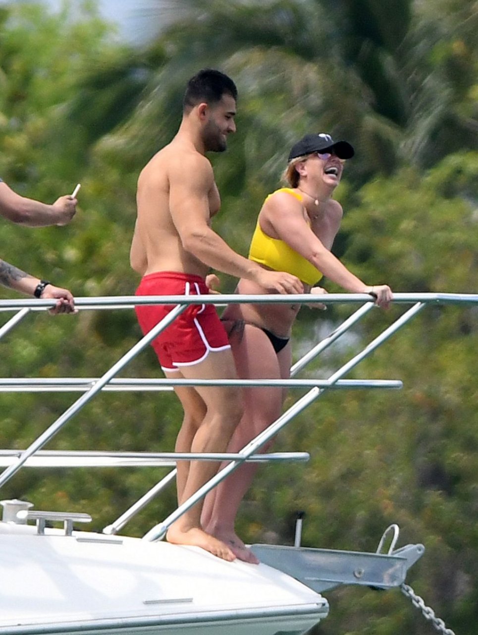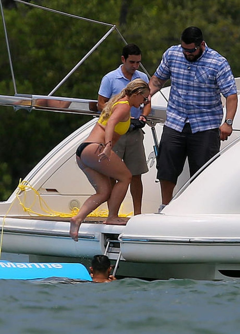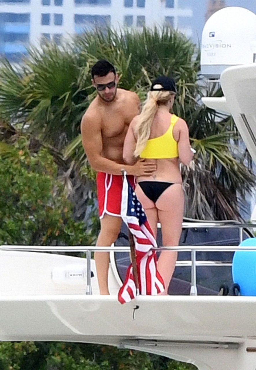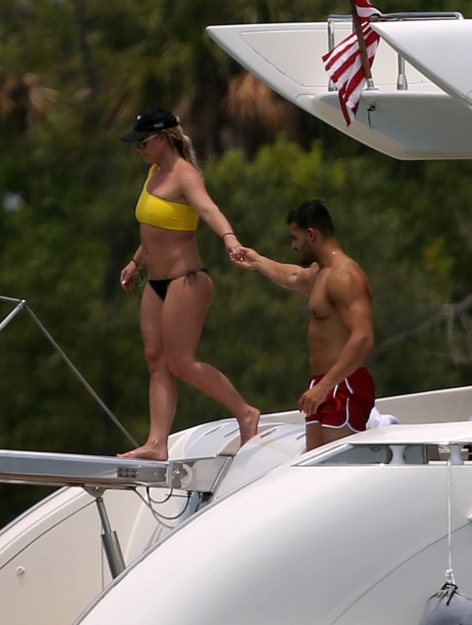 Britney Spears носит желтый бикини, проводя насыщенный событиями день на яхте с бойфрендом Сэмом Асгари в Майами, 06/08/2019.