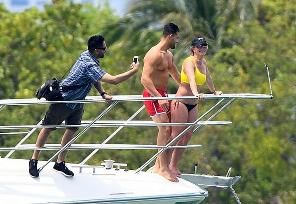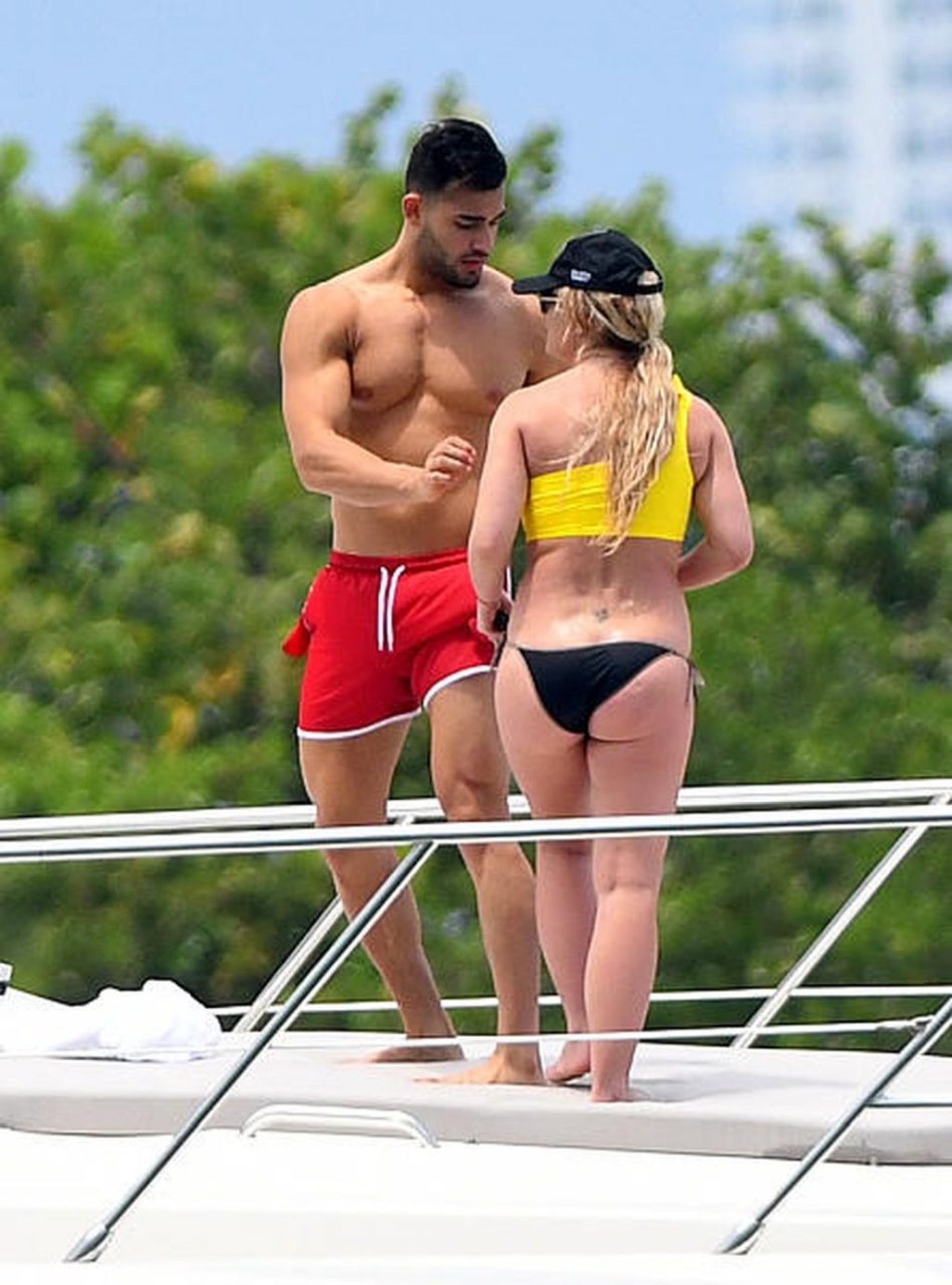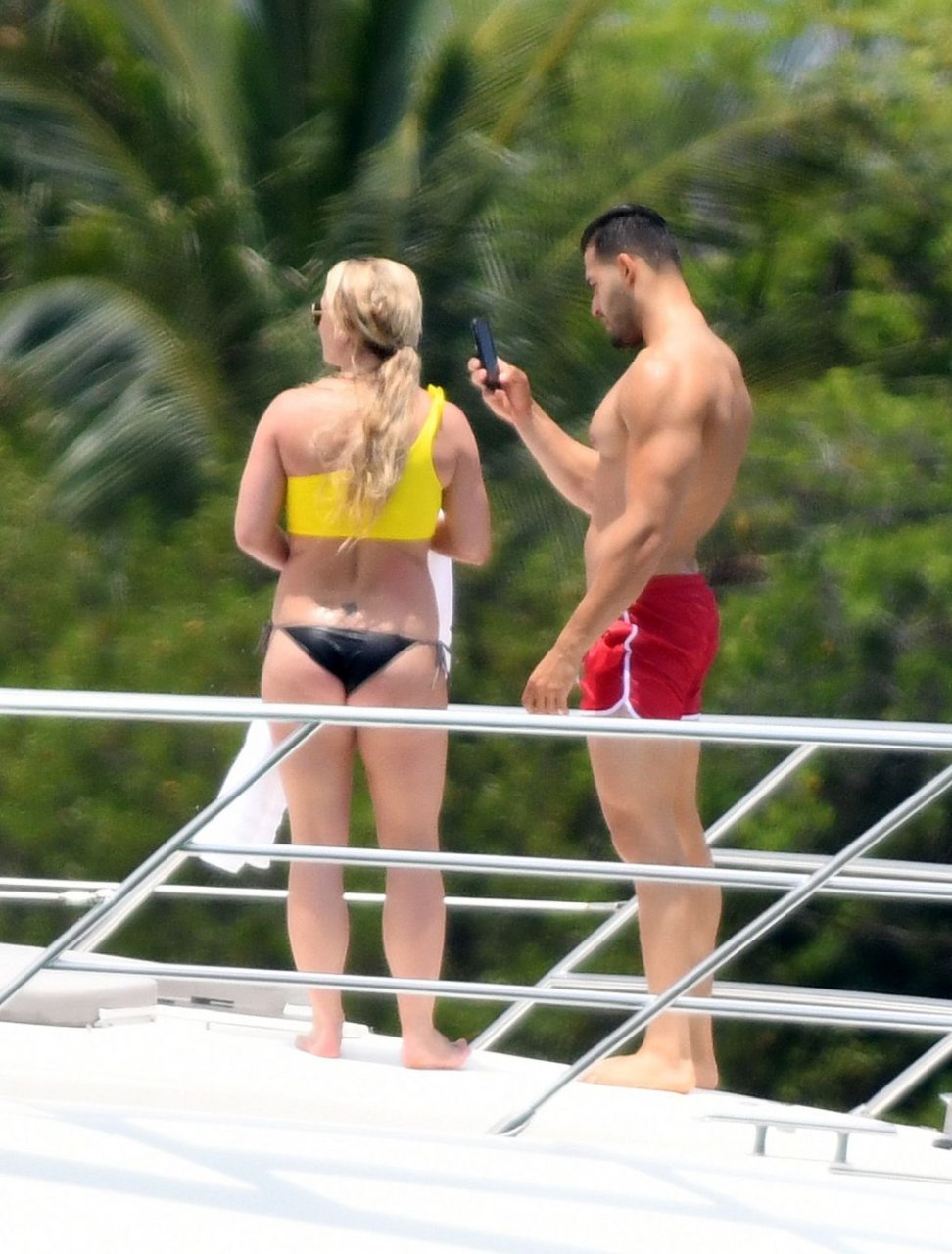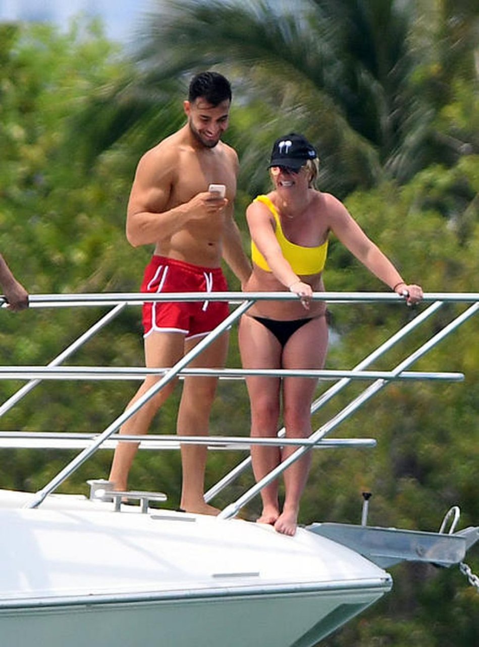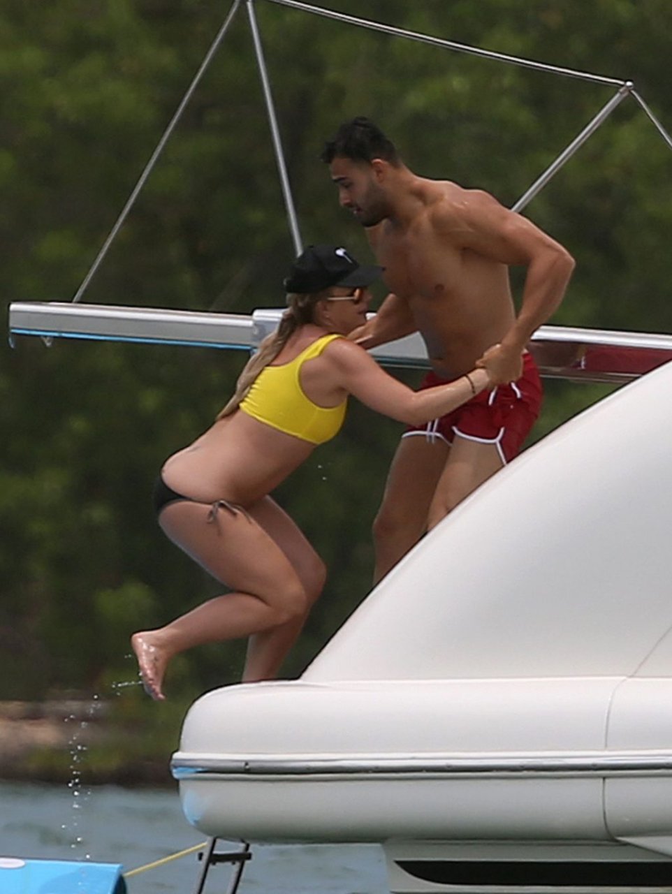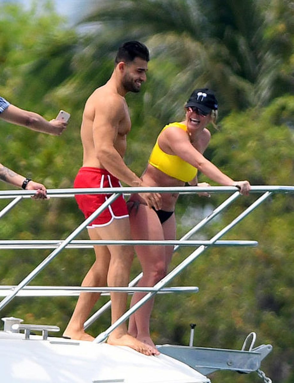 Britney Spears носит желтый бикини, проводя насыщенный событиями день на яхте с бойфрендом Сэмом Асгари в Майами, 06/08/2019.