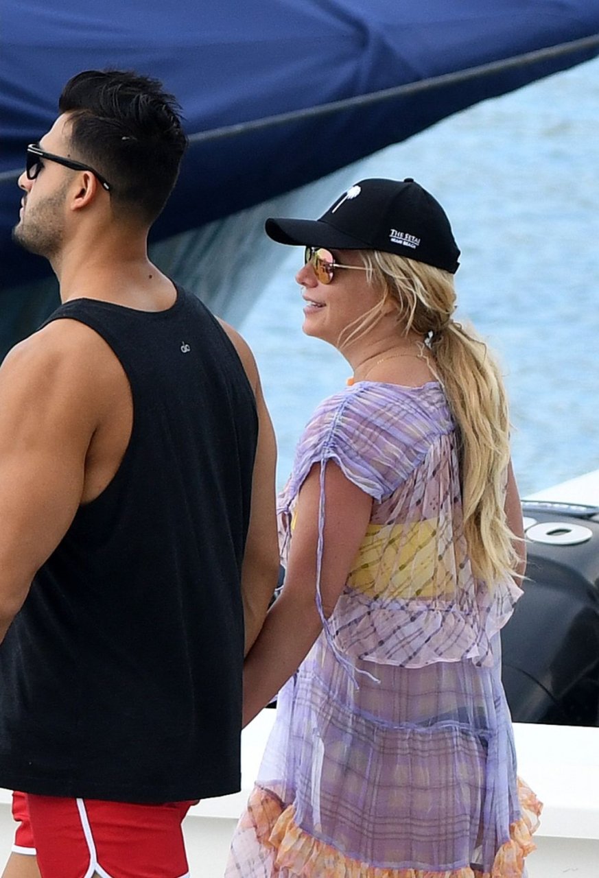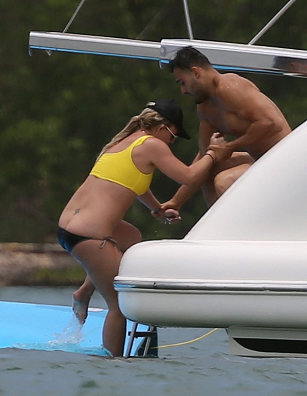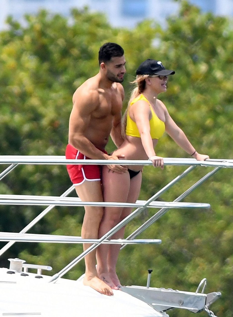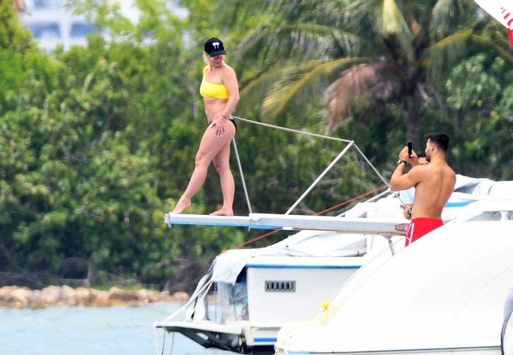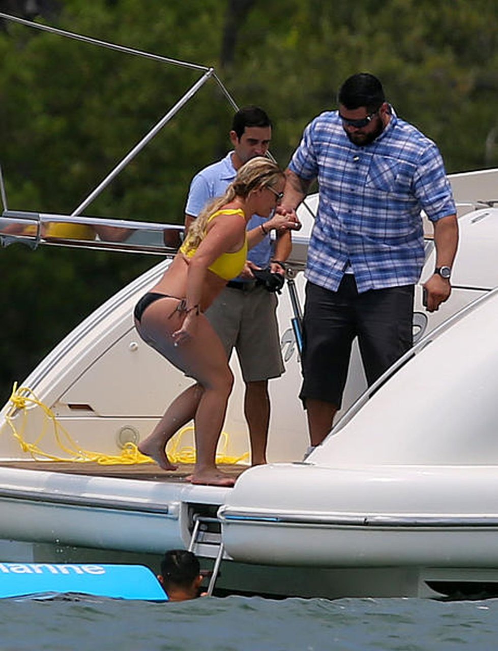 Britney Spears носит желтый бикини, проводя насыщенный событиями день на яхте с бойфрендом Сэмом Асгари в Майами, 06/08/2019.