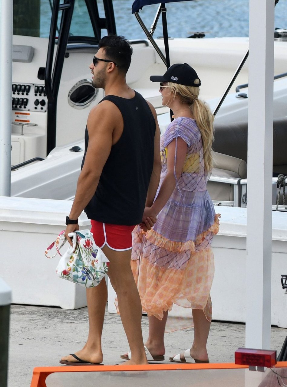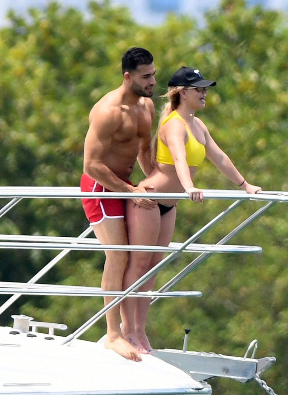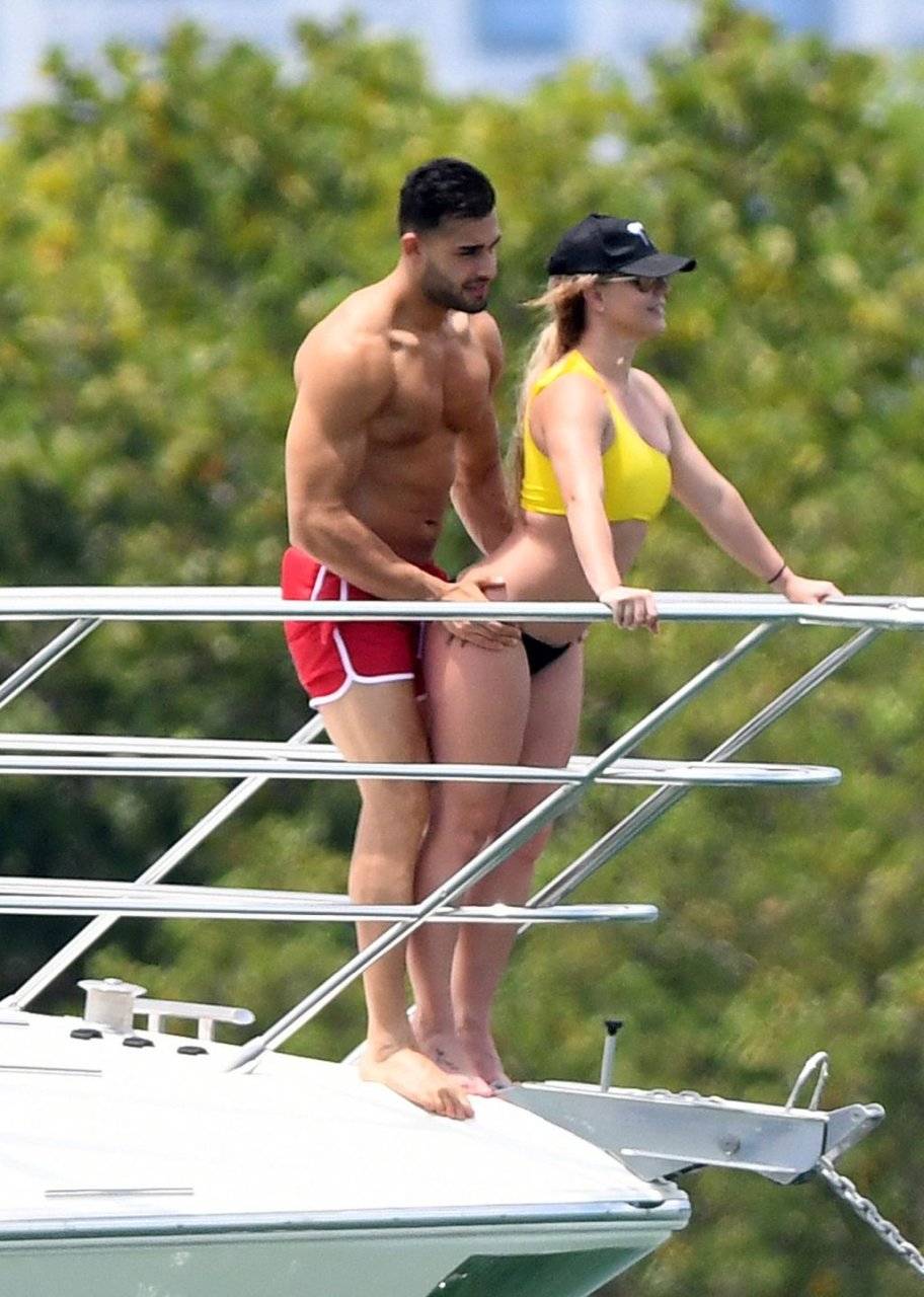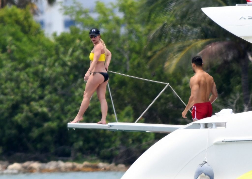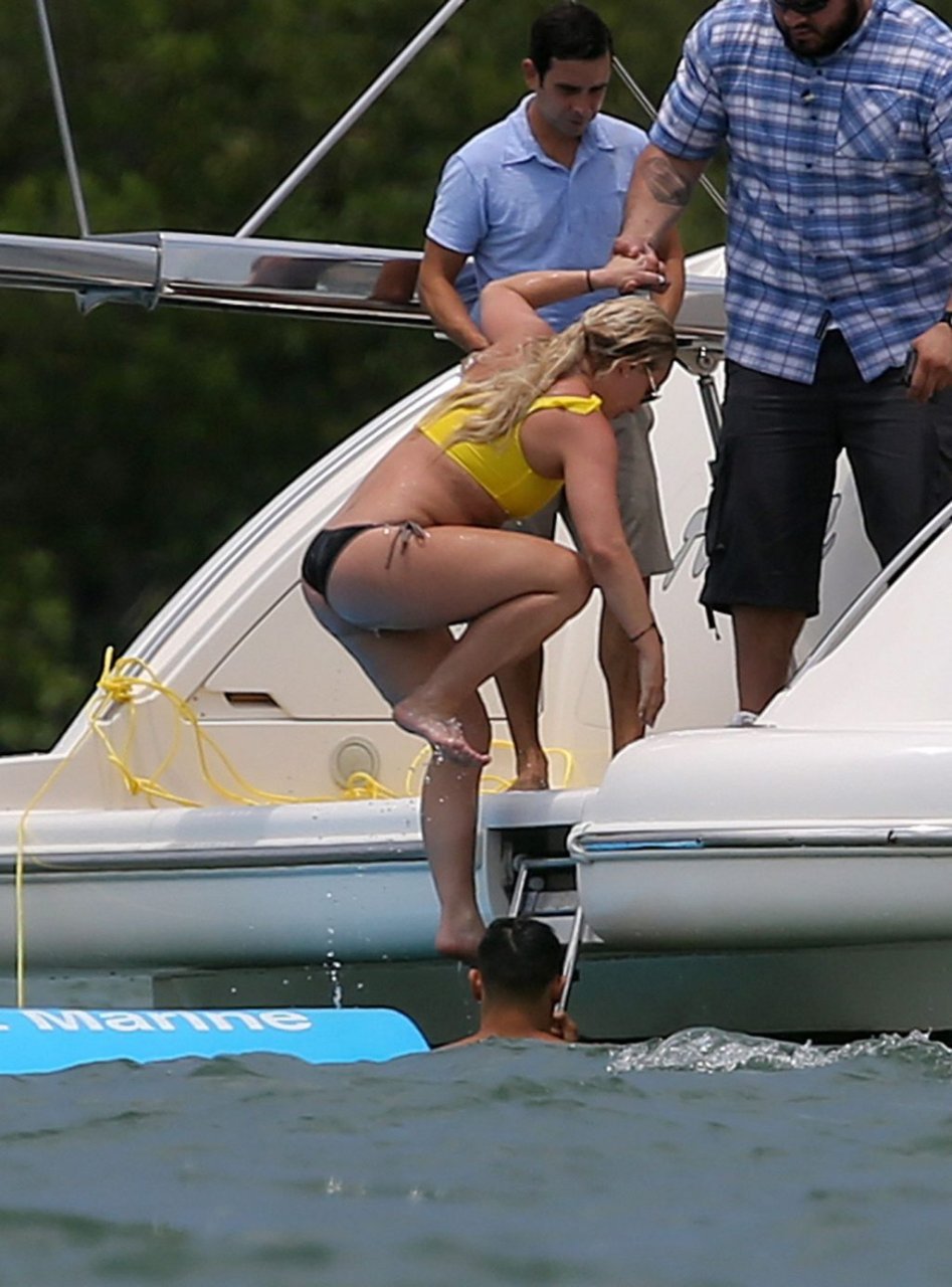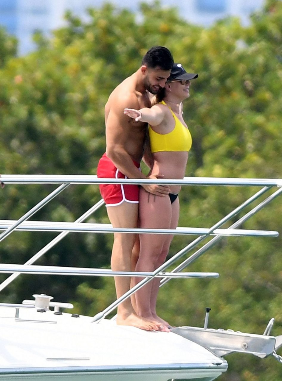 Britney Spears носит желтый бикини, проводя насыщенный событиями день на яхте с бойфрендом Сэмом Асгари в Майами, 06/08/2019.
