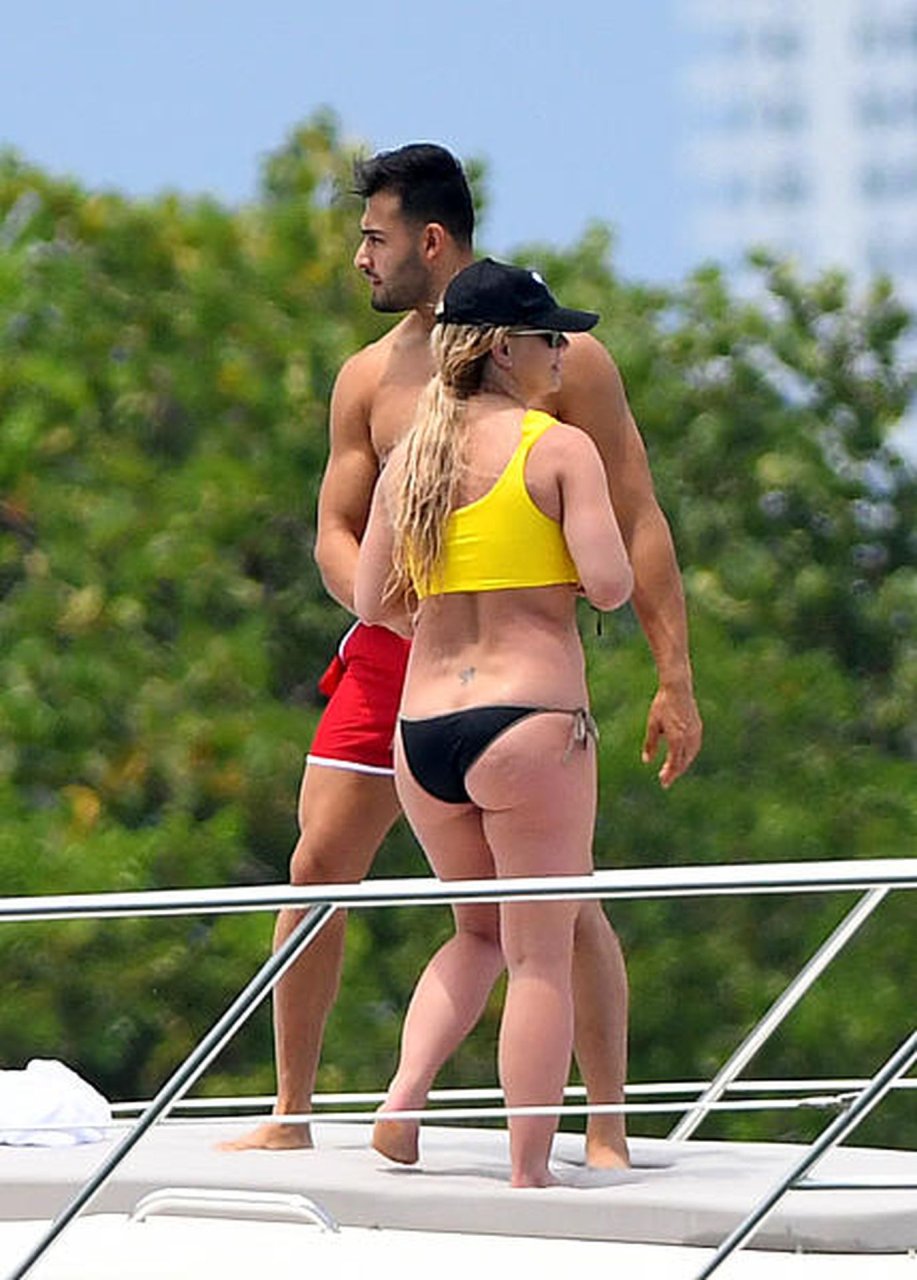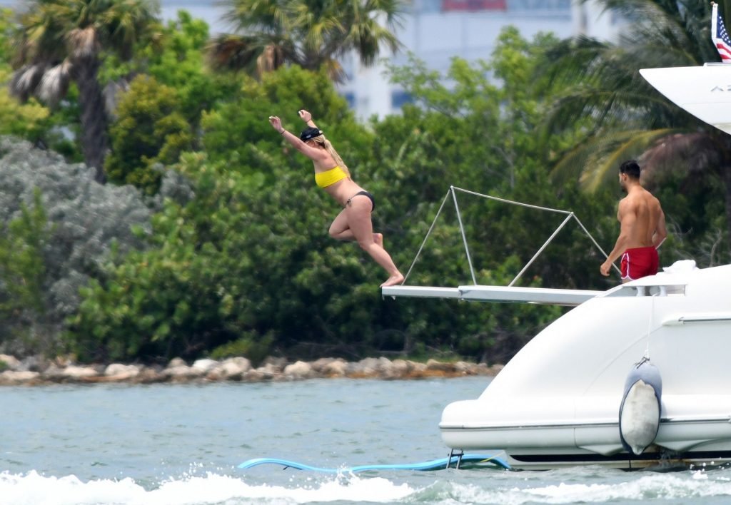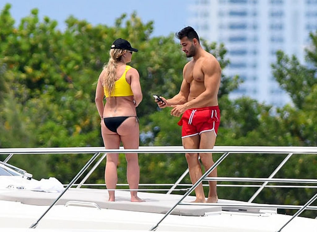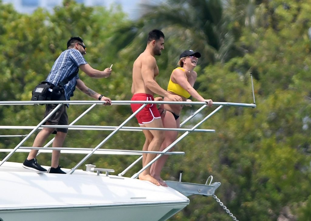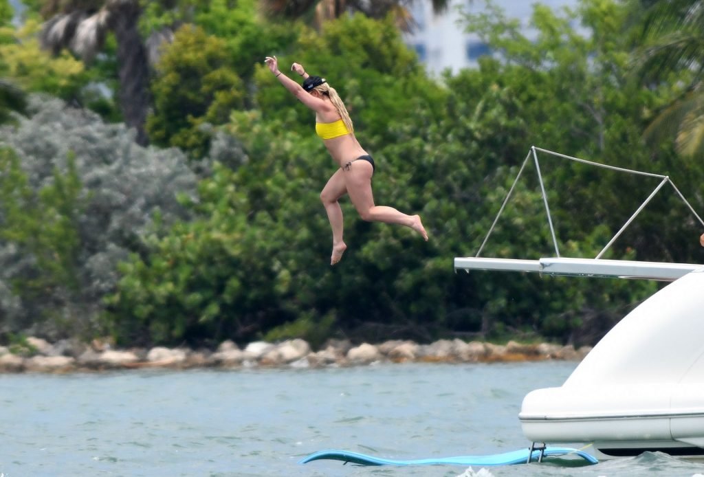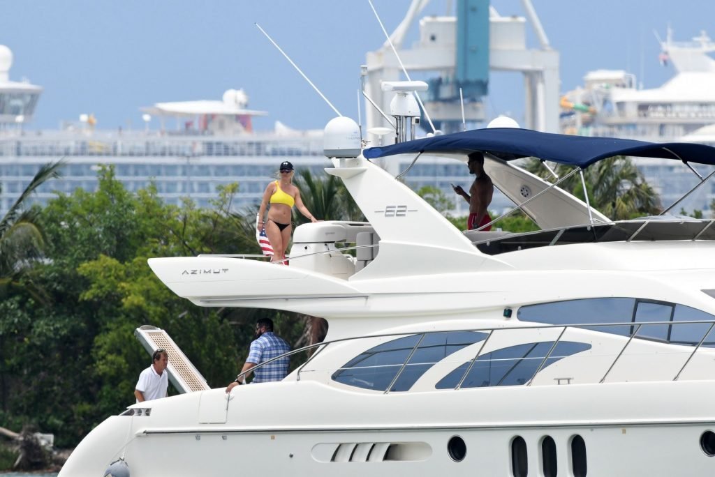 Britney Spears носит желтый бикини, проводя насыщенный событиями день на яхте с бойфрендом Сэмом Асгари в Майами, 06/08/2019.