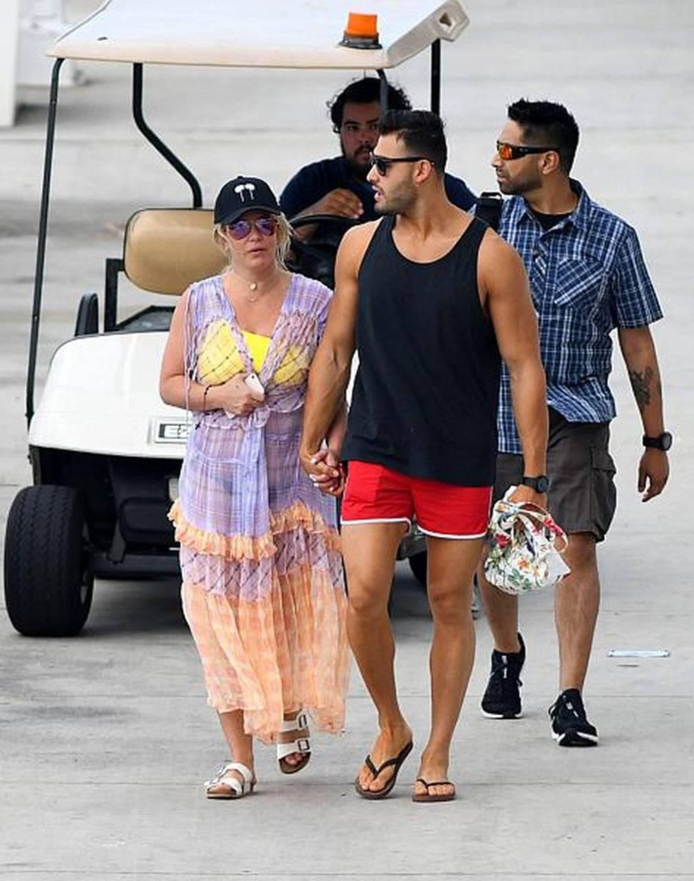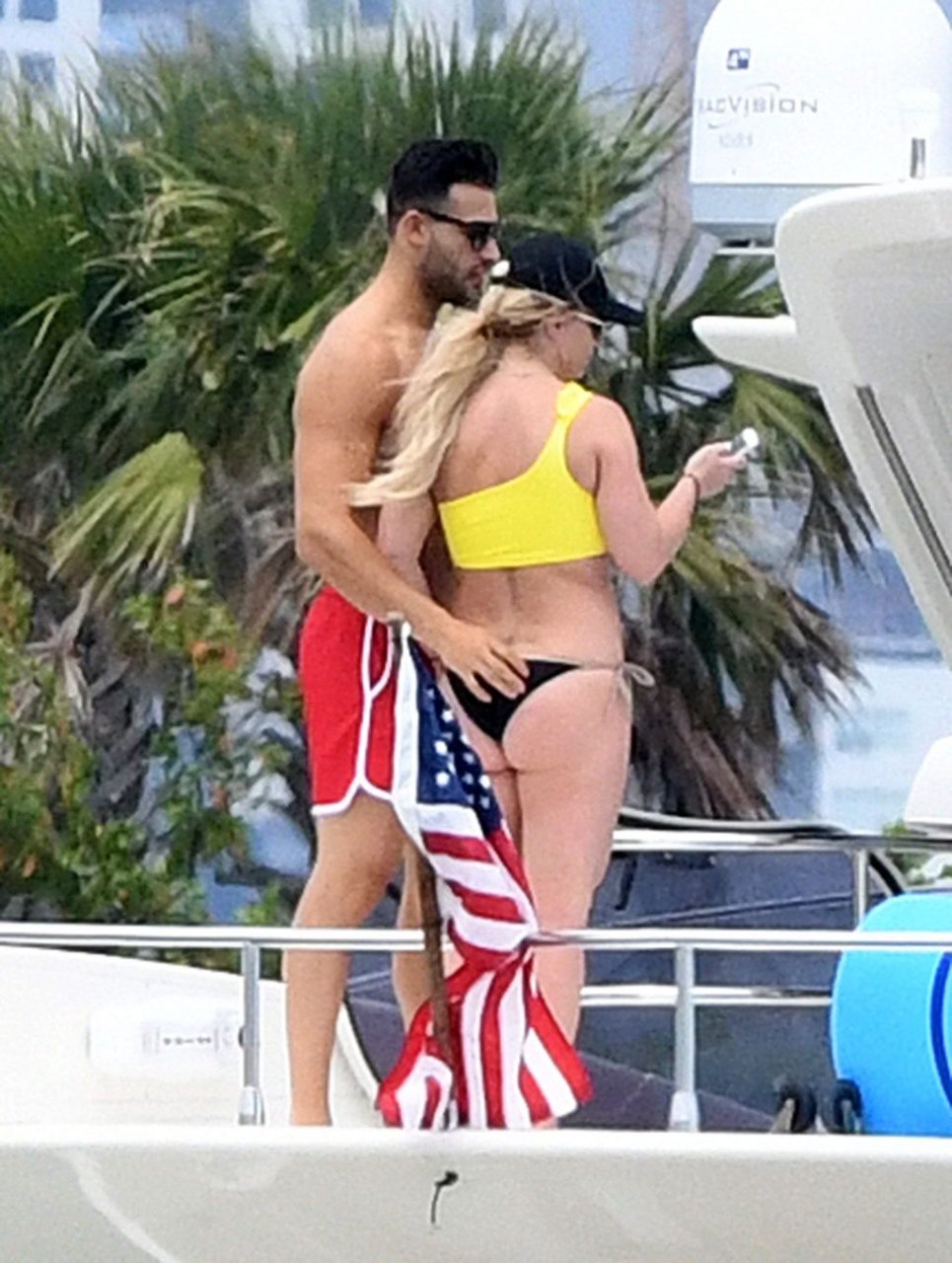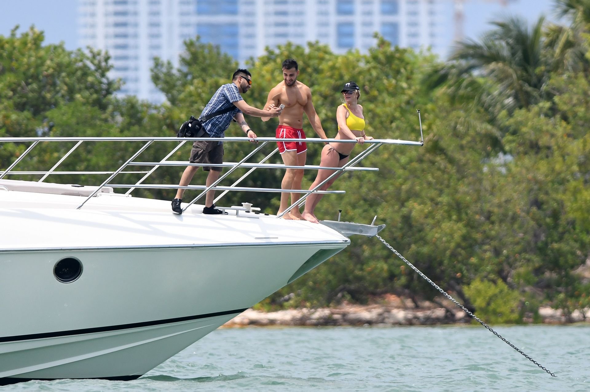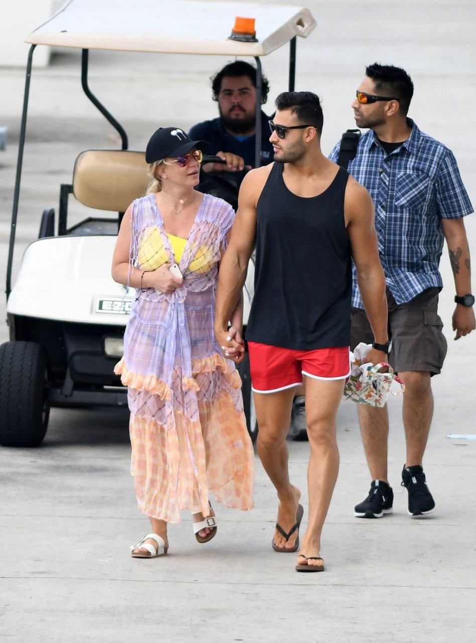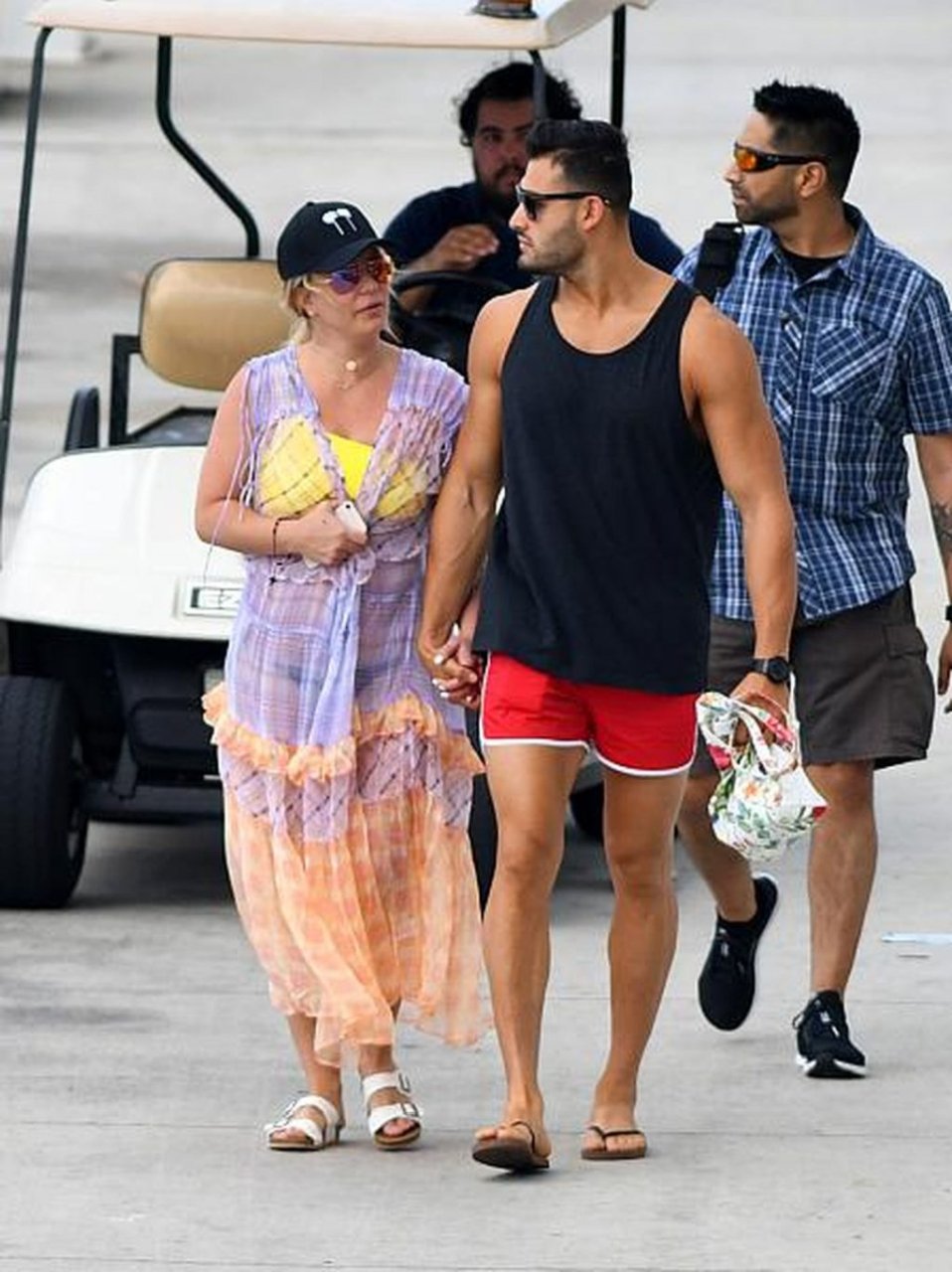 Britney Spears носит желтый бикини, проводя насыщенный событиями день на яхте с бойфрендом Сэмом Асгари в Майами, 06/08/2019.